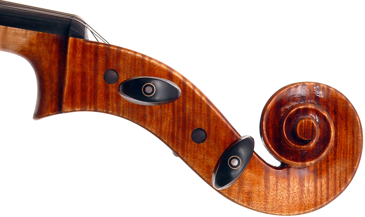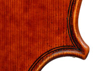 Secondly, the choice of materials is excellent and very attractive - the maple used for the two-piece back, ribs, neck and scroll has a very distinct flame with a narrow straight curl - truly beautiful with strong visual impact. The top is of very attractive tone spruce with fairly narrow to medium growth lines. Workmanship is highly refined throughout, evident in the cornerwork, the purfling and fine mitres, also in the beautifully carved scroll.