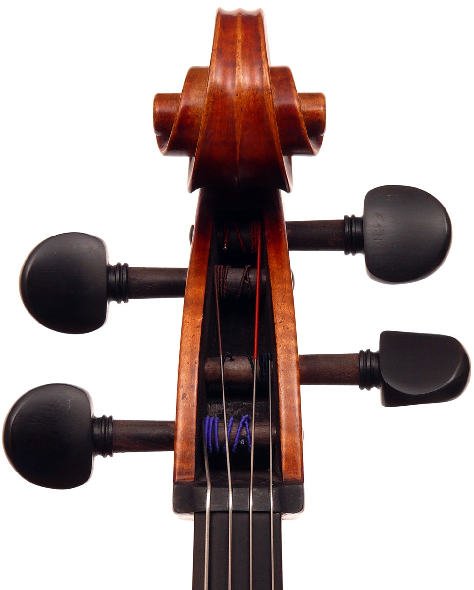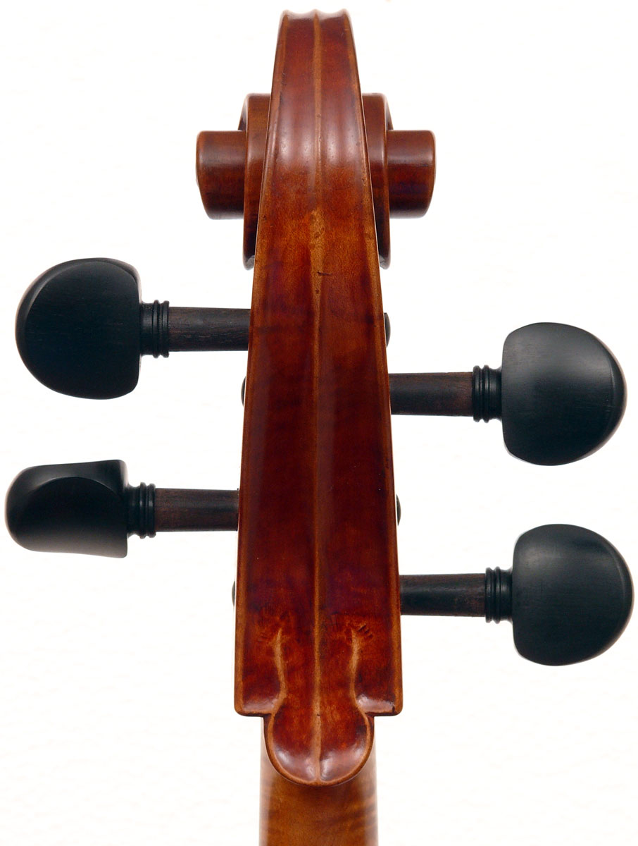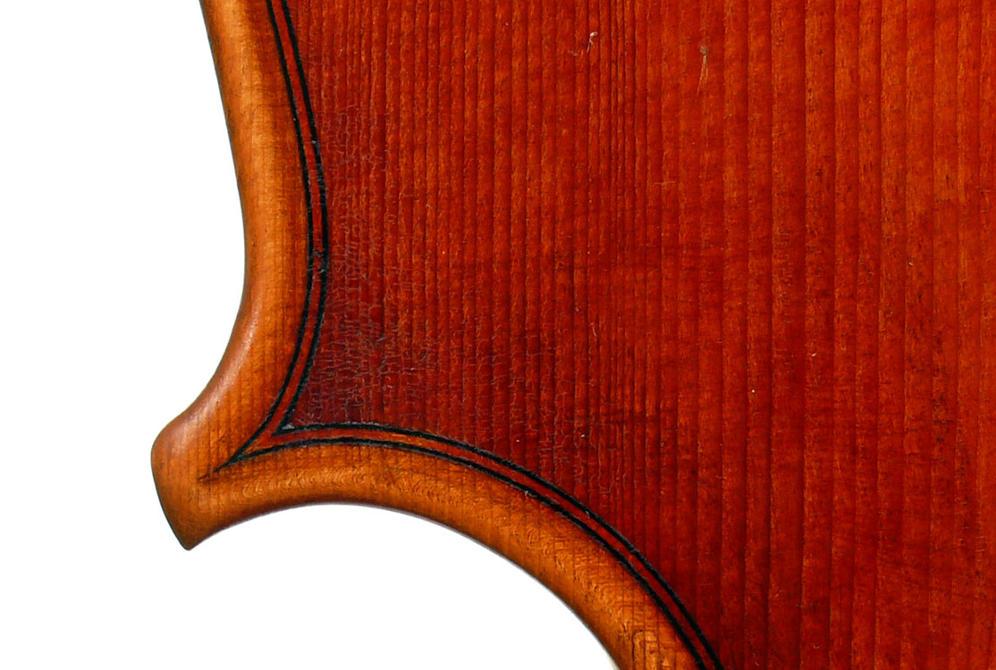 Close examination of this instrument shows remarkably tidy work with meticulous attention to detail - take a look at the photos and in particular the cornerwork which shows impeccable mitres and finish to the corner shape. The scroll is exceptionally balanced and elegant. Throughout this cello gives evidence of craftsmanship of a high order.