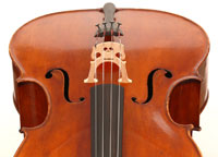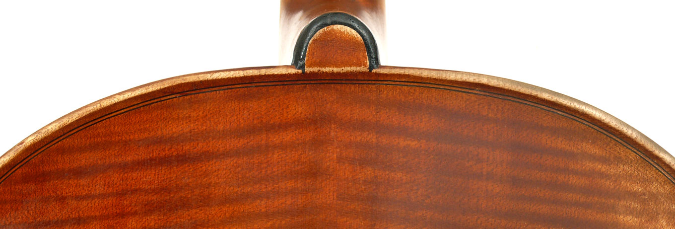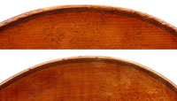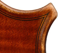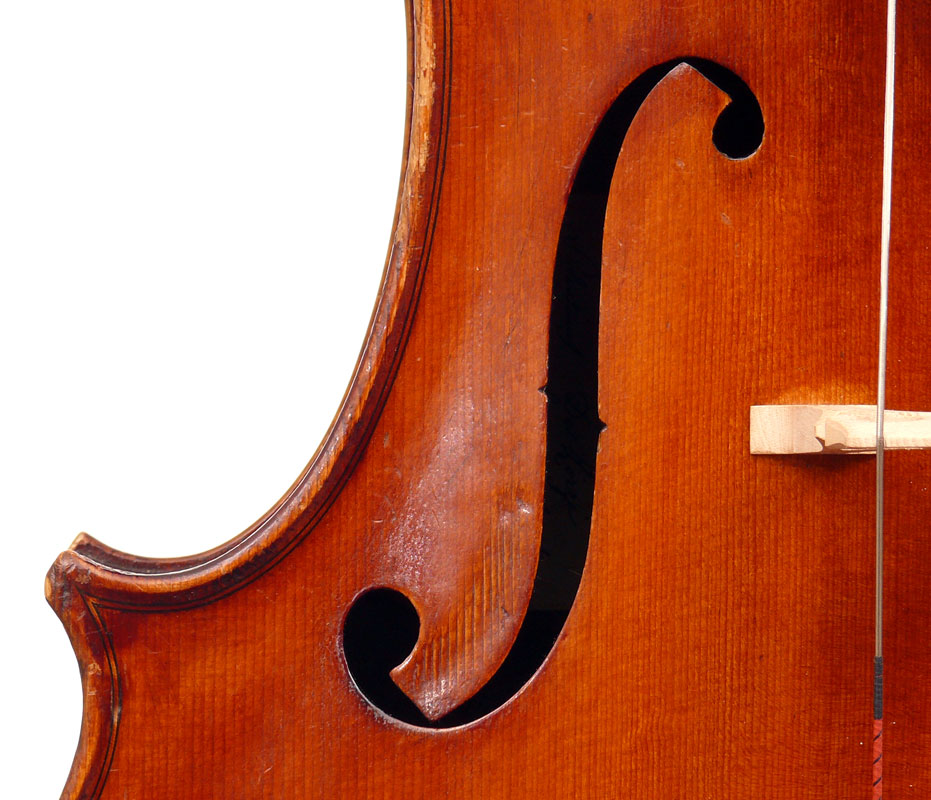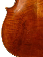 This cello is made of a fine selection of materials. The two-piece back, notably, is of nicely figured maple with some attractive and irregular curl. Throughout the workmanship is superb, attesting to an experienced and steady hand, particularly noticible in the tracing of the purfling, the tidy cornerwork with superb mitres. The Fs are somewhat elongated, slender and very elegant. It seems that someone (not the maker) tried to modify the fluting in the wings in this cello's early years.
