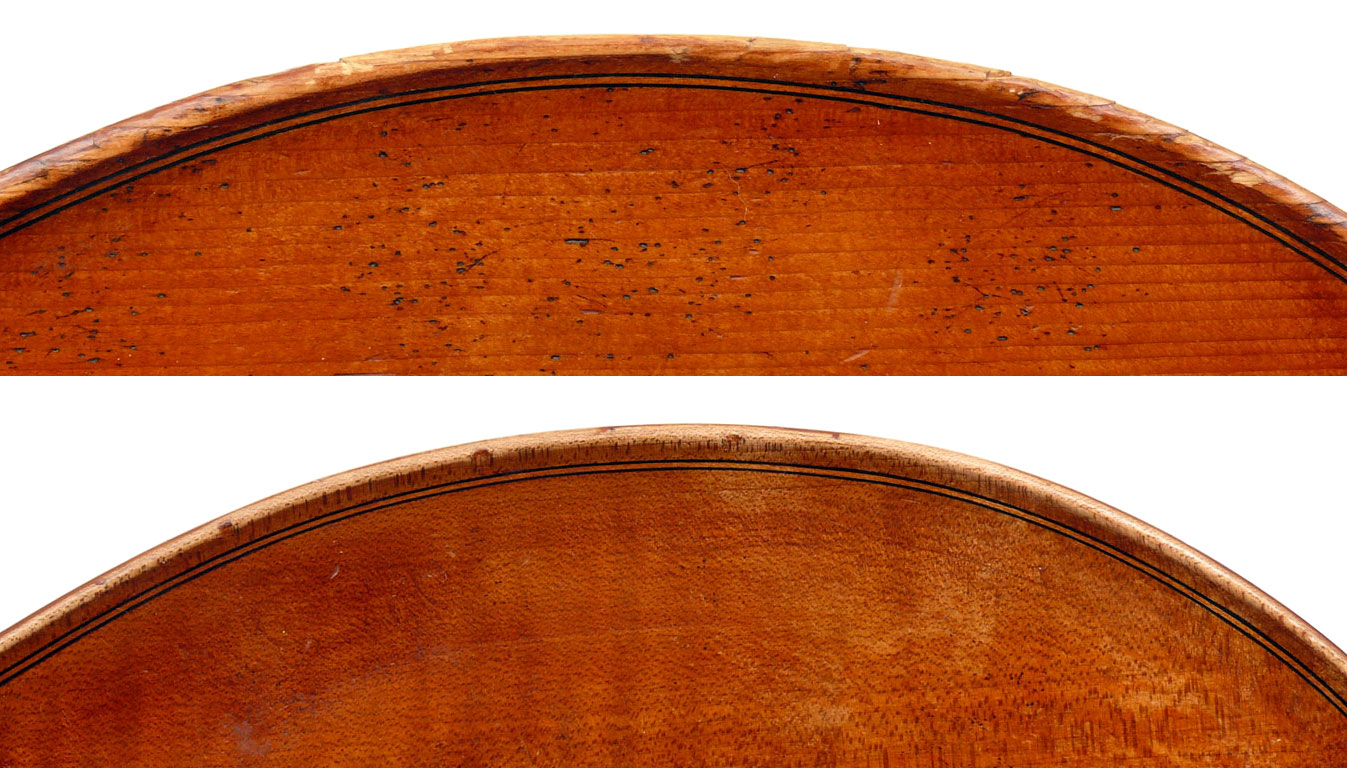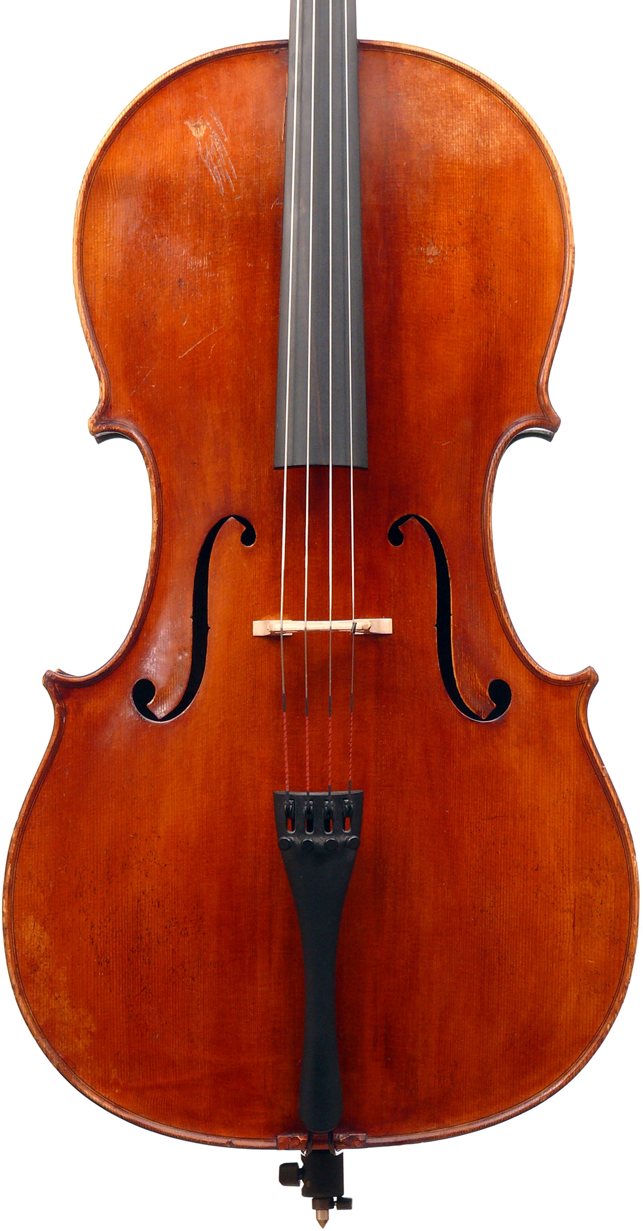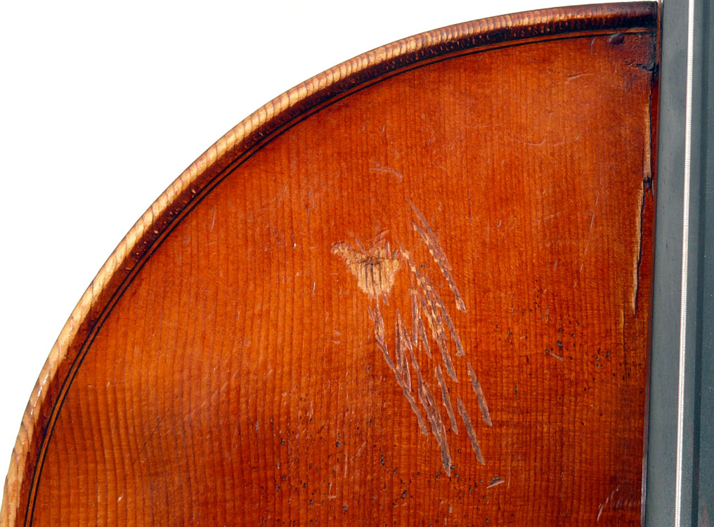 It would appear under scrutiny that this cello is a very good instrument which conforms to high standards in workmanship and tonal property. It should be noted that during the Second World War many string players in Nazi-occupied Europe removed the labels from their instruments to prevent them from being seized or looted by the Nazis - this was all the more so in the case of instruments by high-profile makers. The interior of this cello is considerably oxydized from age and one can discern in the back an area of non-matching discoloration in the normal position and size of a label - evidently where the original label had been fitted. It seems that the original label was carefully and deliberately removed.