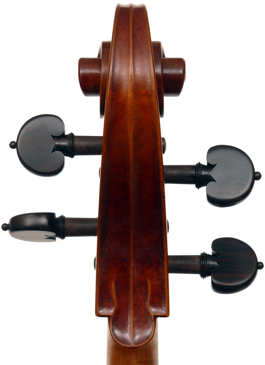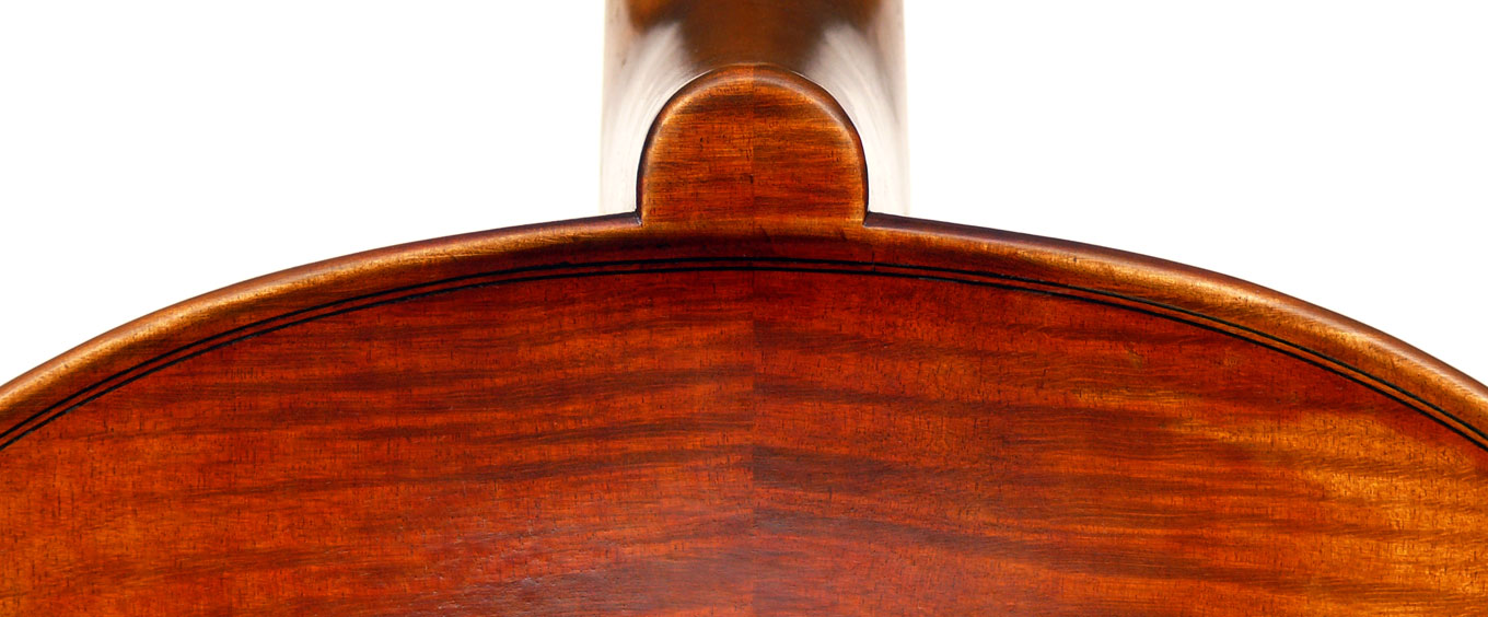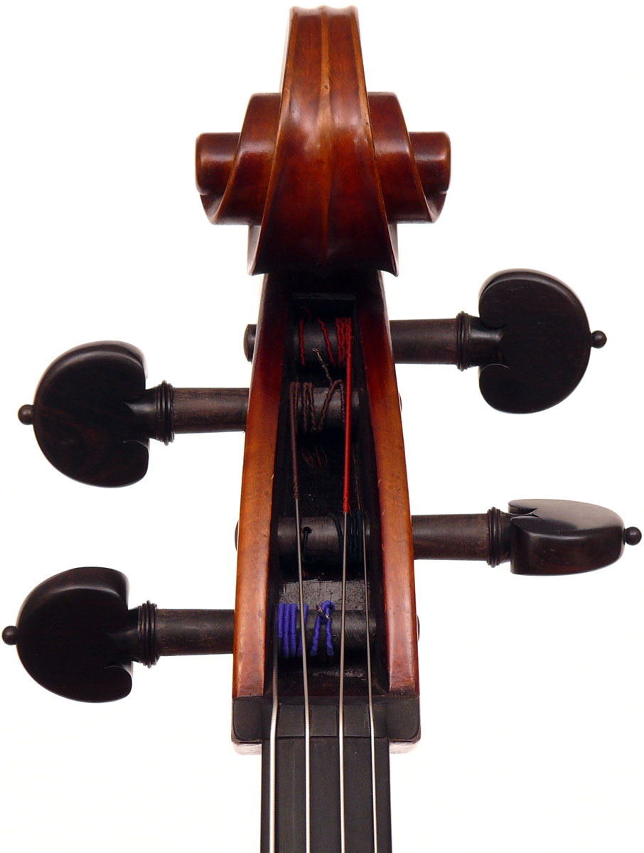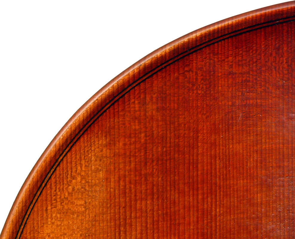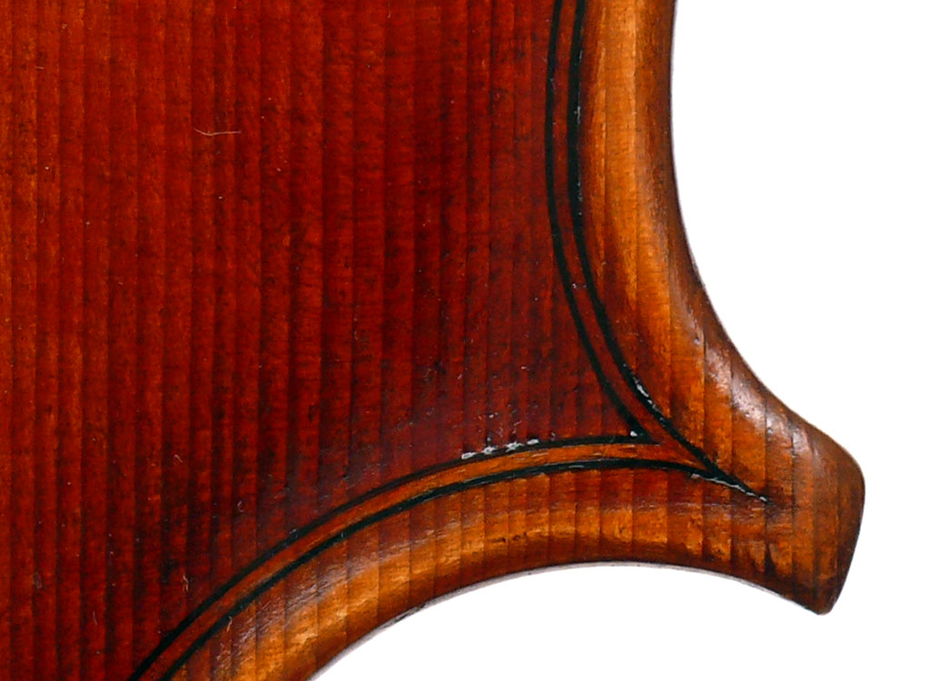 Close examination of this instrument shows remarkably tidy work with meticulous attention to detail - take a look at the photos and in particular the cornerwork which shows impeccable mitres and finish to the corner shape. The scroll is exceptionally balanced and elegant. Throughout this cello gives evidence of craftsmanship of a high order.
