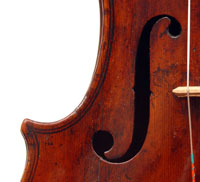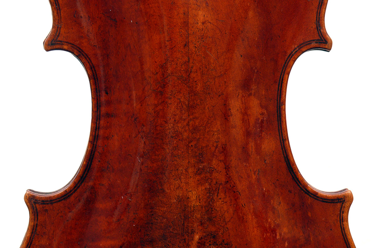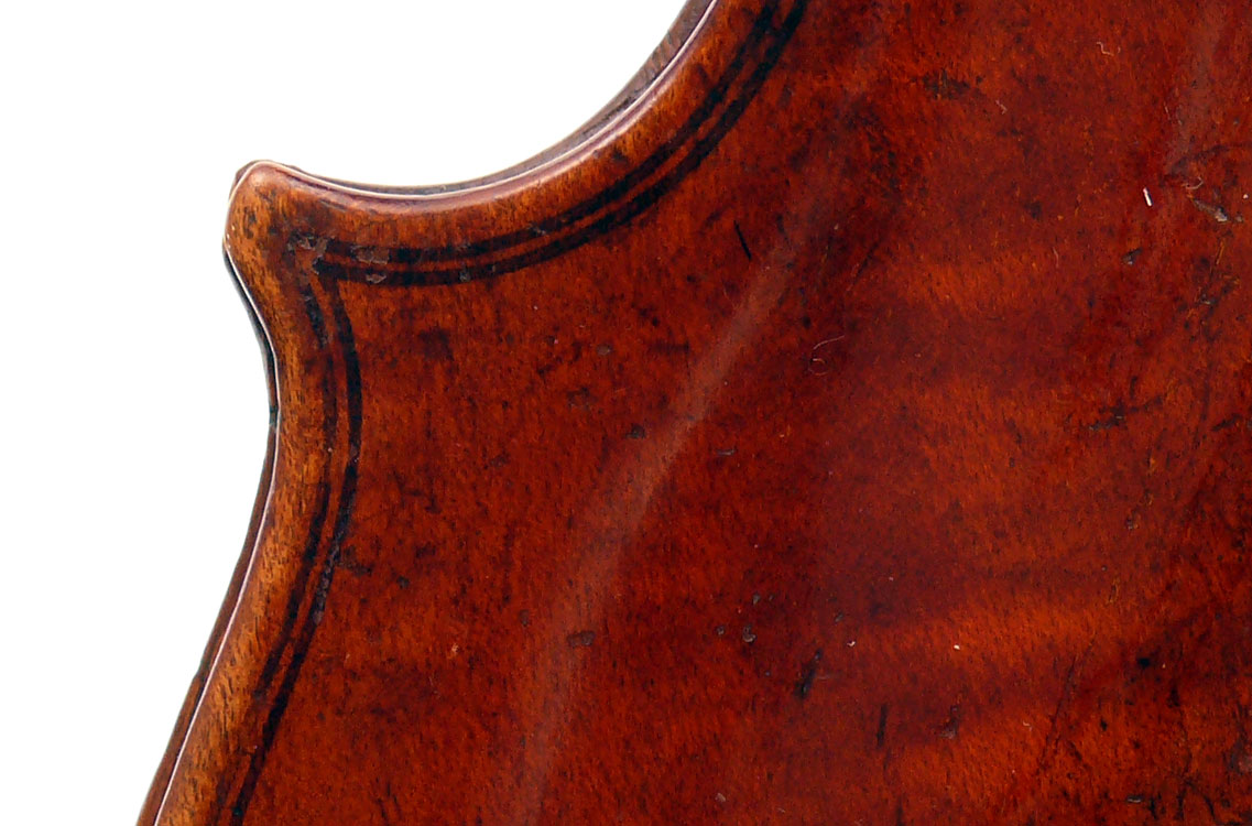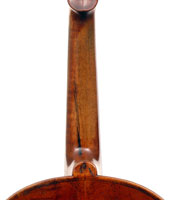 One is struck by this violin's beautiful color - a rich brown with a tinge of red, all original. The arching is full and beautifully graded. The Fs are nicely positioned and balanced. A peculiarity is that the top is from one piece of spruce, as is the entire lower rib from corner to corner. The purfling is painted in - something often encountered in English violins from that period.
