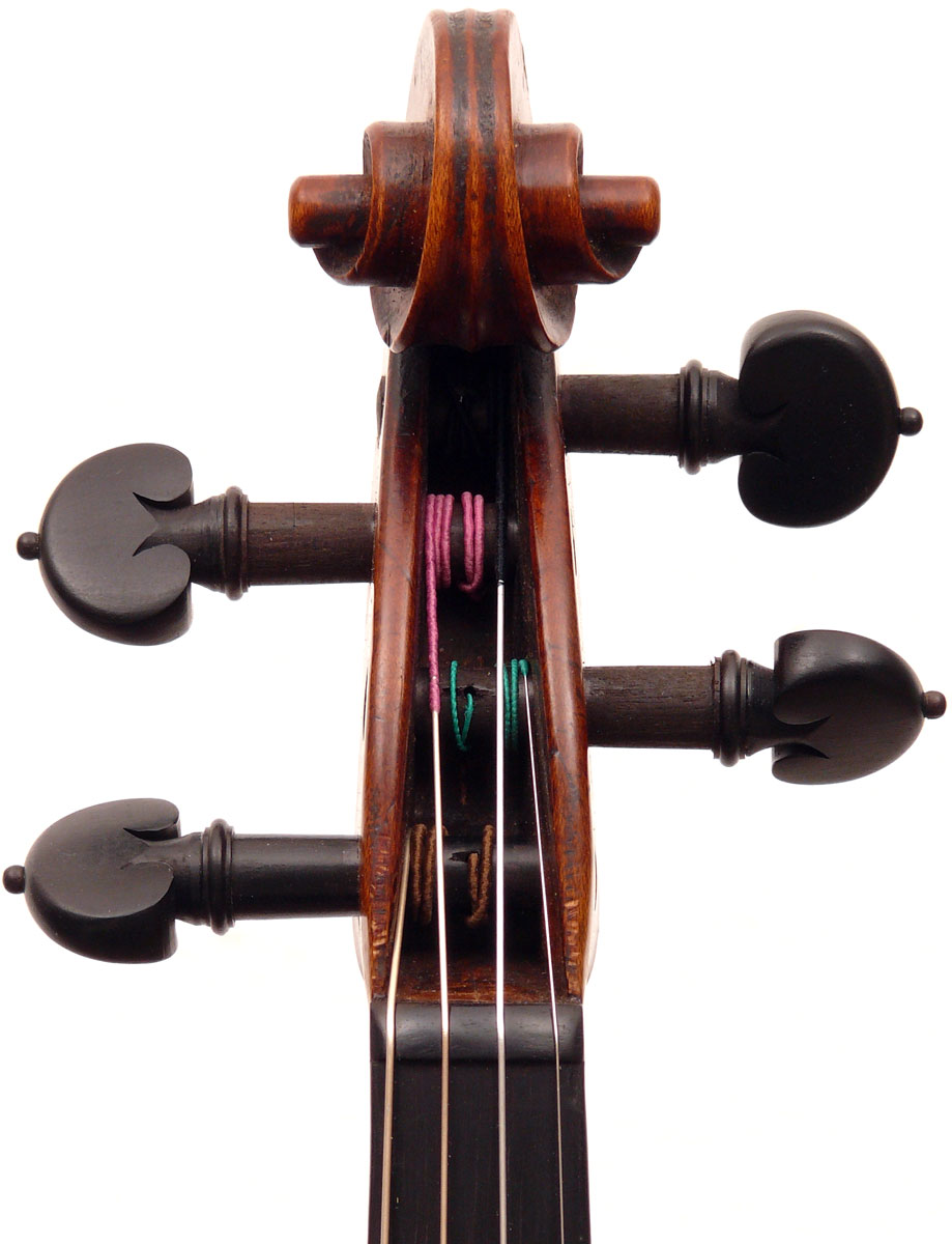 The scroll in this violin is highly individualistic, really elegant, balanced and refined, and is very reminiscent of the work of Richard Duke. It certainly is quite unlike the more perfunctory scrolls often seen in studio work. It may eventually assist in identification of the maker.