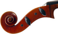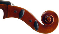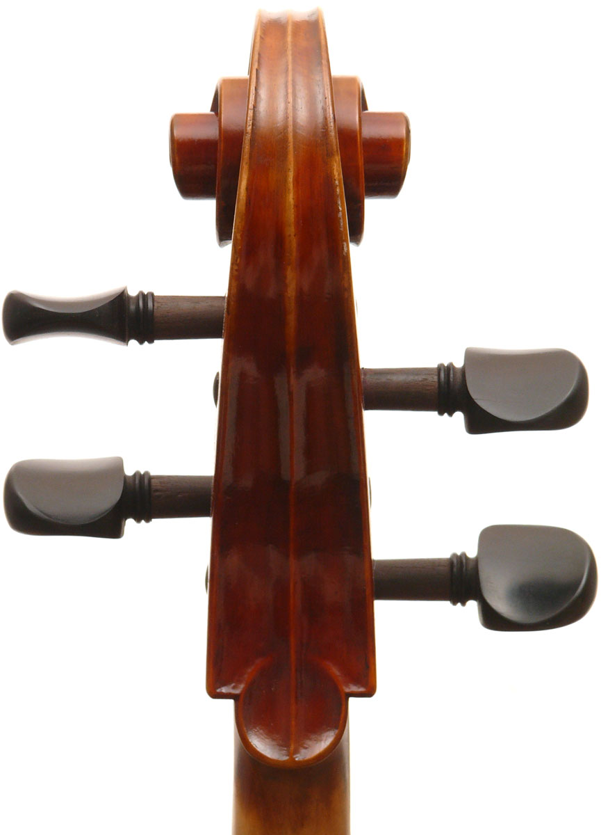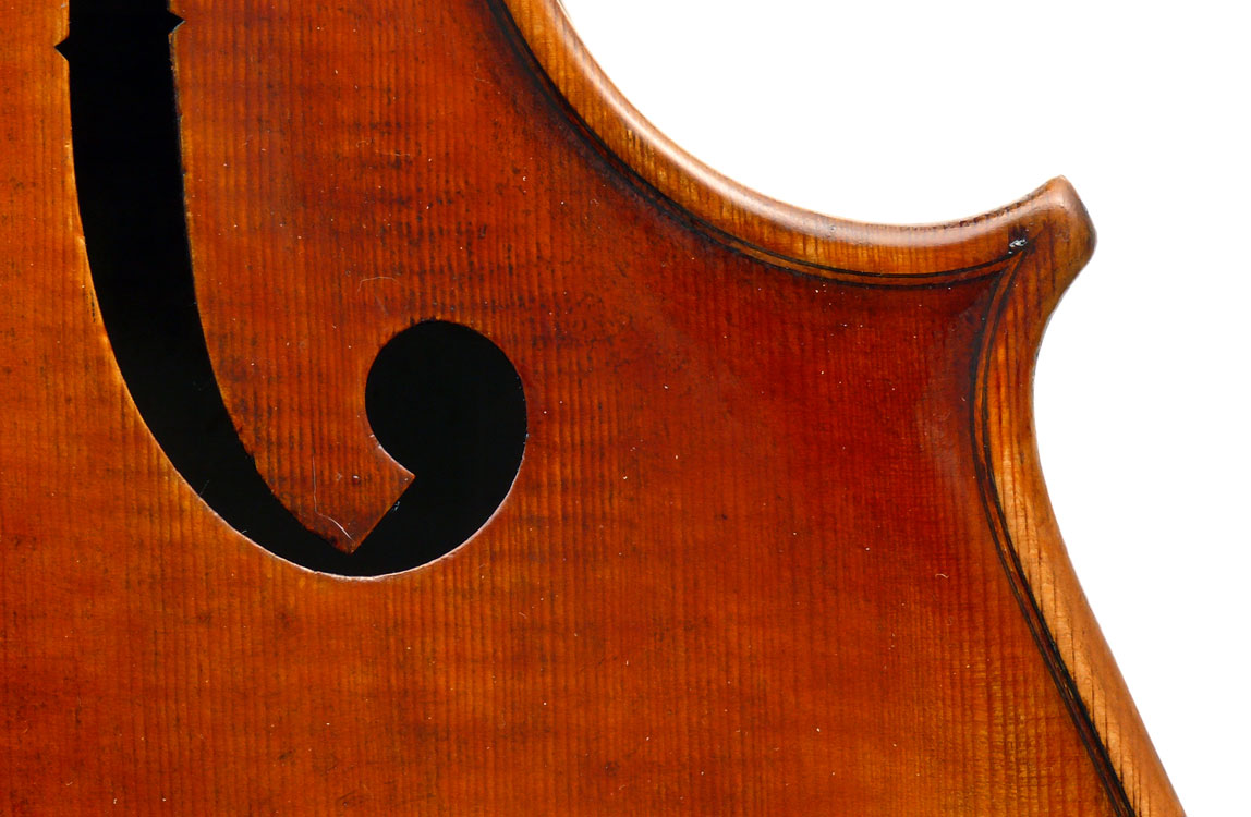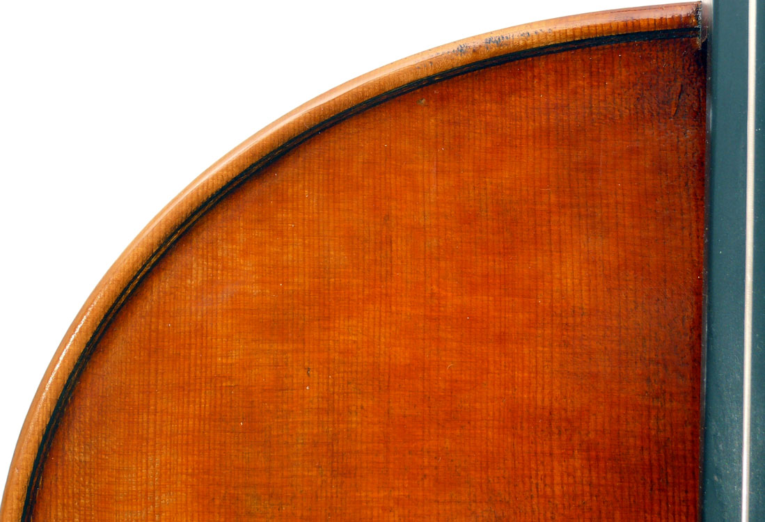 Close examination of this instrument shows remarkably tidy work with meticulous attention to detail - take a look at the photos and in particular the cornerwork which shows impeccable mitres and finish to the corner shape. The scroll is exceptionally balanced and elegant. Throughout this cello gives evidence of craftsmanship of a high order.