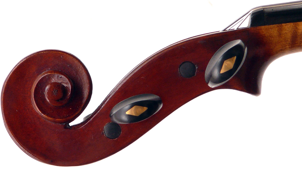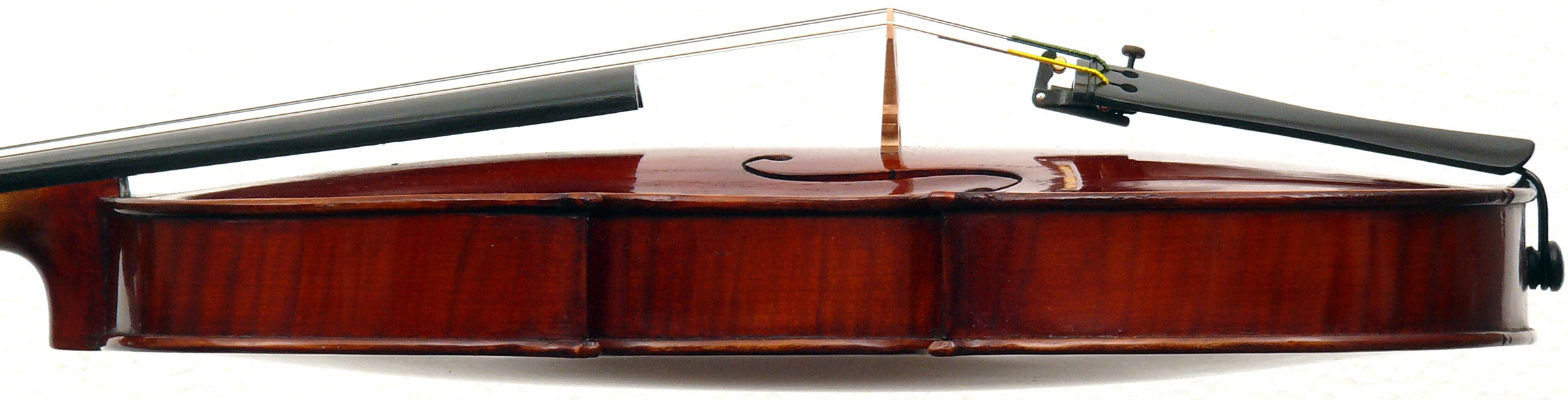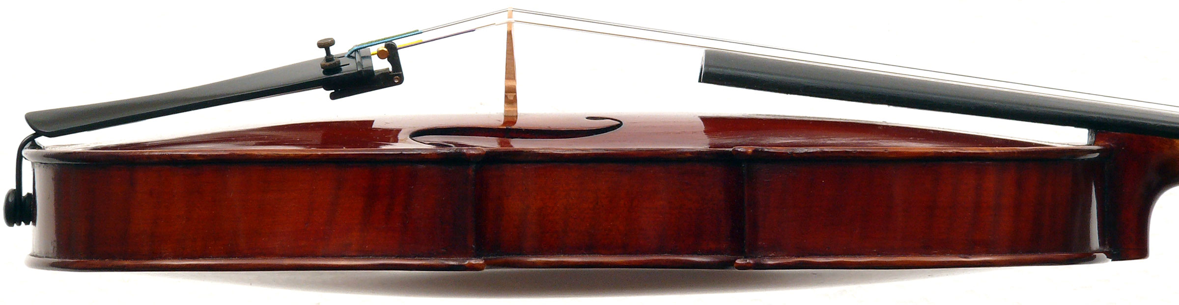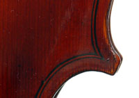 After 102 years this violin is still in impeccable condition, as if made yesterday. One is struck by the very attractive wine-red varnish, reminiscent of French preferences, and by the tidy workmanship throughout, notably crisp and sharp workmanship in the Fs with nicely fluted palettes.