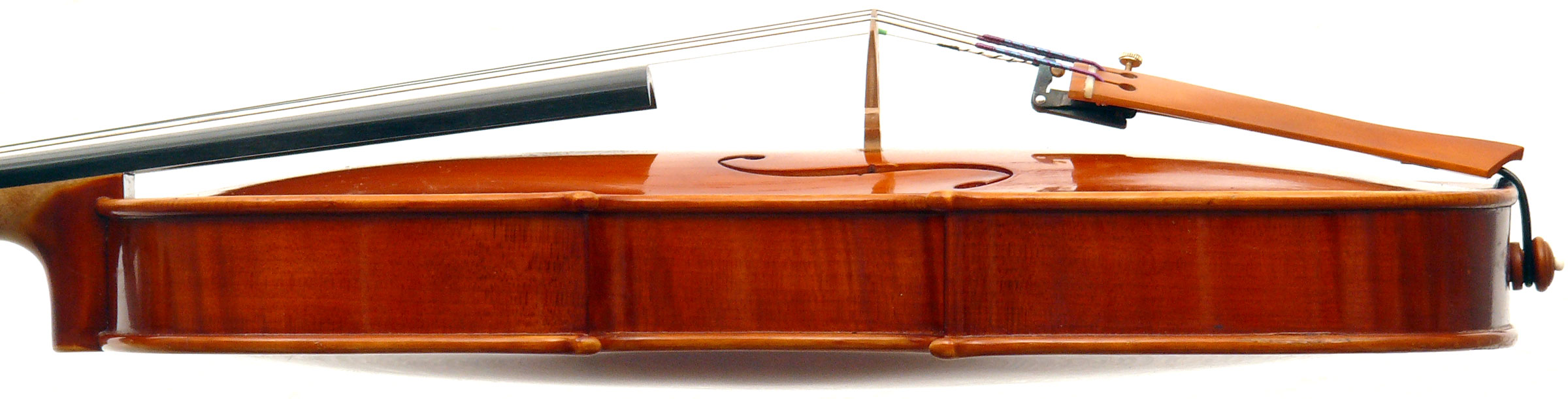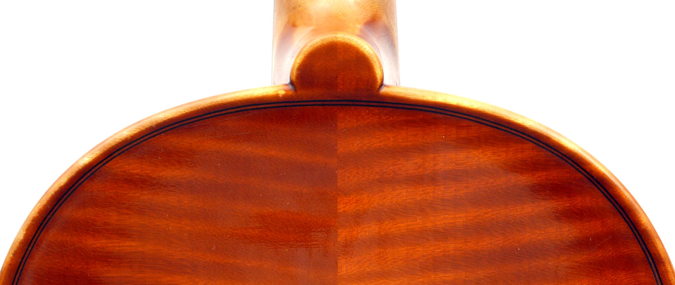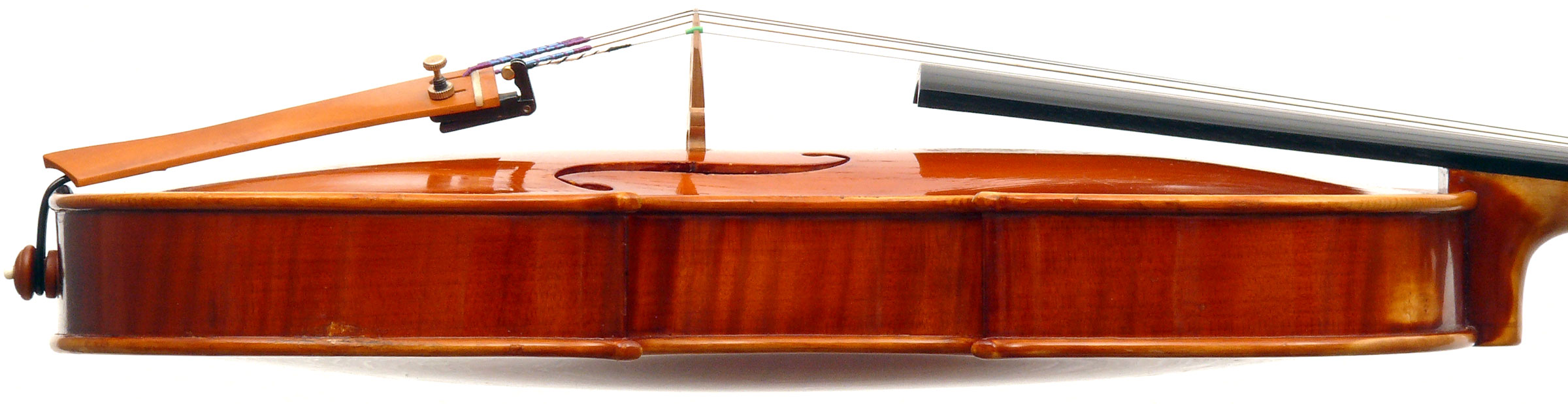Overall this violin is characteristic of this maker's work, which generally has a bold and solid appearance in outline. Likewise, the scroll, albeit accurately and balanced in execution and extremely nicely cut, has a strong and masculin feel to it. The materials are appealing - a fine maple of medium curl and distinct figure is used for the two-piece back and is combined with good tone spruce in the top. In the back the curl slopes downward from the flanks to the center line. The sides, neck and scroll are less flamed. The oil varnish is a superb amber-brown colour and very translucent, complimenting the materials well.