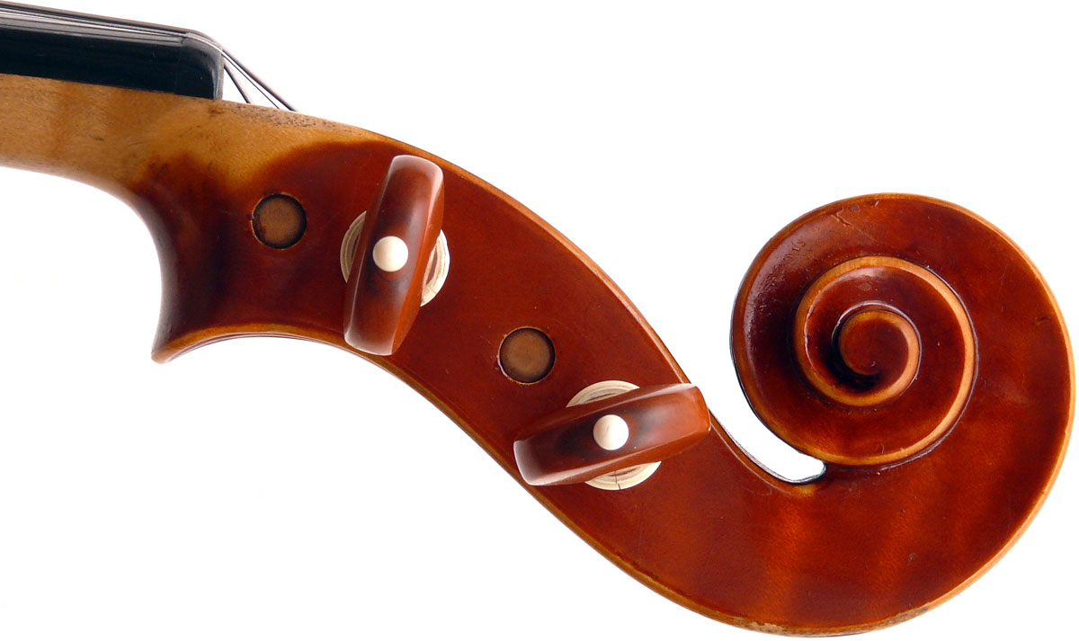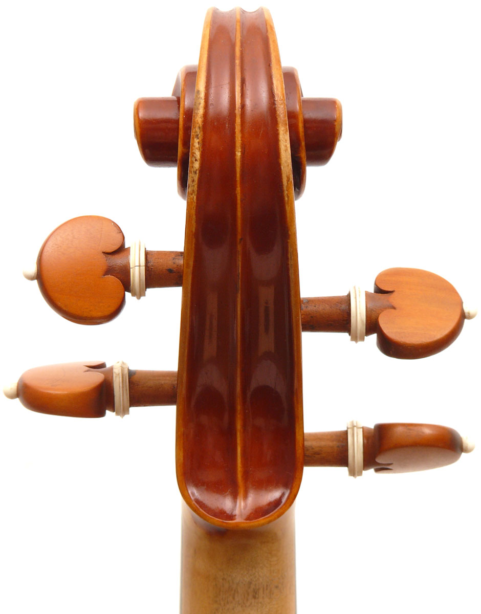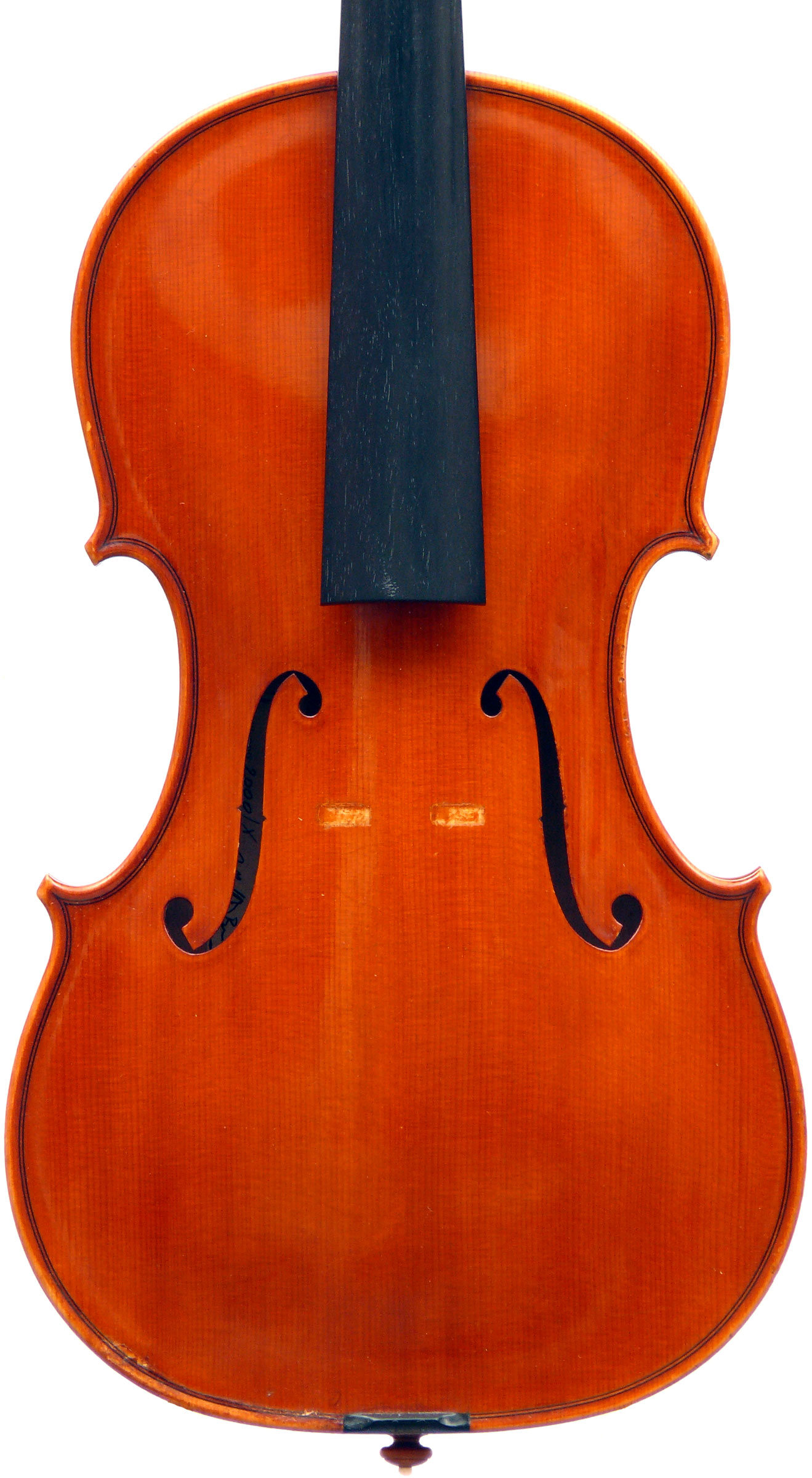 Overall this violin is characteristic of this maker's work, which generally has a bold and solid appearance in outline. Likewise, the scroll, albeit accurately and balanced in execution and extremely nicely cut, has a strong and masculin feel to it. The materials are appealing - a fine maple of medium curl and distinct figure is used for the two-piece back and is combined with good tone spruce in the top. In the back the curl slopes downward from the flanks to the center line. The sides, neck and scroll are less flamed. The oil varnish is a superb amber-brown colour and very translucent, complimenting the materials well.