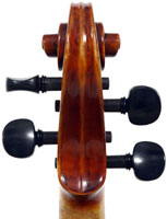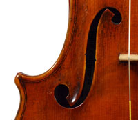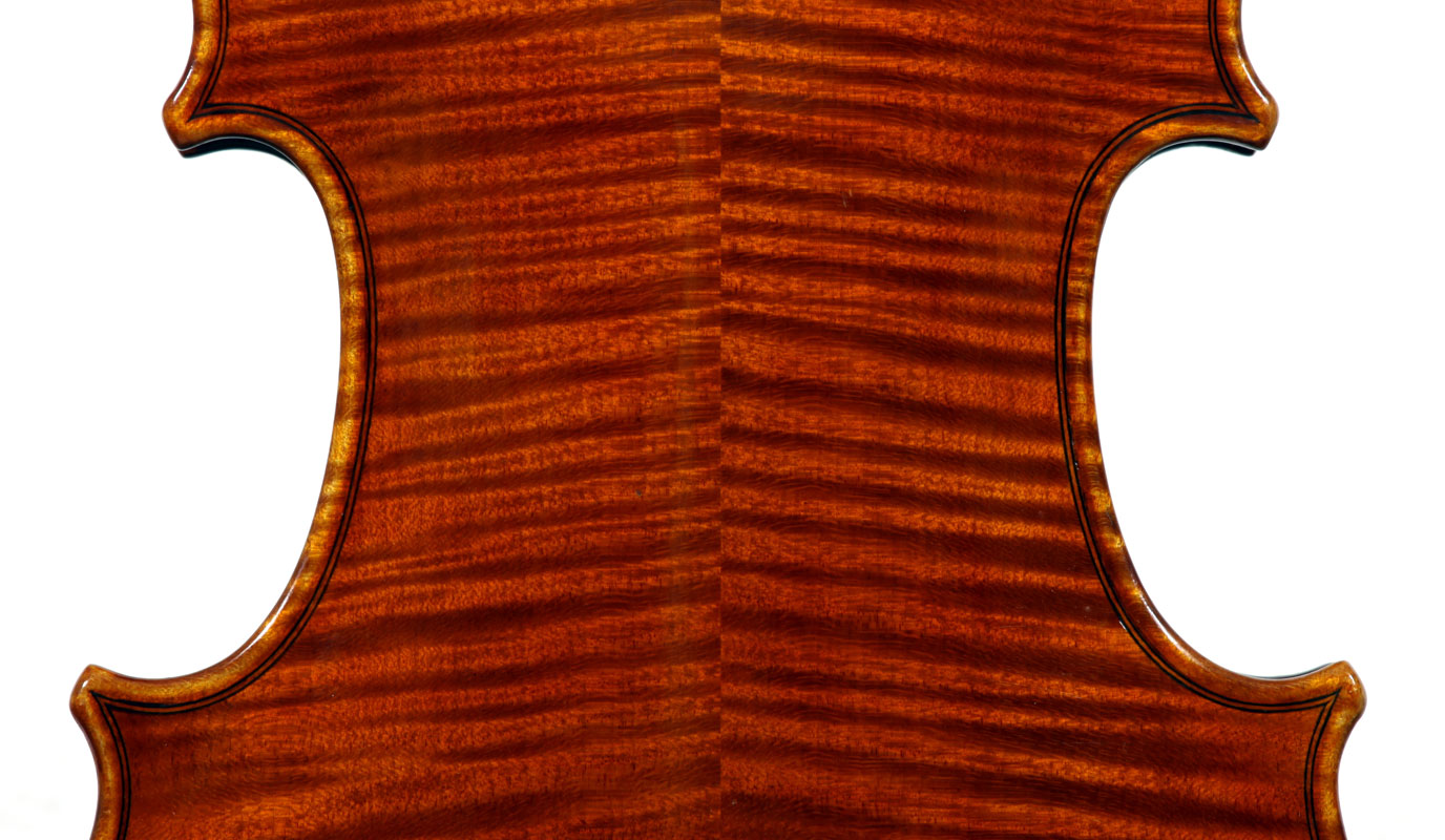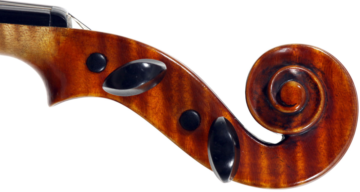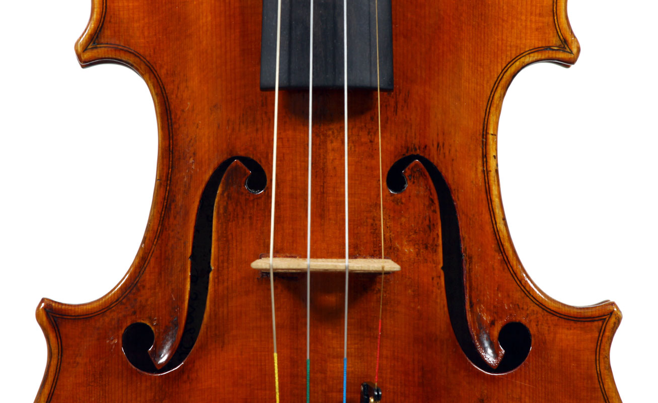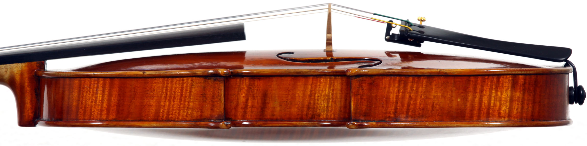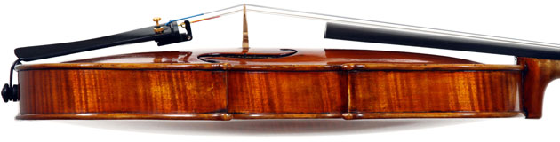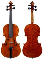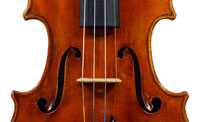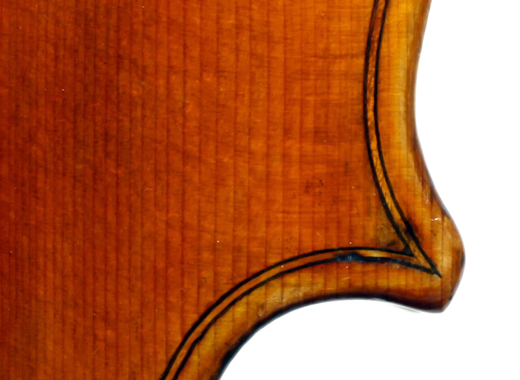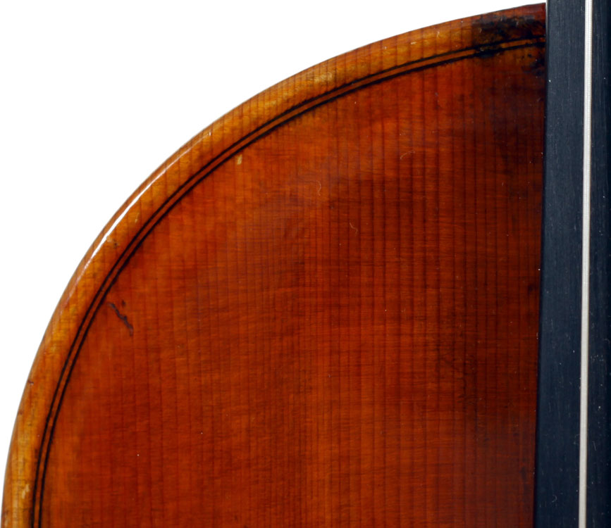 It is a very attractive instrument visually, with a well-flamed two-piece back of medium curled maple with a distinct figure, also used for the ribs, neck and scroll. The top is of good tone spruce with medium to narrow growth lines. The f-hole wings are deeply fluted - much a characteristic of this maker's work. The purfling and cornerwork are tidy, showing an experienced and steady hand. The scroll is bold and well-balanced, yet very elegant in profile. This violin has a beautiful reddish-brown amber colored varnish of high transparency and great suppleness, no doubt contributing to this instrument's rich tonal response. Although clearly showing signs of use, this violin throughout is in impeccable condition without cracks or repairs.