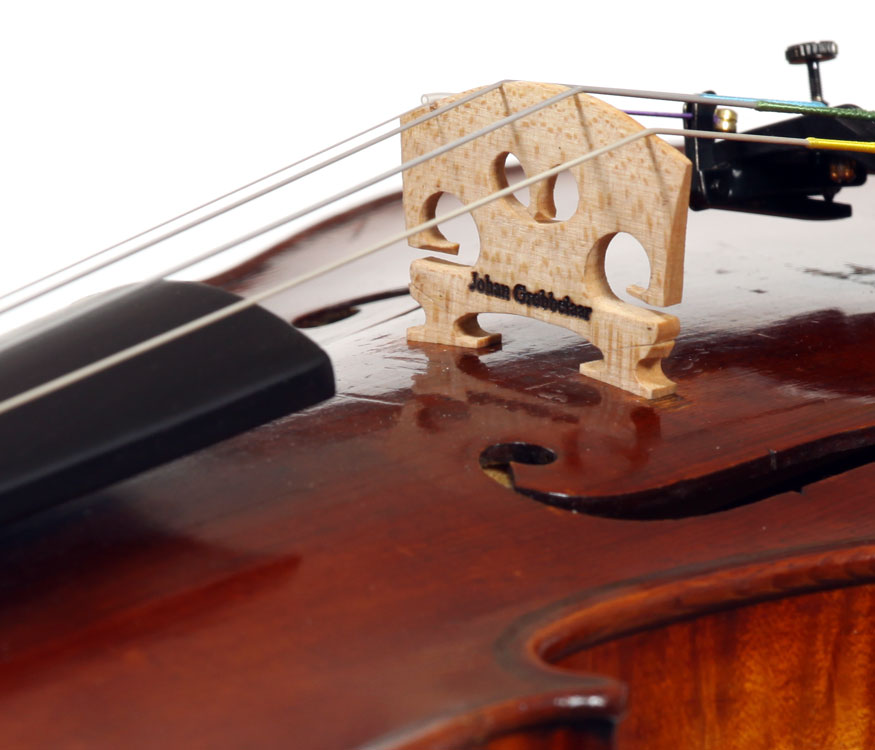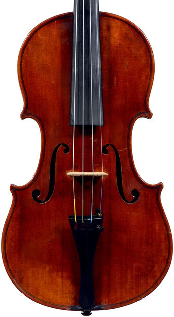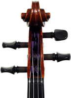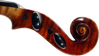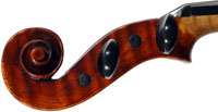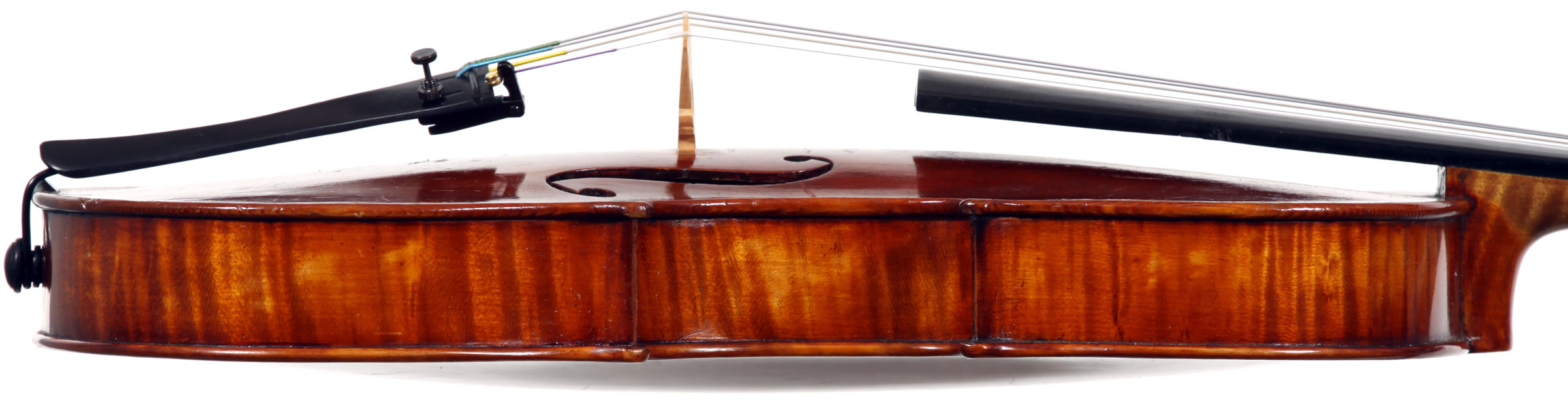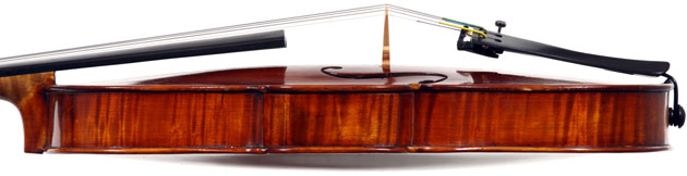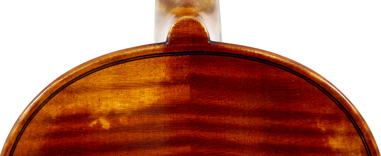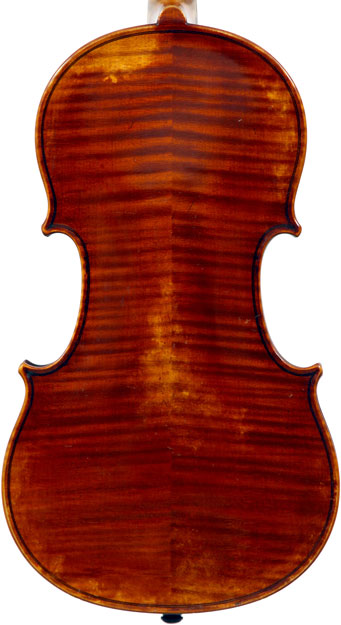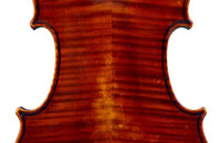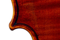 This violin is well-toned - strong, clear and responsive and speaks with ease. Materials throughout are attractive and the reddish-brown varnish is very transparent, showing off the wood nicely. The top is of an unusually finely grained tone spruce. The two-piece back and ribs are of nicely figured maple with a broad curl. Workmanship throughout is clean and steady.