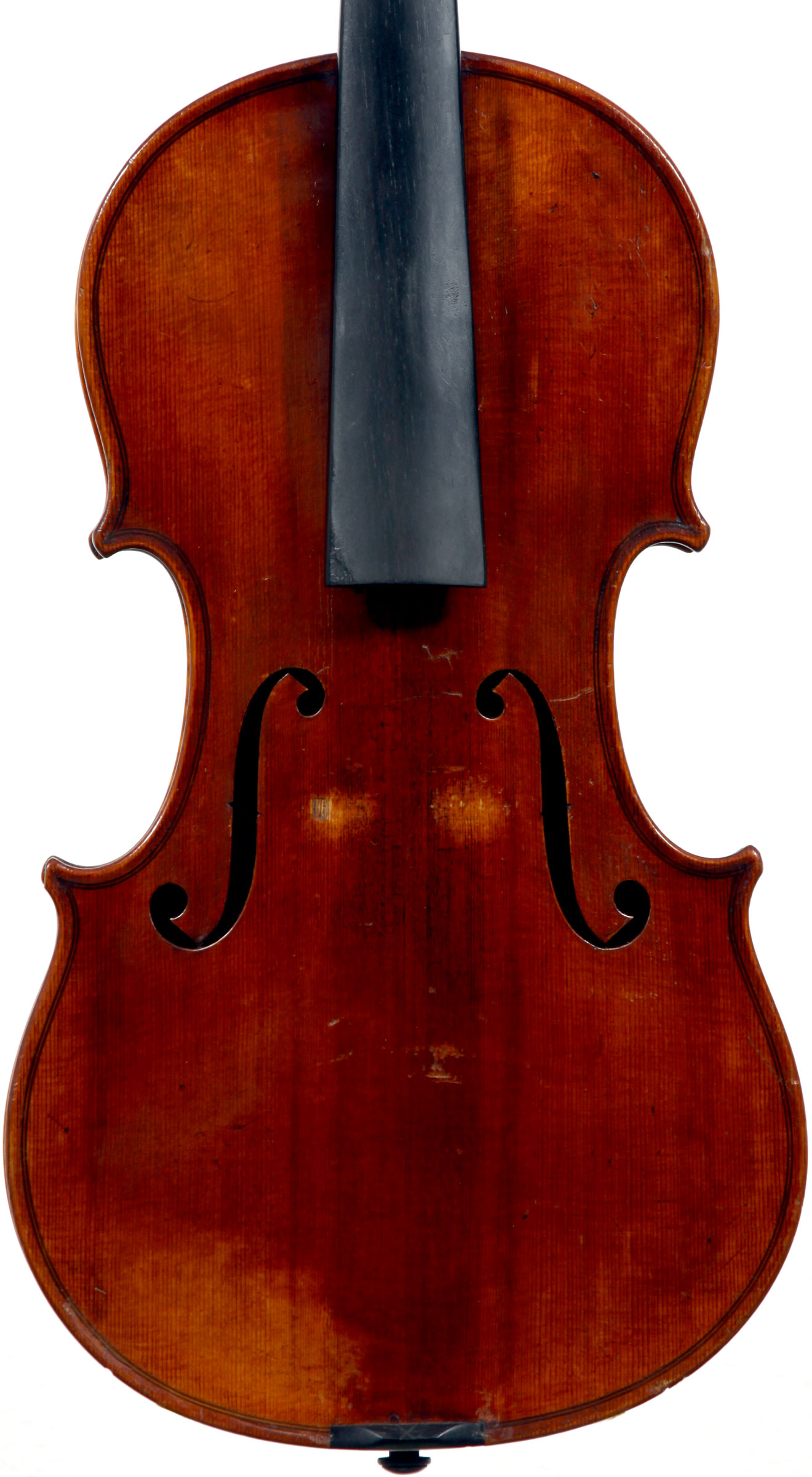 Identifying this unlabelled violin as being of French origin is easy in itself, but establishing its authorship is more complex. A calculated guess would date it to the very late 19th century. The main Mirecourt studios in those days were those of Jérôme Thibouville-Lamy ('JTL'), Marc Laberte, Laberte-Magnié, Justin Derazey, the Bernardel enterprise, to mention just a few. This doesn't look like JTL work, but attributing it to another studio is not simple as they all worked along the same lines and subscribed to the same perspectives and guidelines of French lutherie.