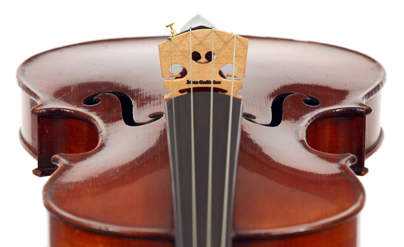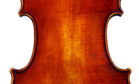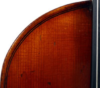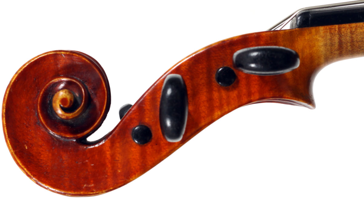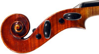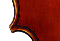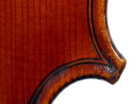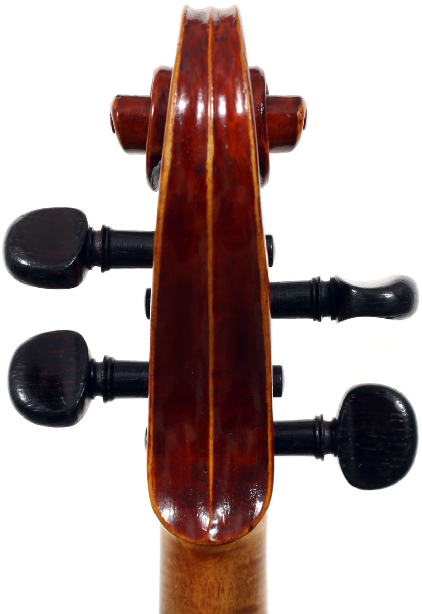 Although unlabelled, its French roots are apparent in the arching, cornerwork and varnish and also in the selection of materials. The top is of fairly open-grained spruce, often preferred by some Mirecourt makers. The attractive one-piece back and sides are of mildly figured maple with a faint curl. The varnish is a strong red-brown over a yellow ground which shows prominently and attractively where the varnish is worn - notably in the back. Workmanship is steady throughout.