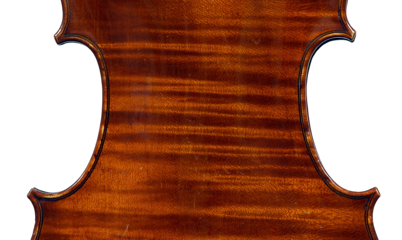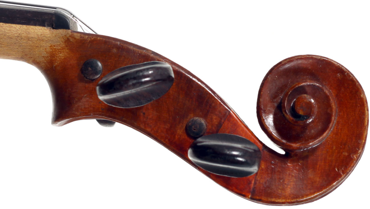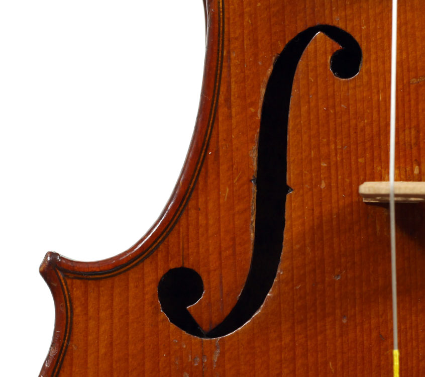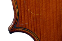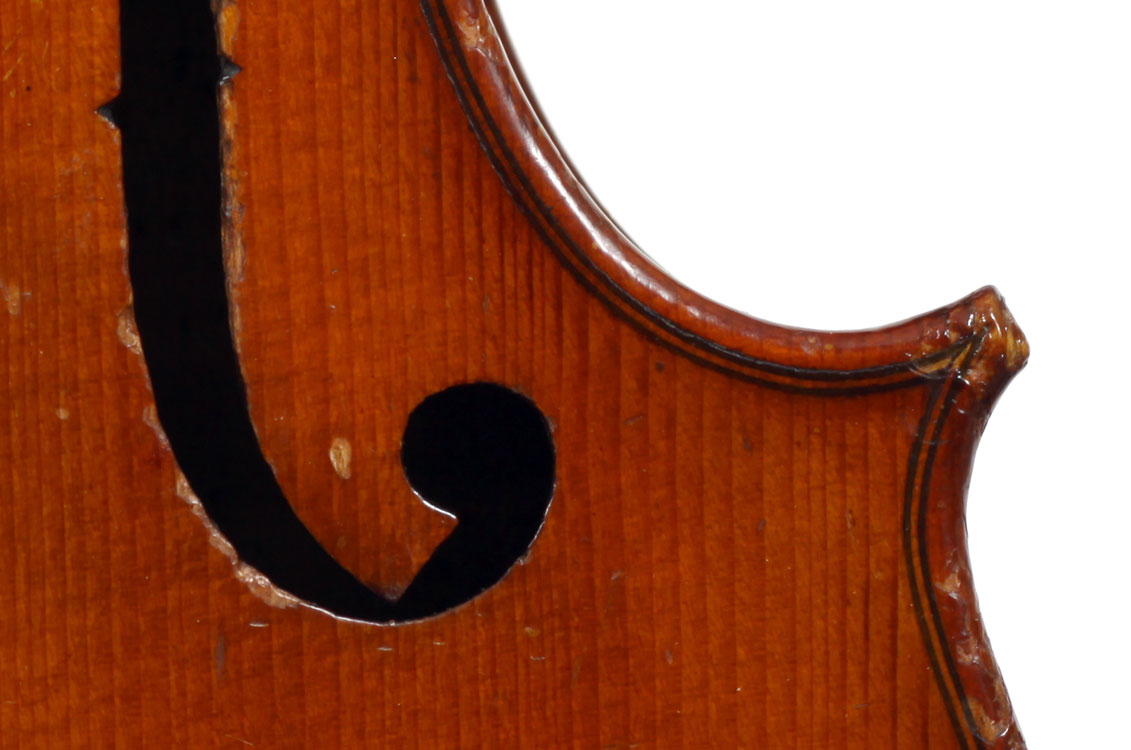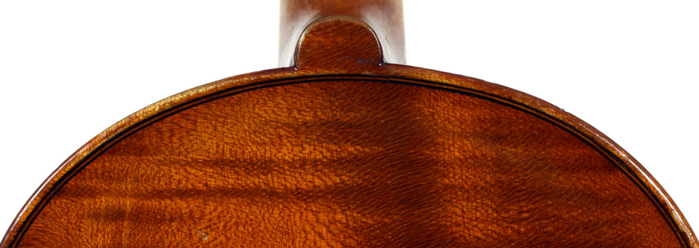 The first thing that strikes one visually is the beautiful nicely flamed one-piece back with a distinct and interesting irregular curl, repeated in the ribs. The top is of unusually open-grained tone spruce unmatched in the two halves. The golden-brown spirit varnish has some age-related character marks, typical in older instruments, but these have no structural implications. This violin is correctly blocked and lined inside with a fitted bass bar, nicely executed and which no doubt contributes to its tonal properties which are immediately apparent when playing it.