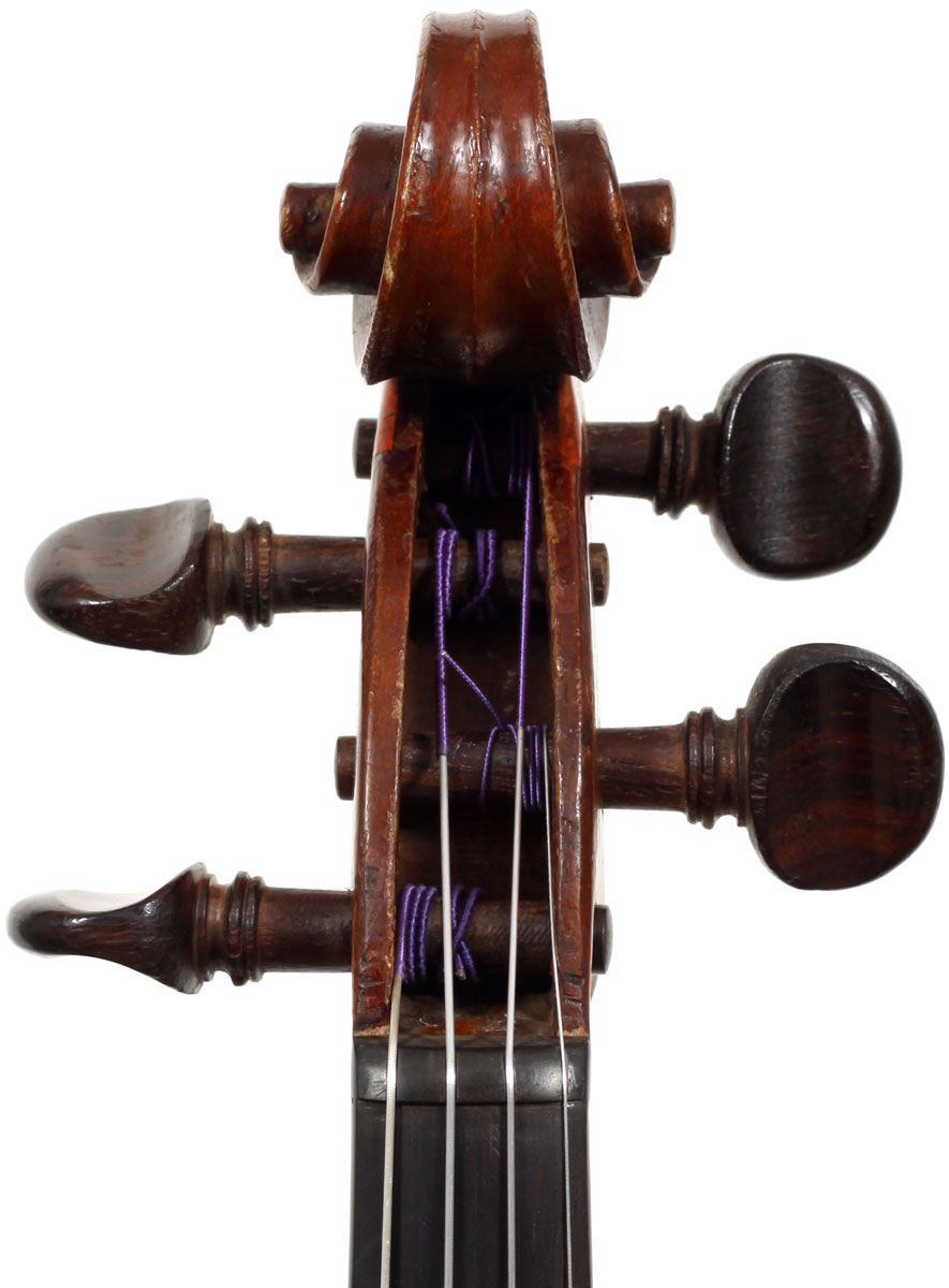 The initial impression was that this is a German violin, but at a closer look much about it is not typically German - the arching, corners, selection of materials, varnish and specifically the back length of 360 mm could be pointers to Mirecourt tendencies around the turn of the 19th century, which is also the estimate of its making. However, this is speculative and strictly speaking its origin remains unknown.