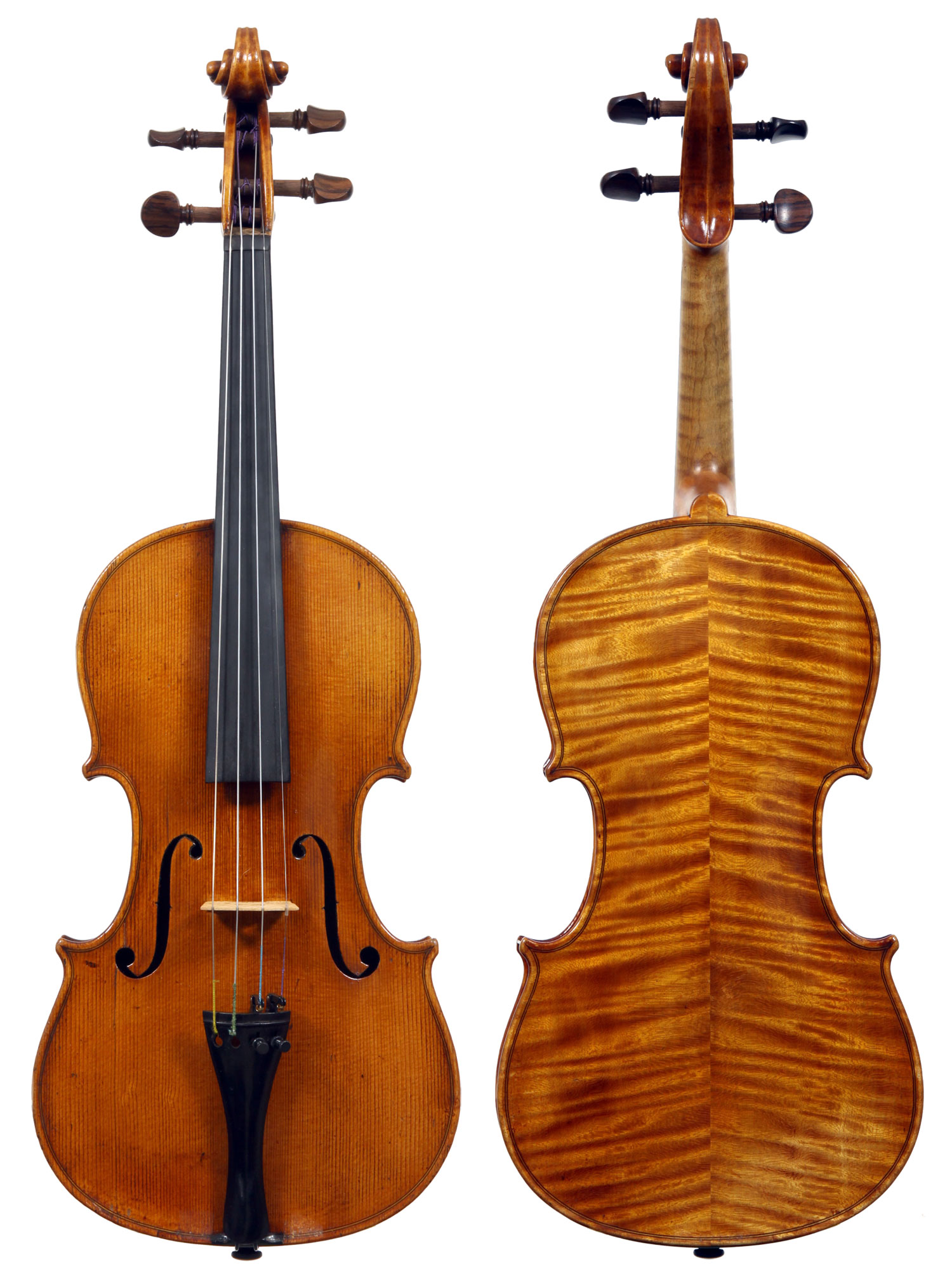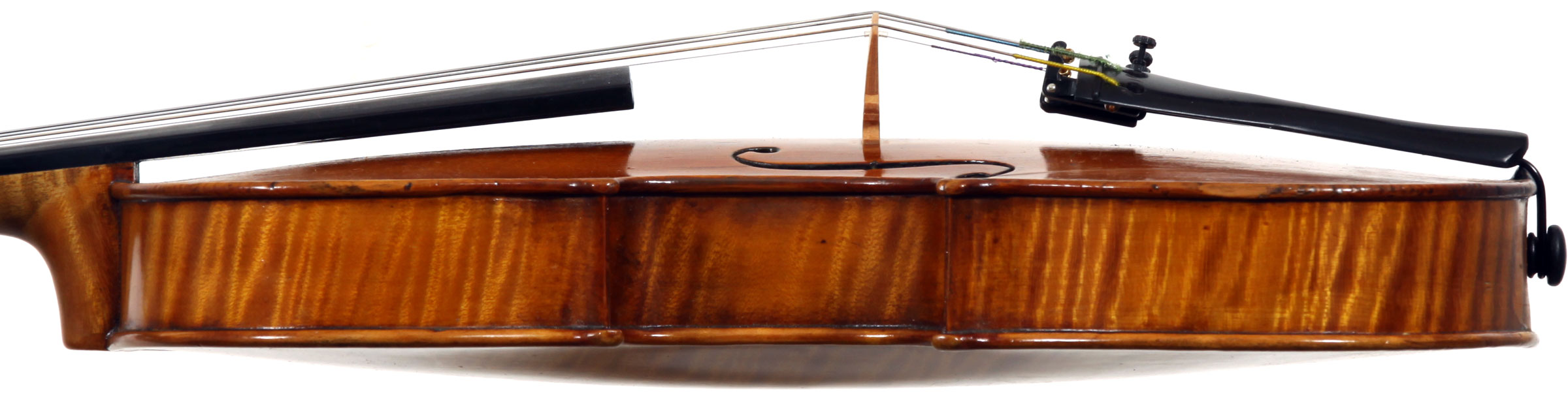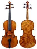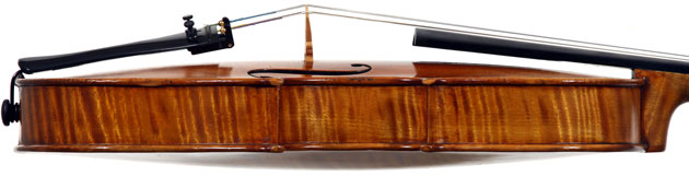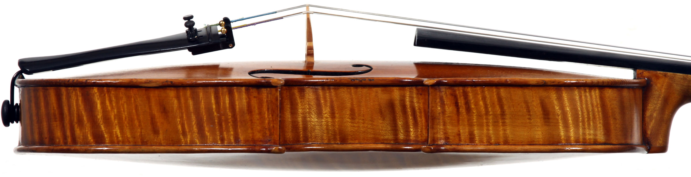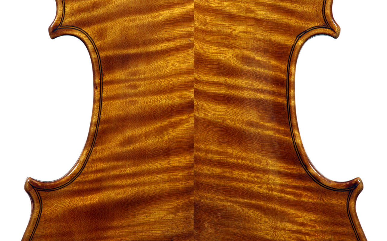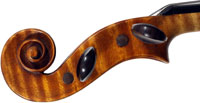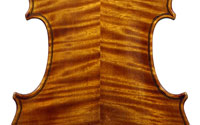 The selection of materials used for this violin shows discernment - the back and sides are of a maple with spectacular flame of medium to broad curl. The neck and scroll are less flamed but nevertheless very attractive. The top is of superb tone spruce with very even medium growth lines. The light golden-brown varnish is of high transparency allowing clear observation of the woods. Workmanship throughout is excellent, notably in the purfling and mitres. The scroll and Fs are balanced elegant adding to the overall appeal of a really attractive instrument.