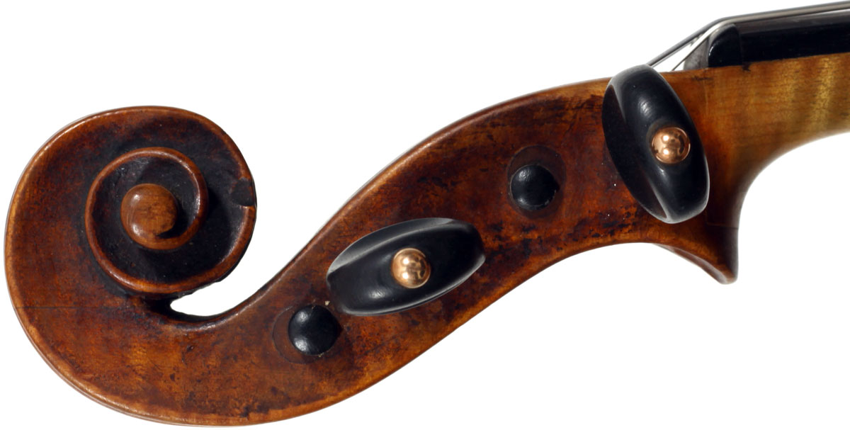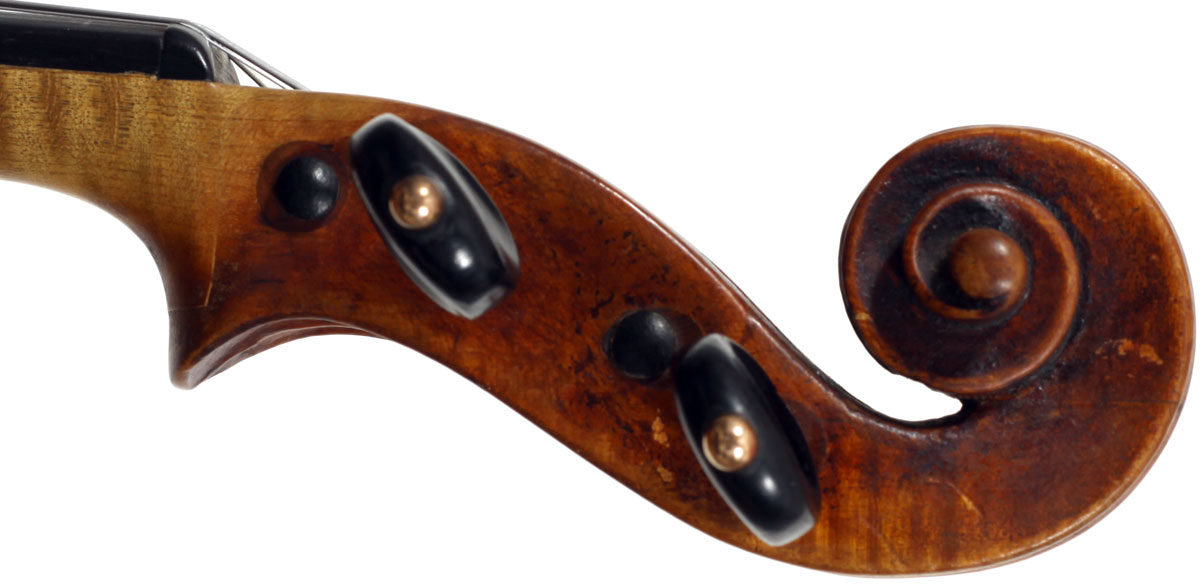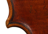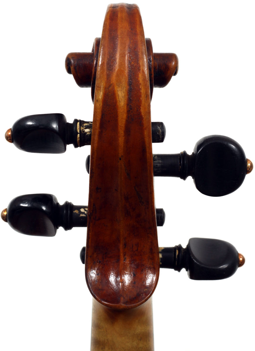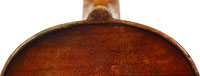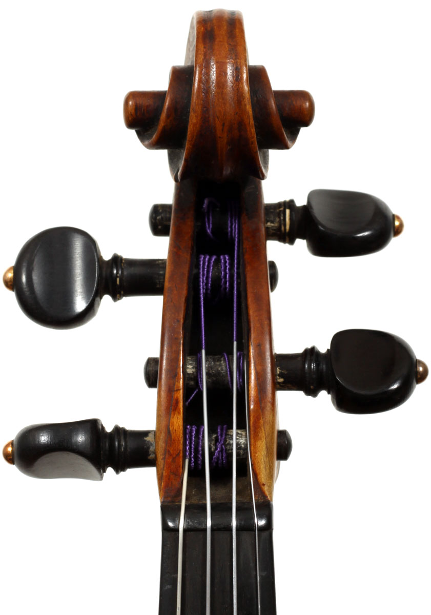 François Caussin l'ainé, (1794-1866) studied in Mirecourt under Charles Gaillard and established his own workshop in Rouvres-la-Chétive in 1815, where he remained active until 1865. He was a skilled copyist and understood the commercial advantages to be gained from copying and faking the work of the old masters. In his copies he went to the extent of selecting typical wood used by those makers. In the case of this violin, which is labelled Francesco Ruggieri, 1671 he selected a top of very finely grained tone spruce. The back is in one piece. The arching is quite deep, the purfling superb and the scroll elegant. The golden-brown varnish was antiqued considerably, particularly in the back, using the identical techniques seen in Caussin's other instruments. (Note that the pegs have been replaced since the photos were taken - the original golden caps were retrieved and fitted back into the new pegs.)