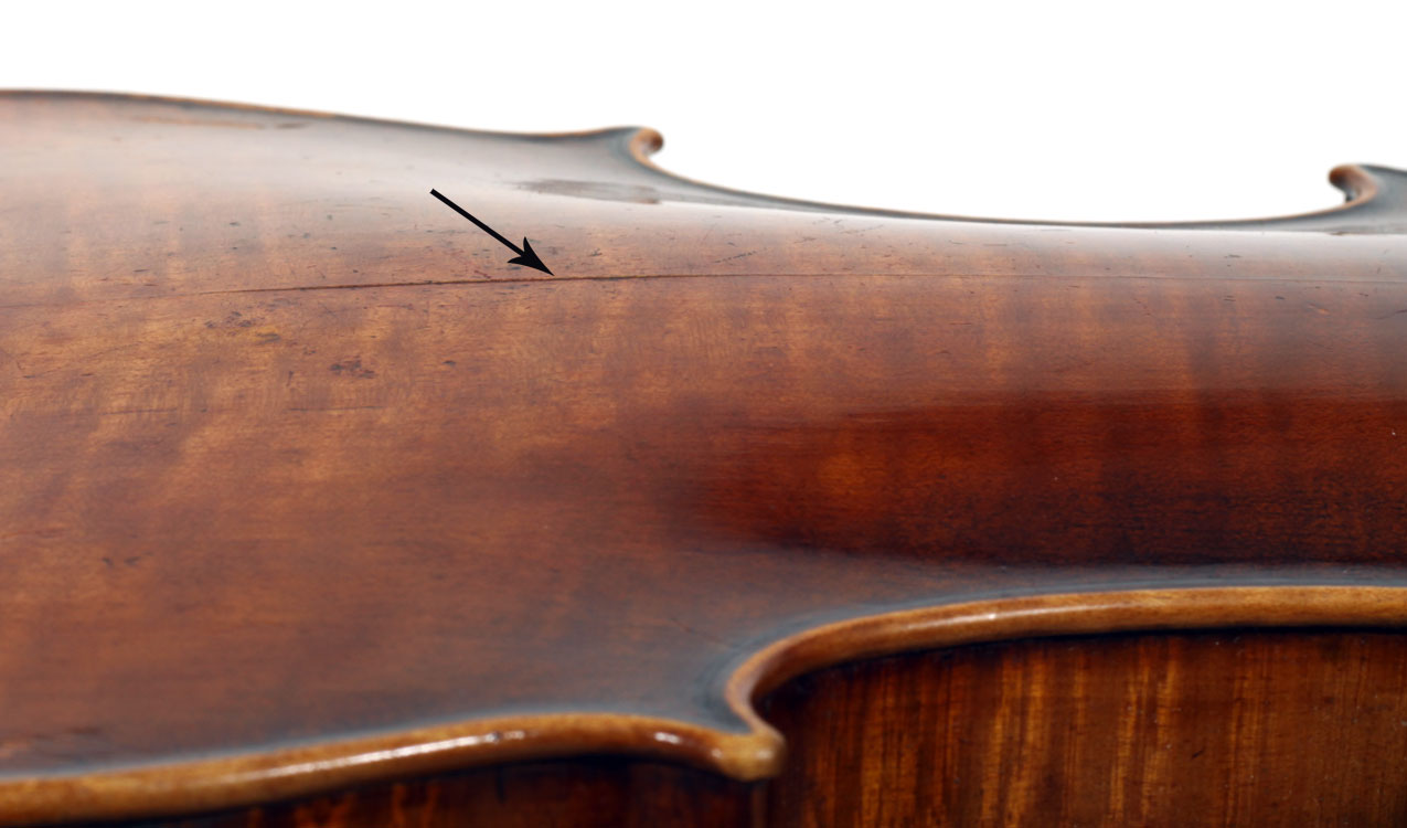 Although having been subjected to extensive restoration in its past, it can be said that this viola is structurally secure with no apparent hidden risk. The repairs carried out were the reinforcement of the pegbox flanks by means of three-layered plywood; the correction of the neck elevation by fitting a wedge under the fingerboard and the closing of the centre seam in the back, which evidently at some stage became loose. The seam appears to be secure, but the work could have been tidier in lining up the edged of the two halves. The varnish is worn in places due to much use, but this could easily be retouced by a qualified luthier. Also, other than two repaired wing cracks in the Fs, the viola is free from body cracks.