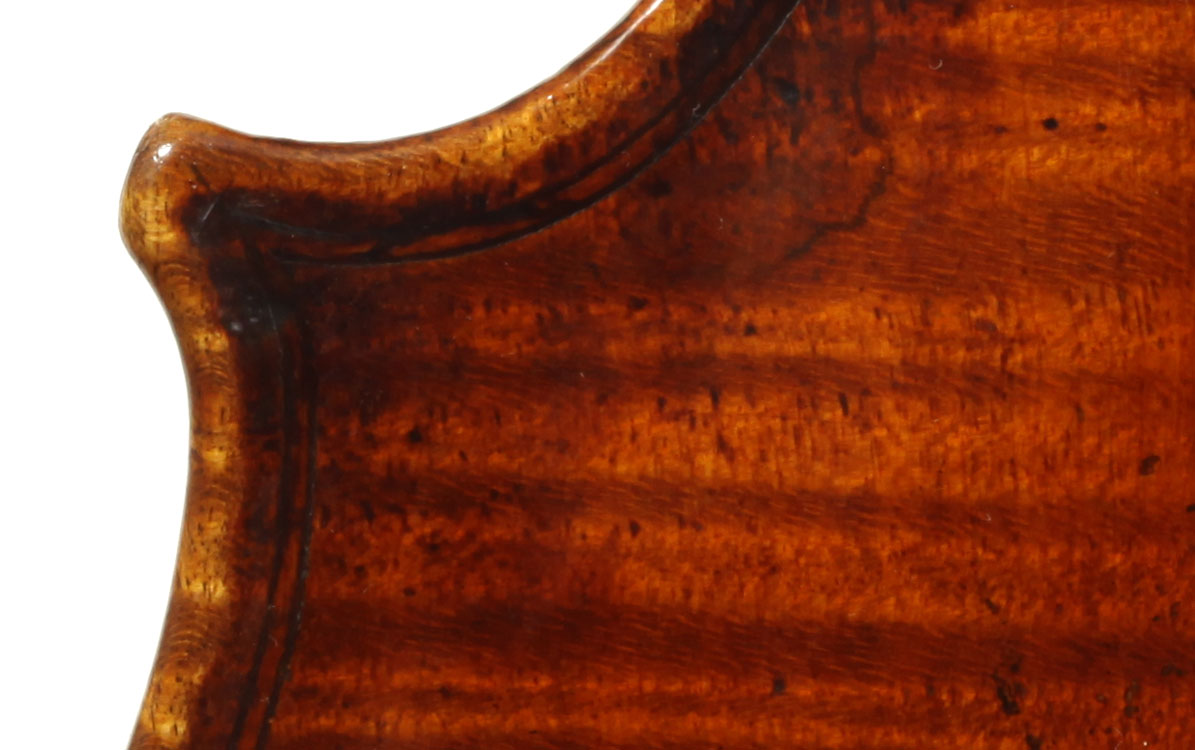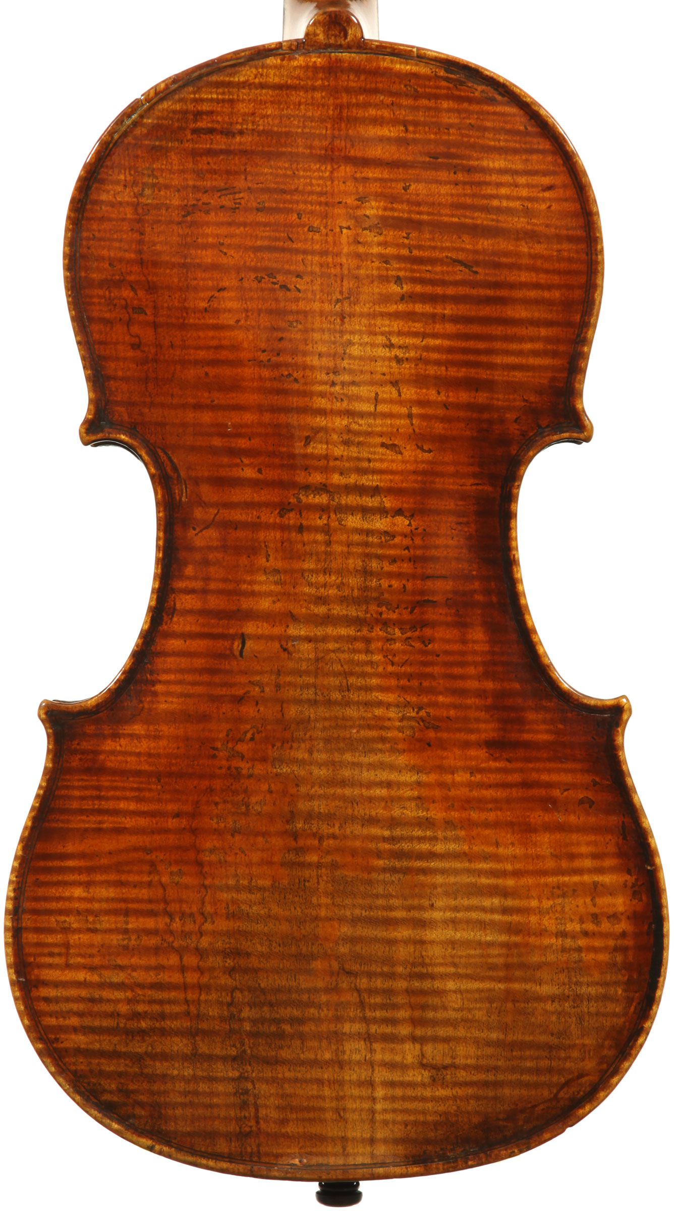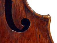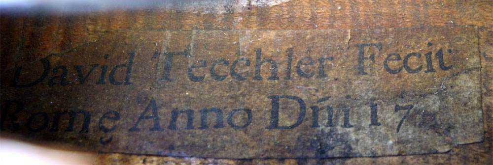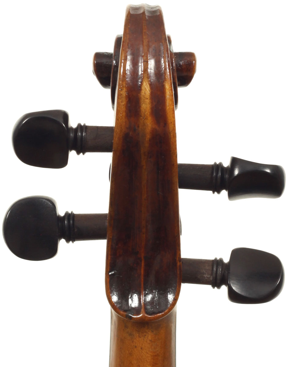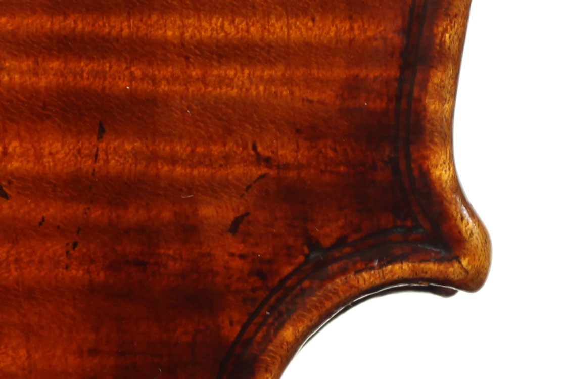 Although fitted with a very convincing David Tecchler label, this violin manifestly has nothing to do with that maker and almost certainly is a trade (commercial) instrument from around the mid-19th century. It is conceivable, under scrutiny, that this is a composite instrument, built around a very good back and ribs, but the top, neck and scroll having been added later. It appears that the purfling and mitres in the back are not only different, but also superior to that in the top.