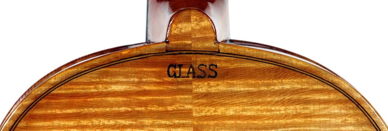 The origin of this violin is quite straight-forward. It is stamped GLASS on the back just below the neck button and is labelled as being a Stradivari copy by the firm of Friederich August Glass. This clearly establishes its German trade origin.