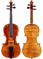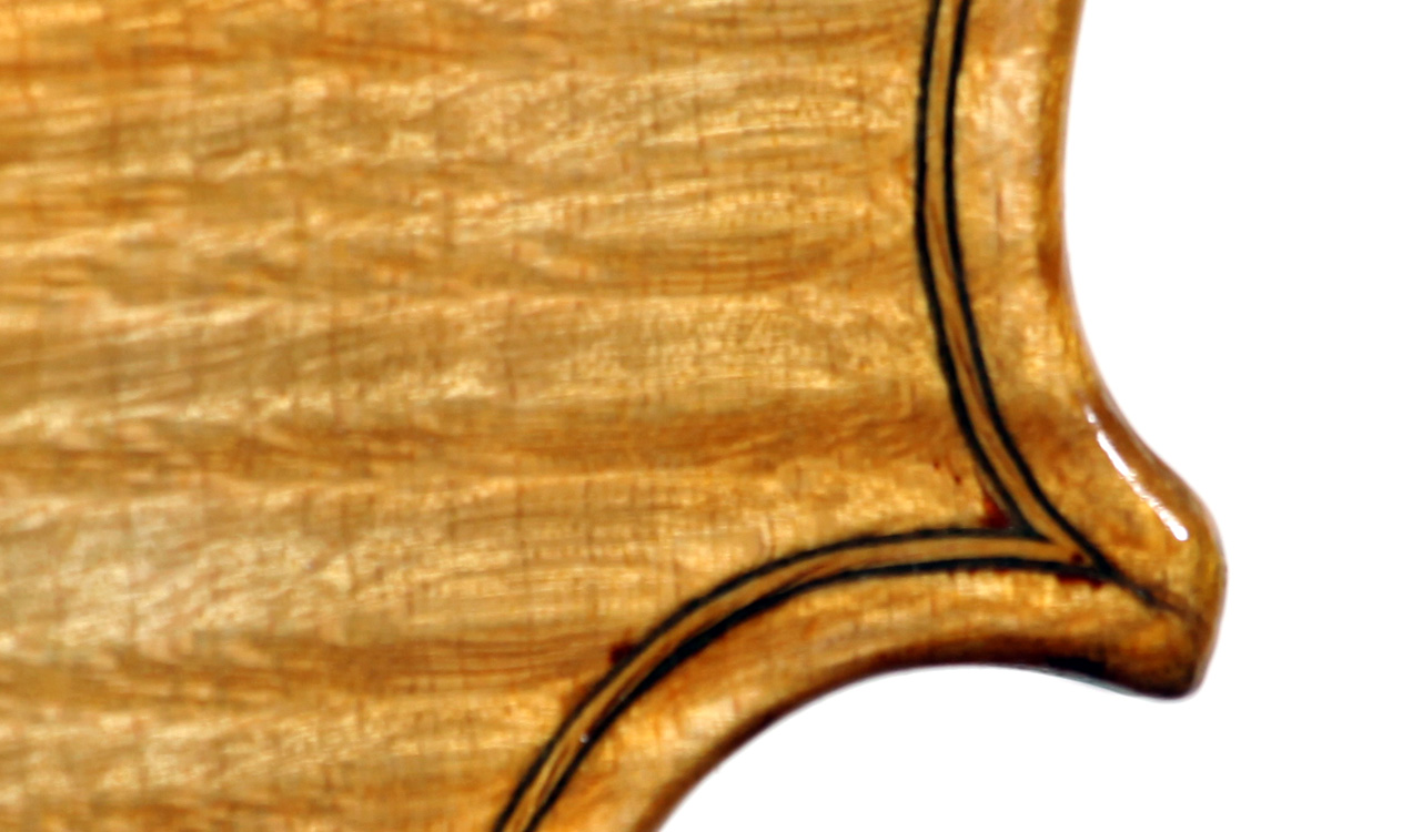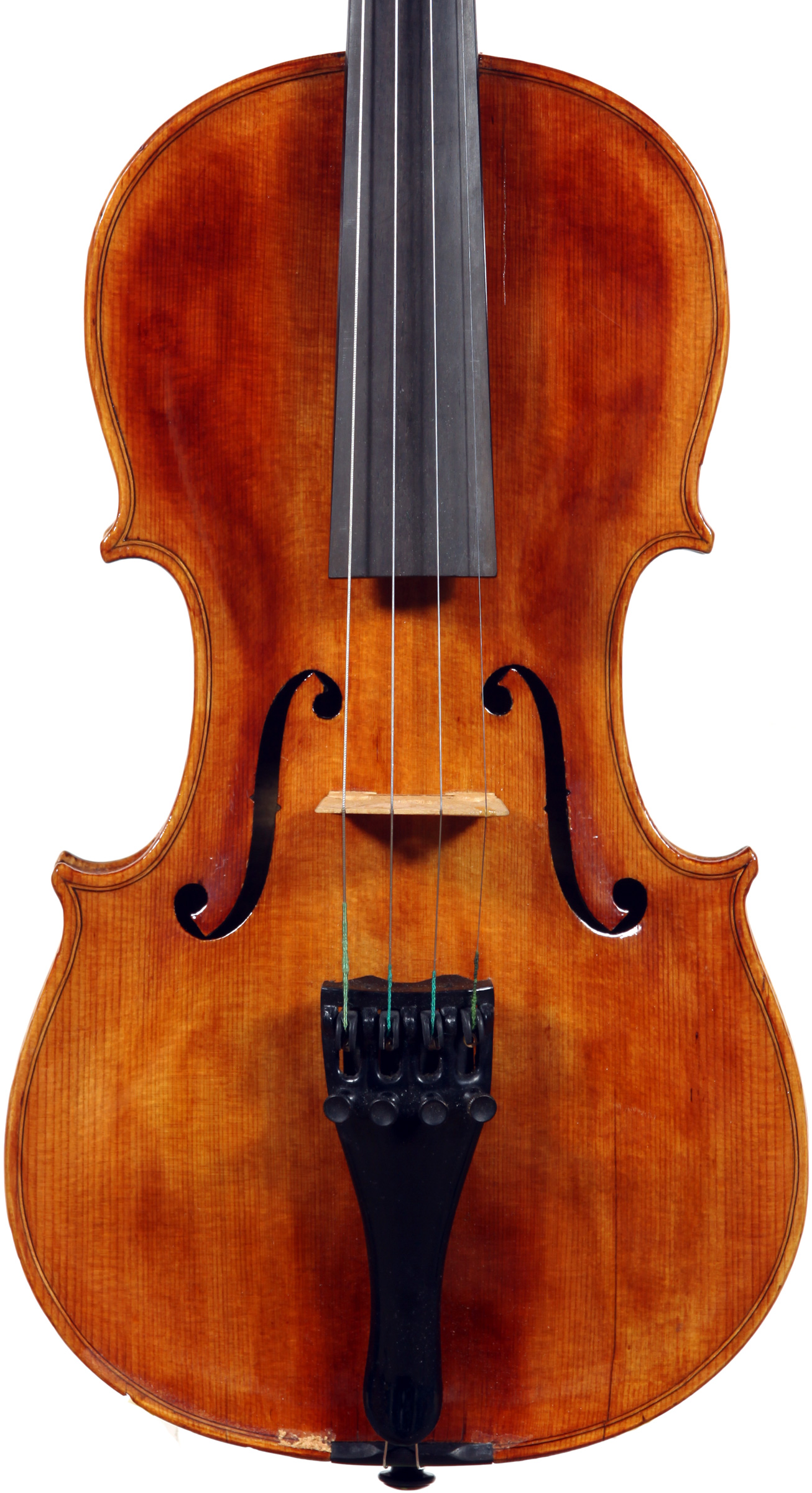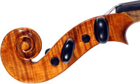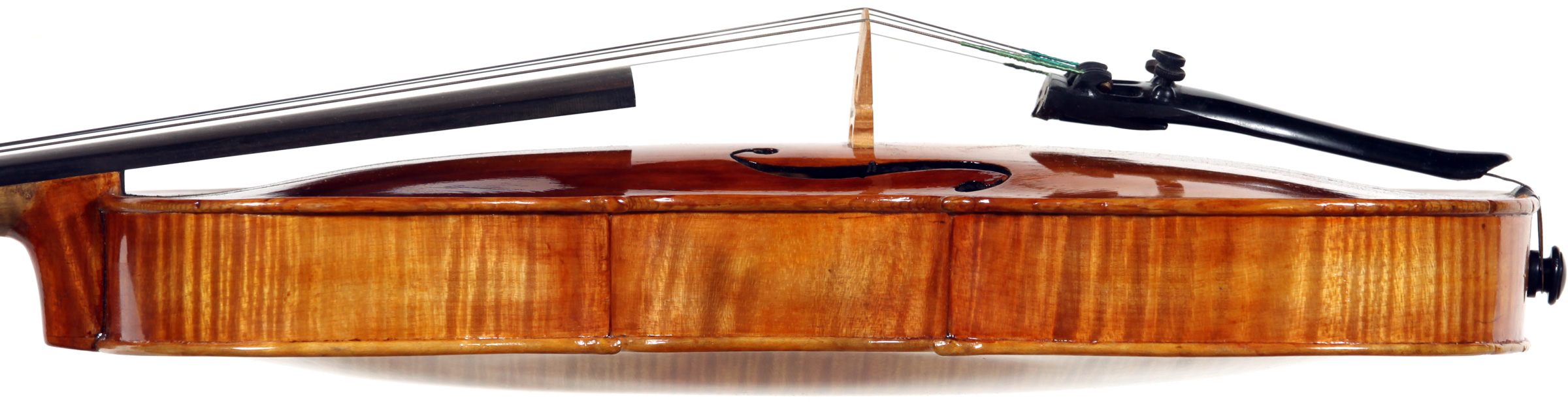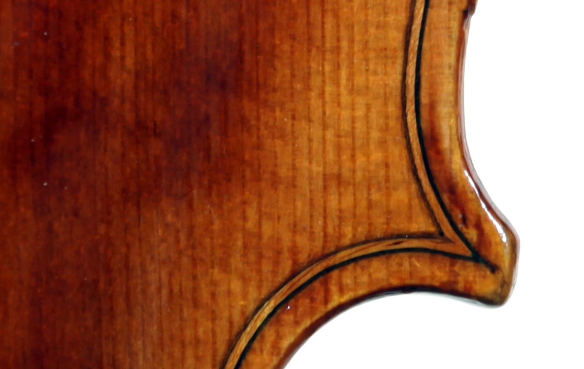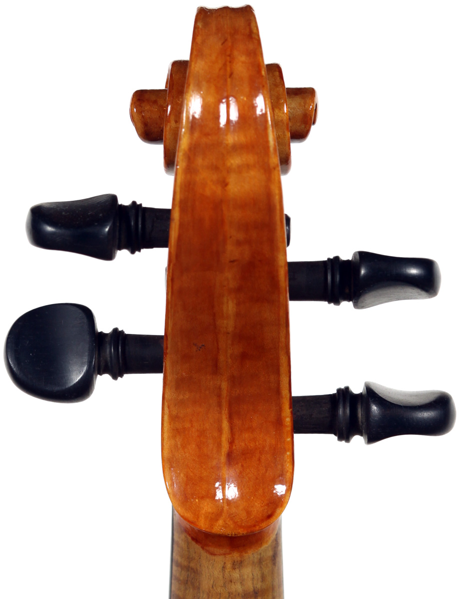 What impresses in this violin is the exceptional choice of materials - the two-piece back, ribs and scroll are of truly exquisite well-figured maple with a distinct straight medium to narrow curl, all ostensibly from the same piece of wood. The top is of excellent tone-spruce with a medium to narrow grain. The Fs are refined and the tracing of the purfling shows a steady and experienced hand - with superb mitres in the corners. The scroll is elegant and balanced.