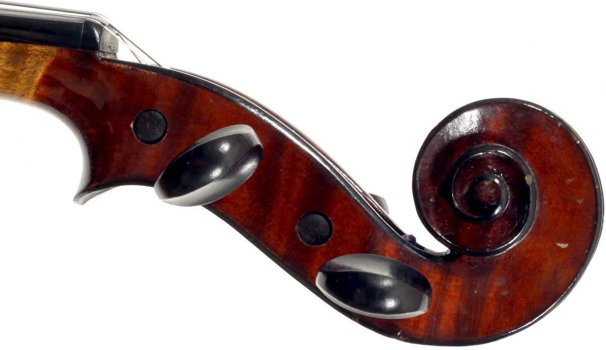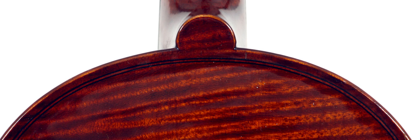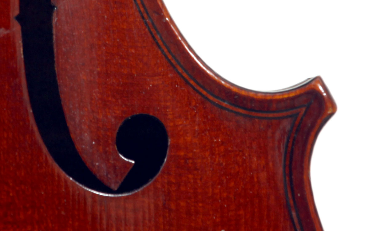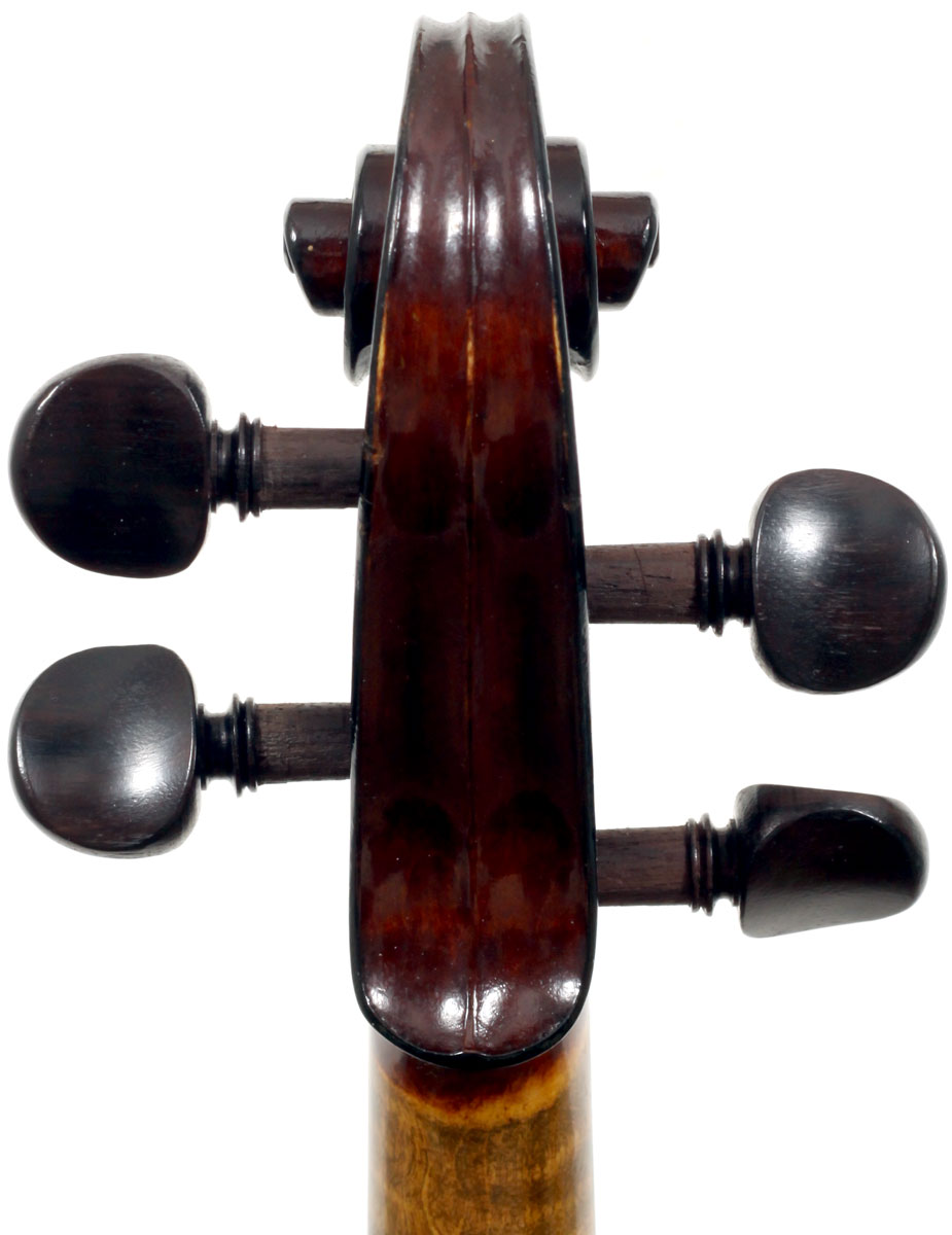 This violin represents the very best one could hope to find from this studio - an unusually beautiful one-piece back, well-flamed of medium curl maple. The sides, neck and scroll appear to be of the same wood, the sides being equally well-flamed. The scroll and Fs show a steady hand with attention to detail, as do the purfling and the cornerwork - very good throughout. Varnish is dark red-brown - nice on the eye, highly transparent and complimenting the beautiful choice of materials very well.