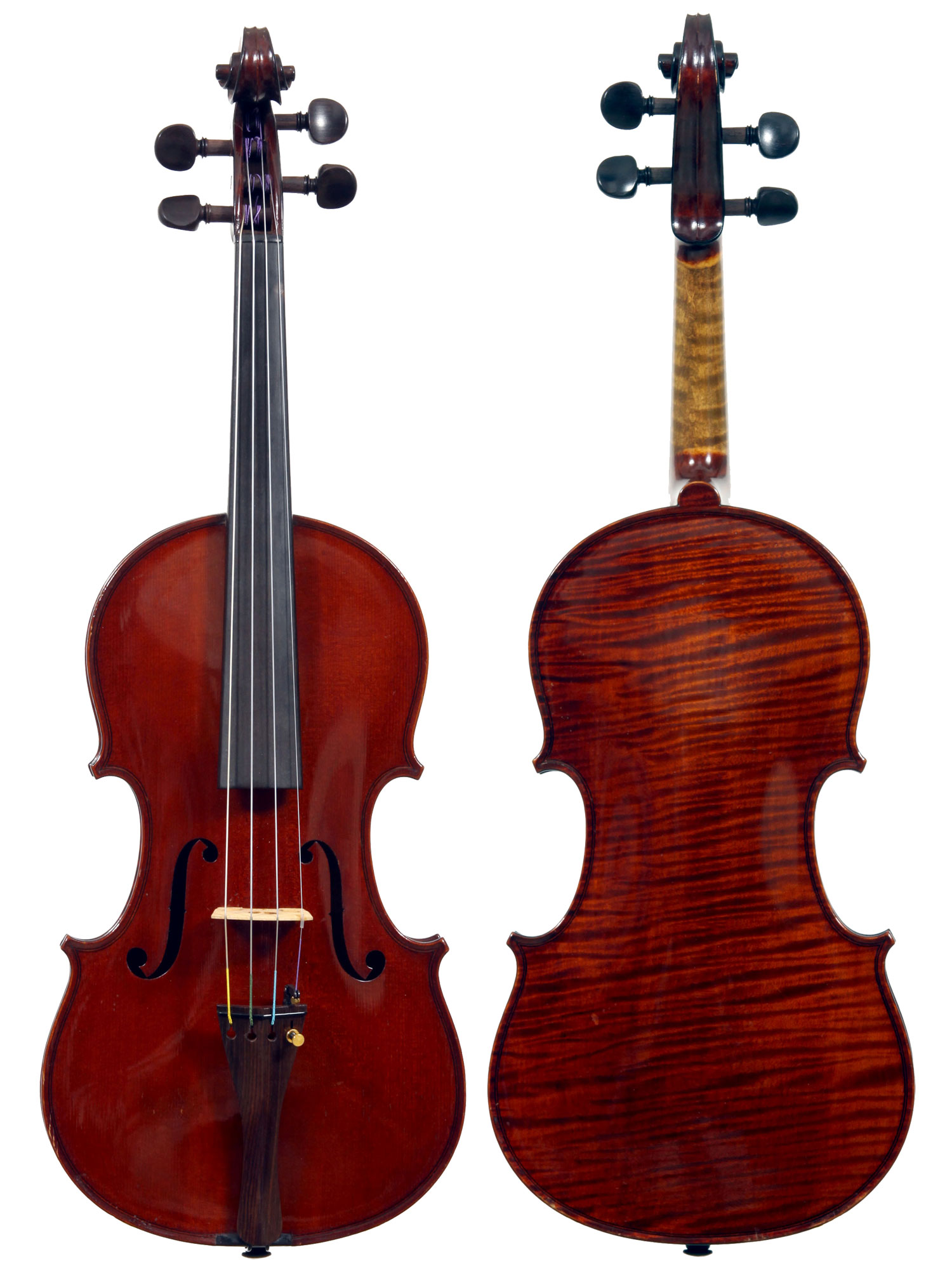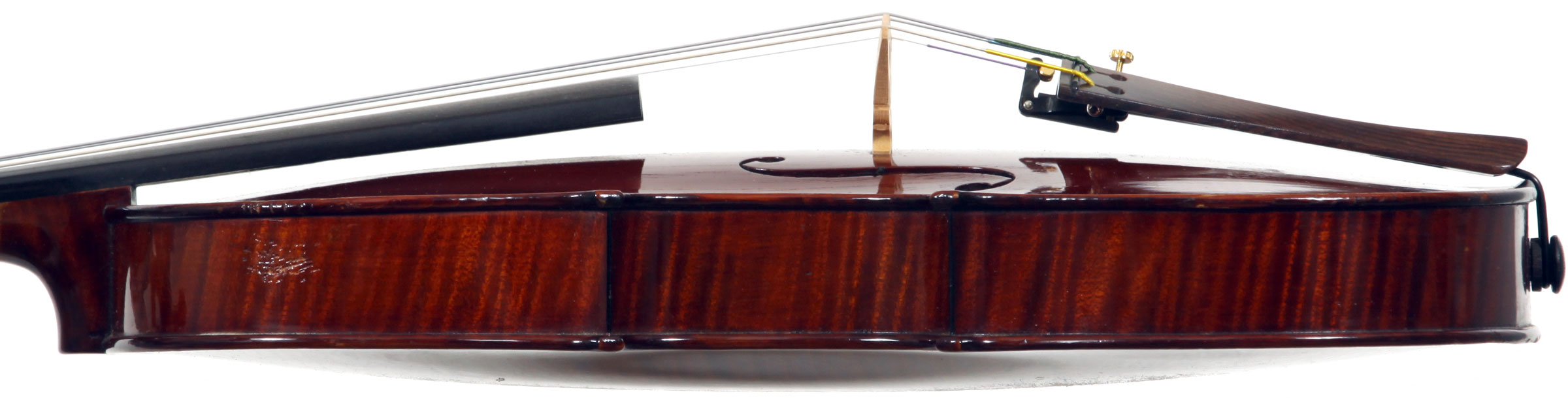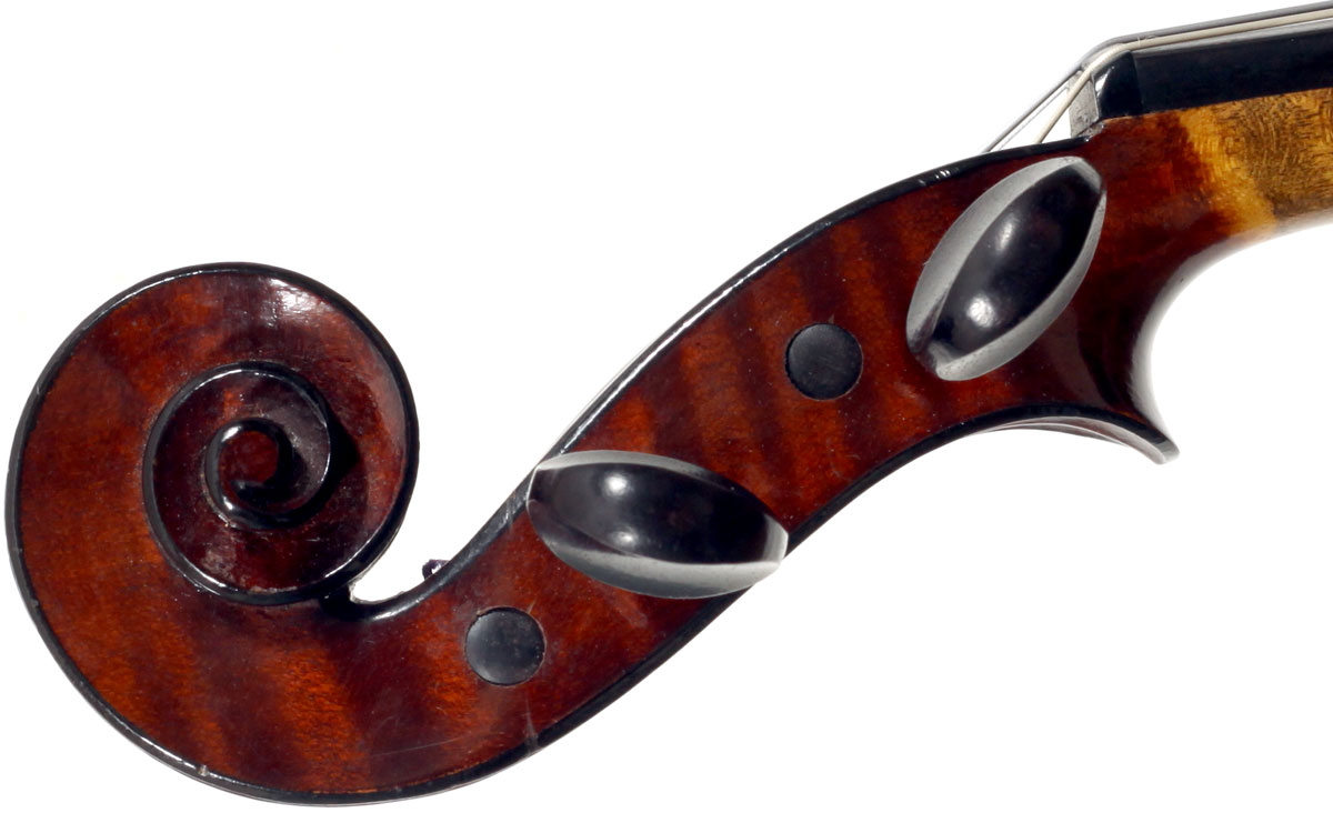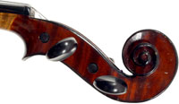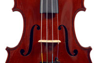 This violin represents the very best one could hope to find from this studio - an unusually beautiful one-piece back, well-flamed of medium curl maple. The sides, neck and scroll appear to be of the same wood, the sides being equally well-flamed. The scroll and Fs show a steady hand with attention to detail, as do the purfling and the cornerwork - very good throughout. Varnish is dark red-brown - nice on the eye, highly transparent and complimenting the beautiful choice of materials very well.