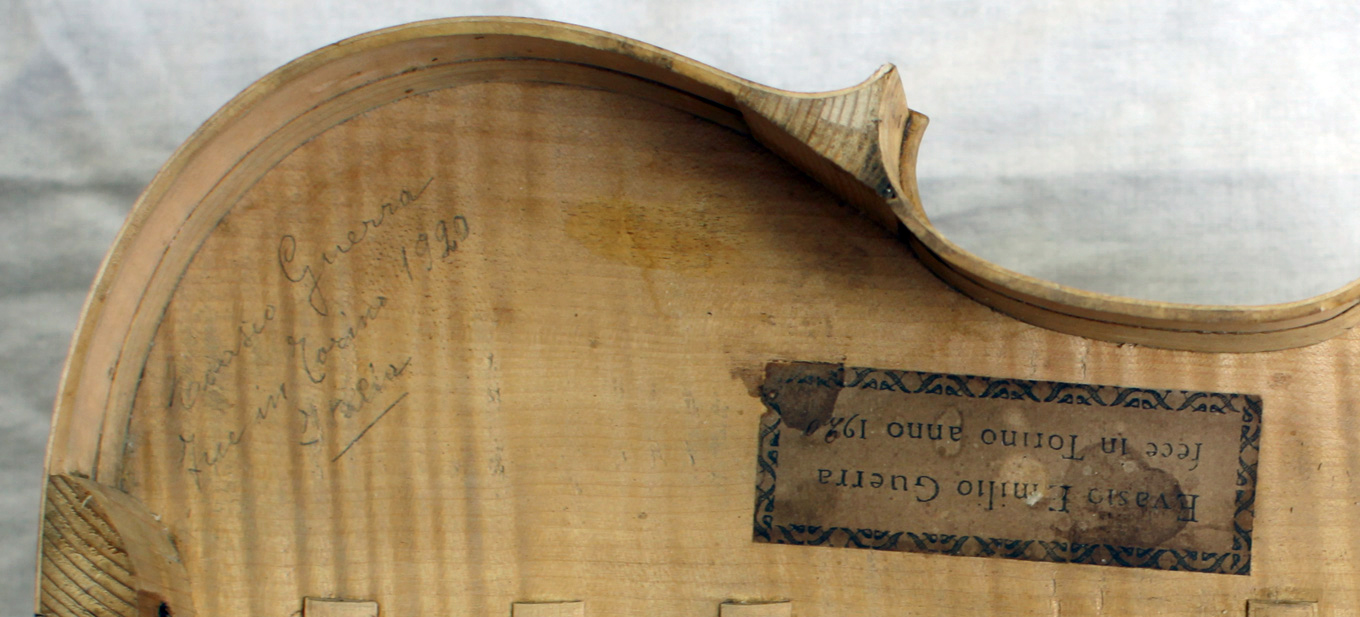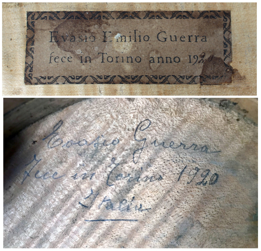Other than bearing this maker's known label, dated 1920 by hand, the maker also signed in the back near the endblock, 'Evasio Guerra, fece in Torino 1920, Italia. (See photo)