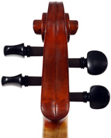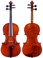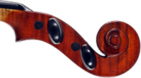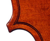 This violin shows Guerra's mastery in edgework with virtually perfect corners and mitres and finely crafted Fs. The purfling is absolutely superb and the scroll impeccable. The top is of medium grained tone spruce and the back, ribs and scroll of mildly flamed maple with a medium curl. This violin has been revarnished - see the notes below.