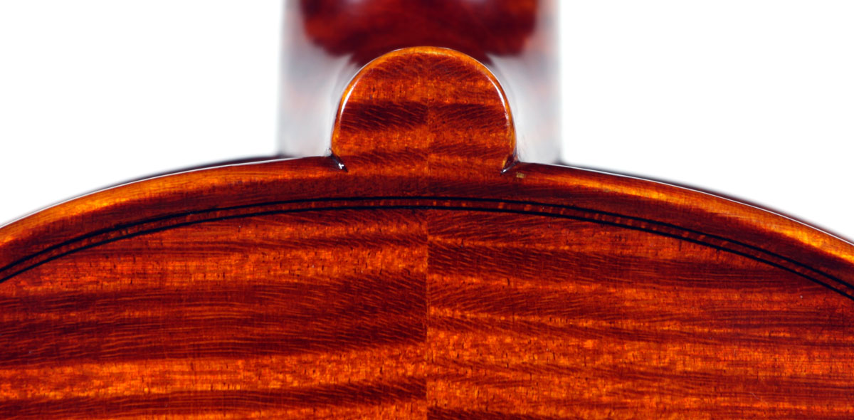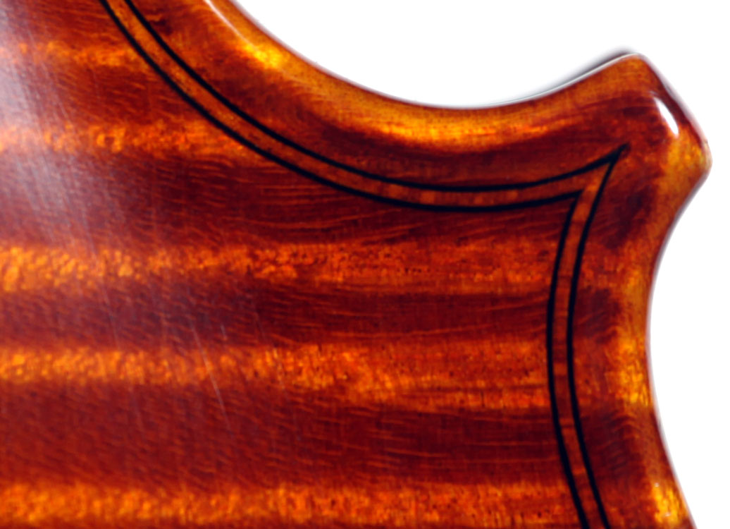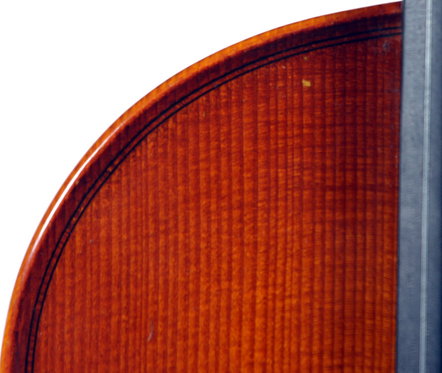 What strikes one immediately about this violin is the extremely attractive choice of materials that went into its making, along with the meticulous workmanship throughout in the unusual attention to detail, notably in the purfling, the cornerwork, the mitres, the nicely fluted wings in the Fs and a meticulously carved scroll with a deeply fluted curl and crisp edges - reminiscent of the Deganis and the Venetian school ; the maple used for the two-piece back, ribs, neck and scroll is extremely appealing by all standards with a distinctly flamed narrow curl running straight across the back, The top is of superb tone spruce of a very straight and even medium grain. The reddish-brown varnish is highly transparent and beautifully compliments the materials.