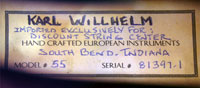 Karl Willhelm is the trade name of a German workshop which distributes these excellent instruments all over the world. This violin appears to have been exported to the USA and was later brought to South Africa. It is undated and appears to have been made around 1980 or later.