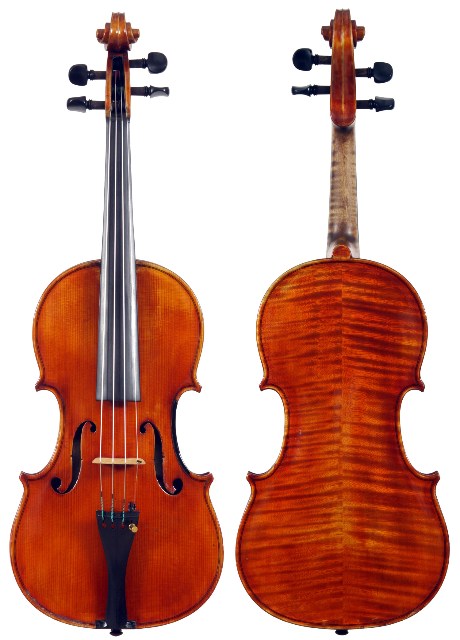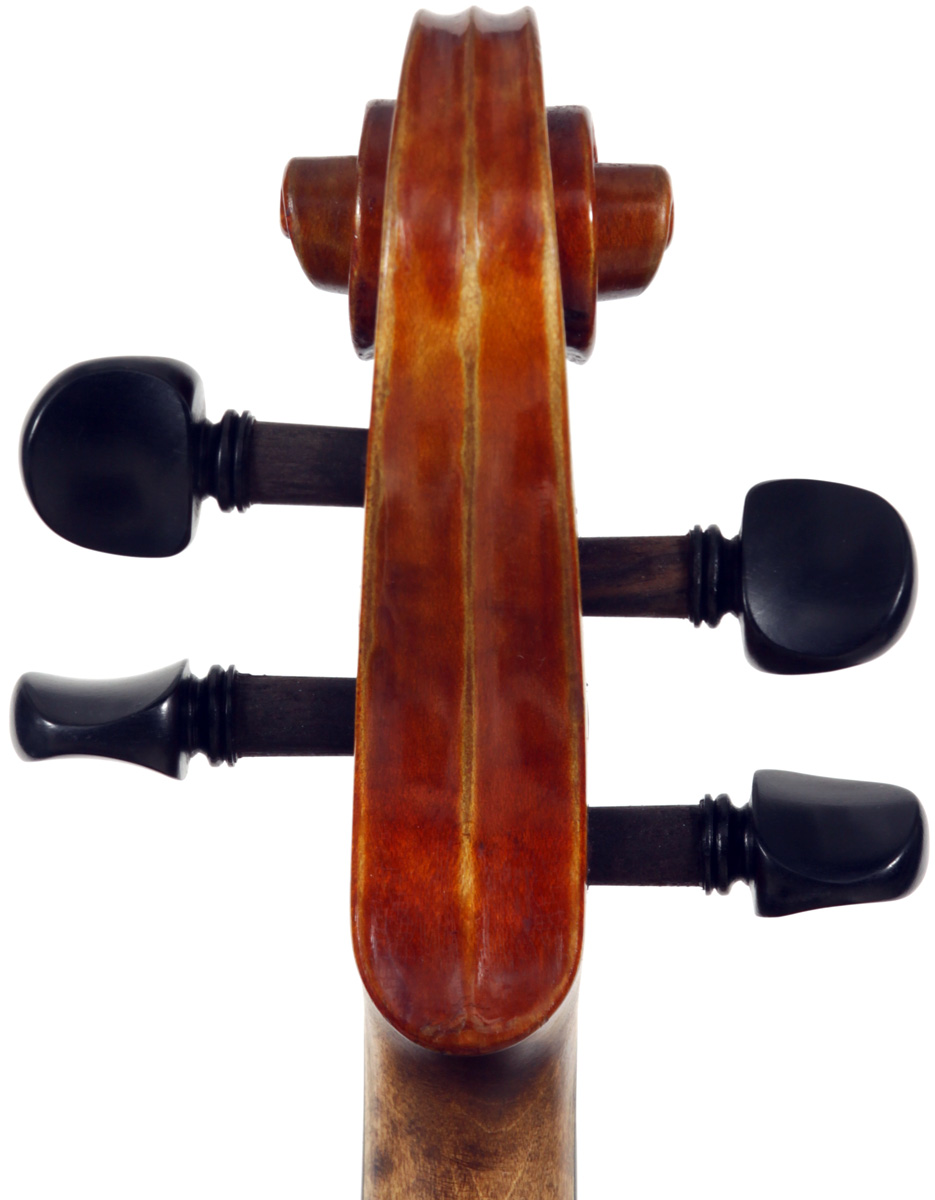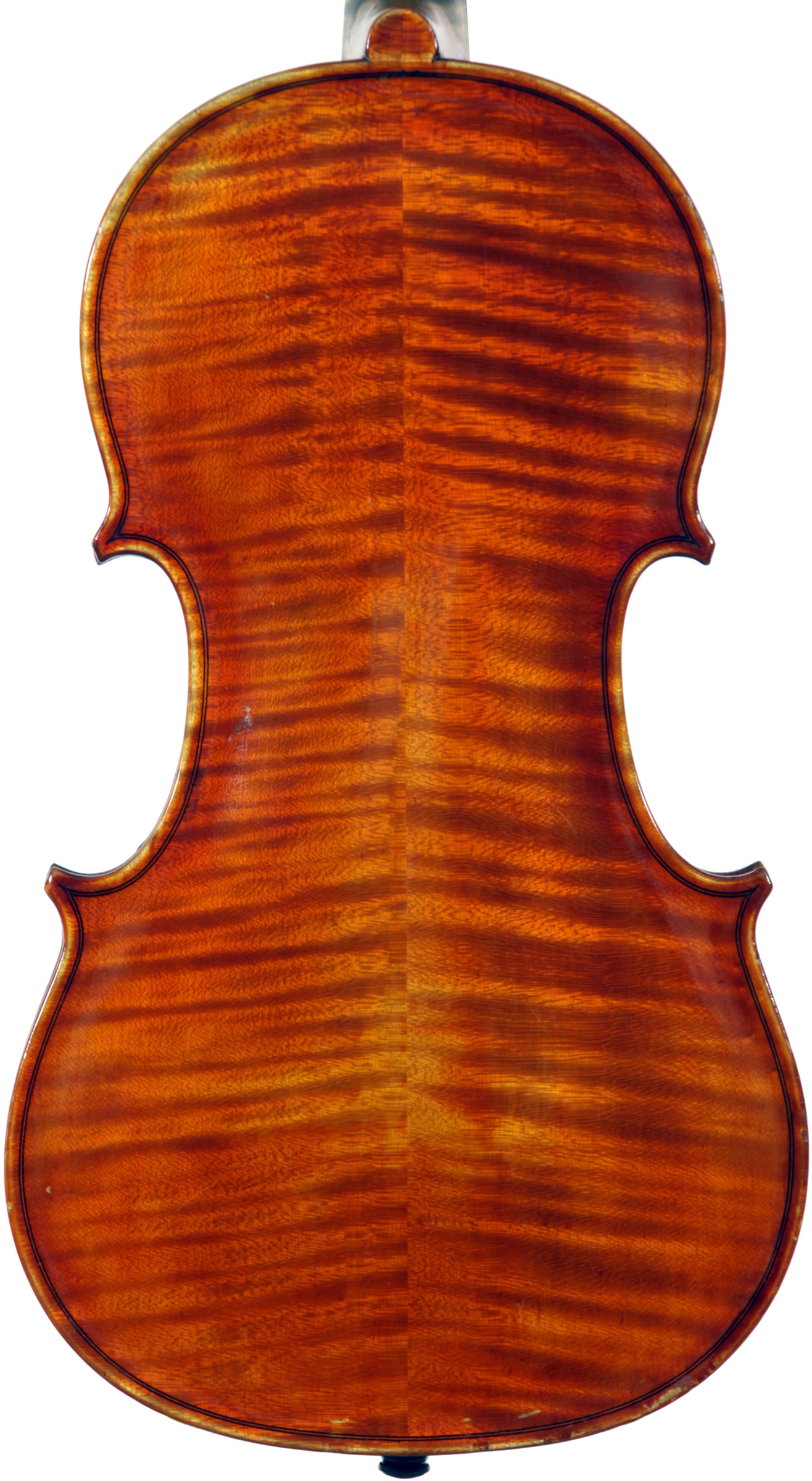 The two-piece back, ribs, neck and scroll are of good maple with a medium curl and distinct figure sloping down from the centre seam to the flanks. The top is of open-grained tone spruce. The oil varnish is an appealing orange-brown and the current fittings are of ebony.