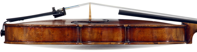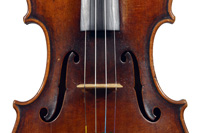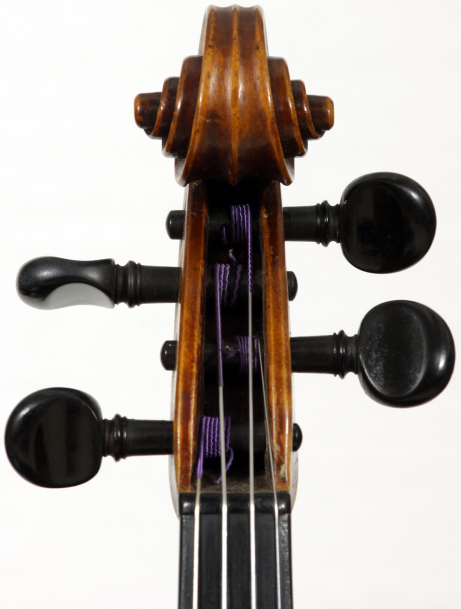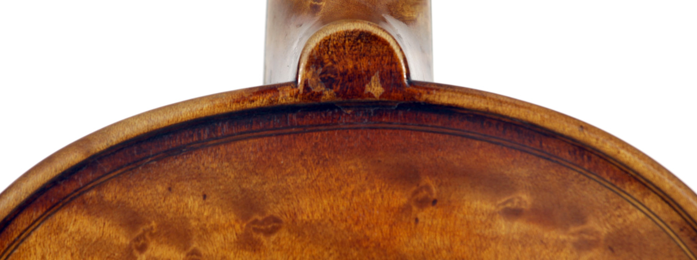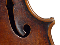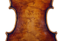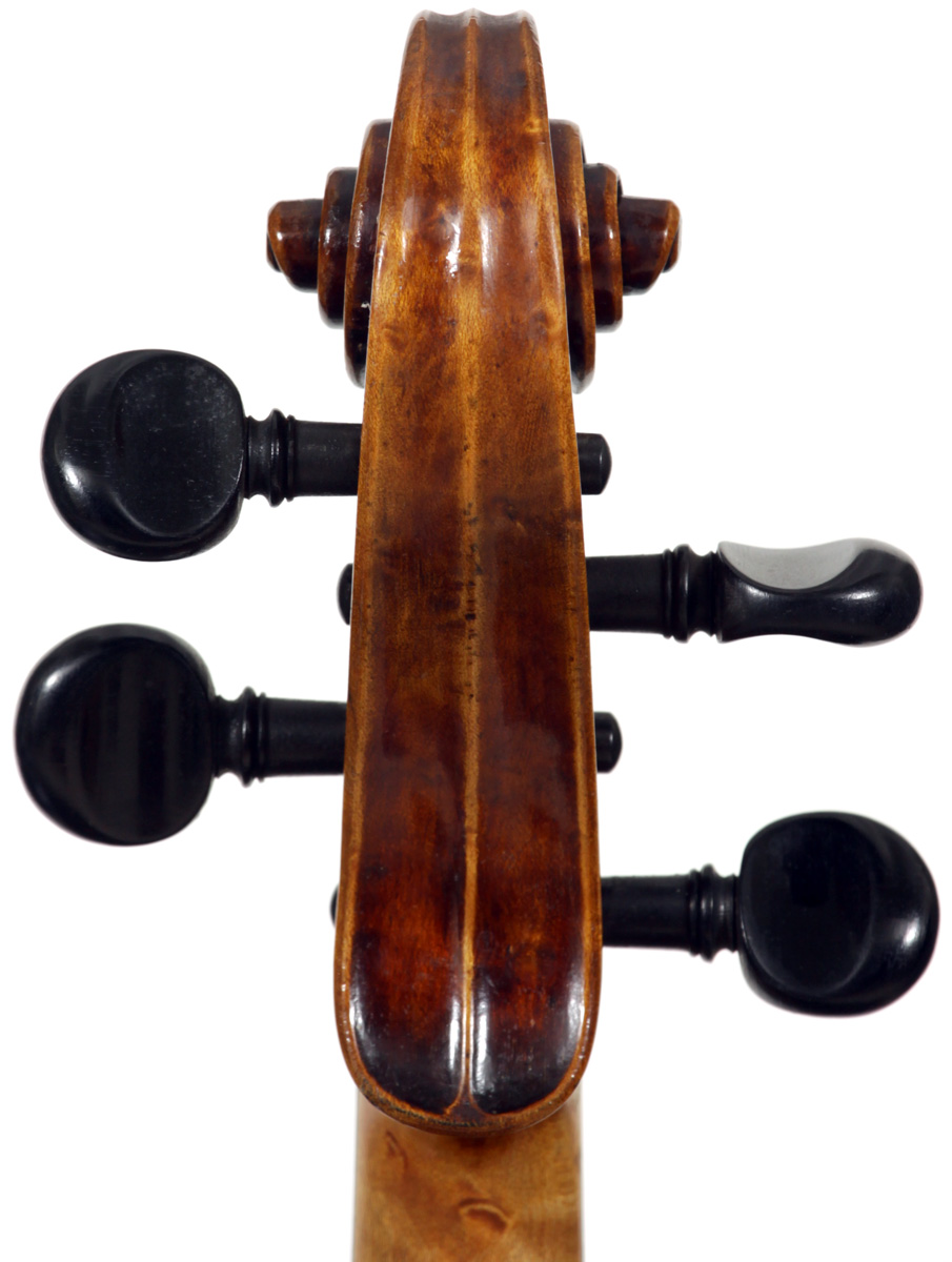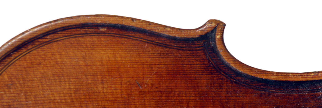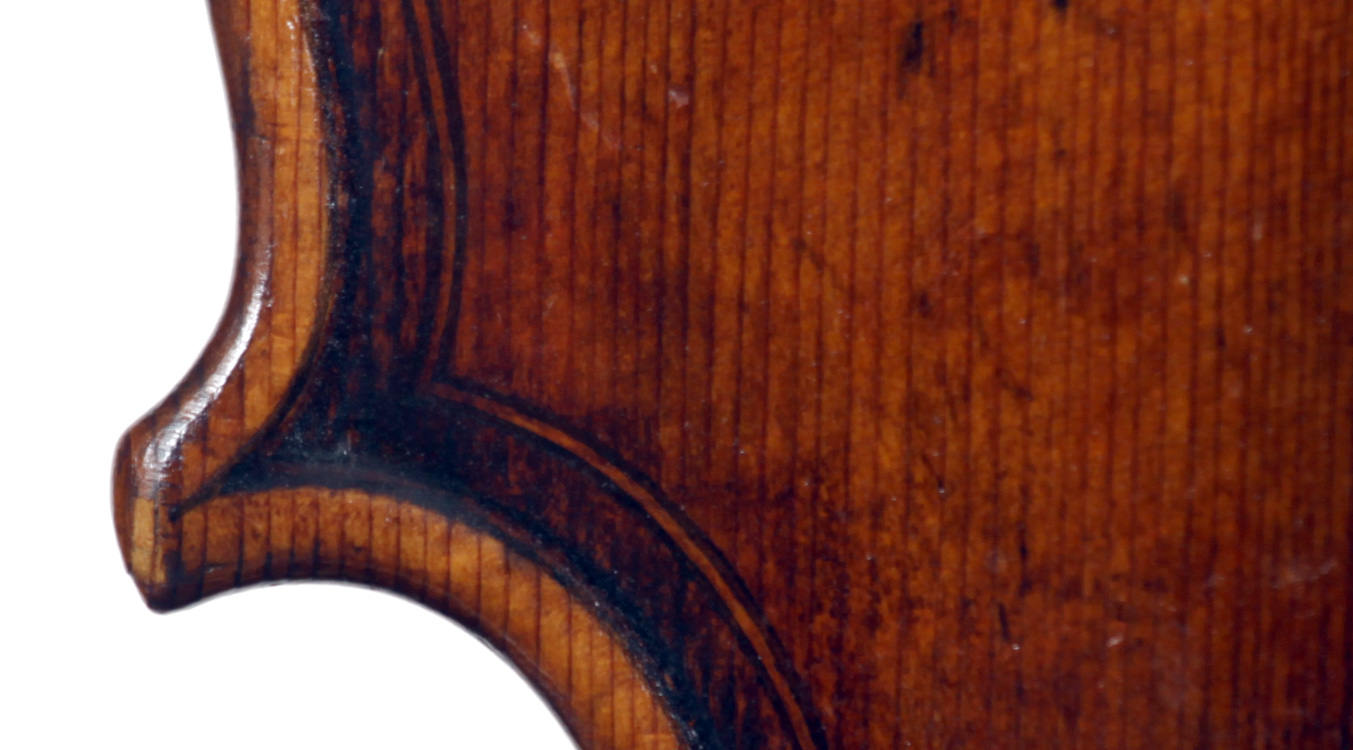 This violin follows the Maggini pattern - double purfling, a very long back length (36.9 cm in this case) and the additional curl in the scroll - a trademark of Maggini's idiosyncrasy. But then it deviates in that the Fs are certainly in the style of Guarneri. Workmanship is very tidy, notably in the scroll, the purfling and the cornerwork.