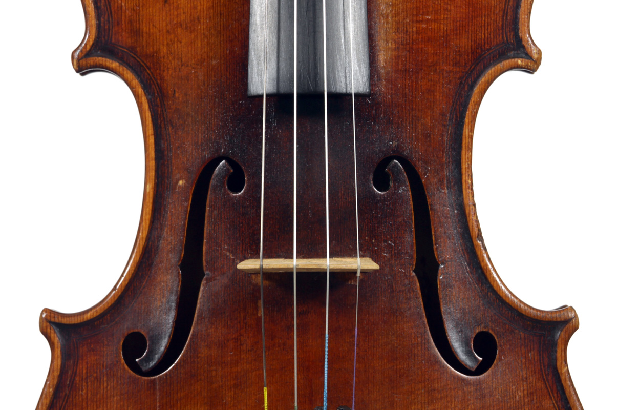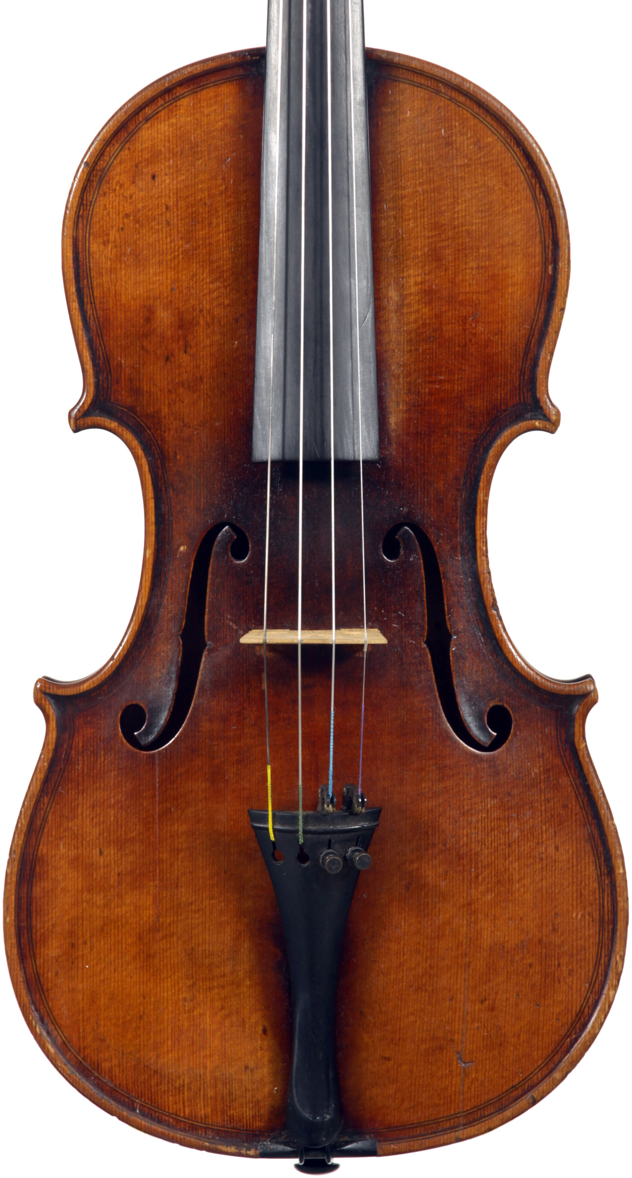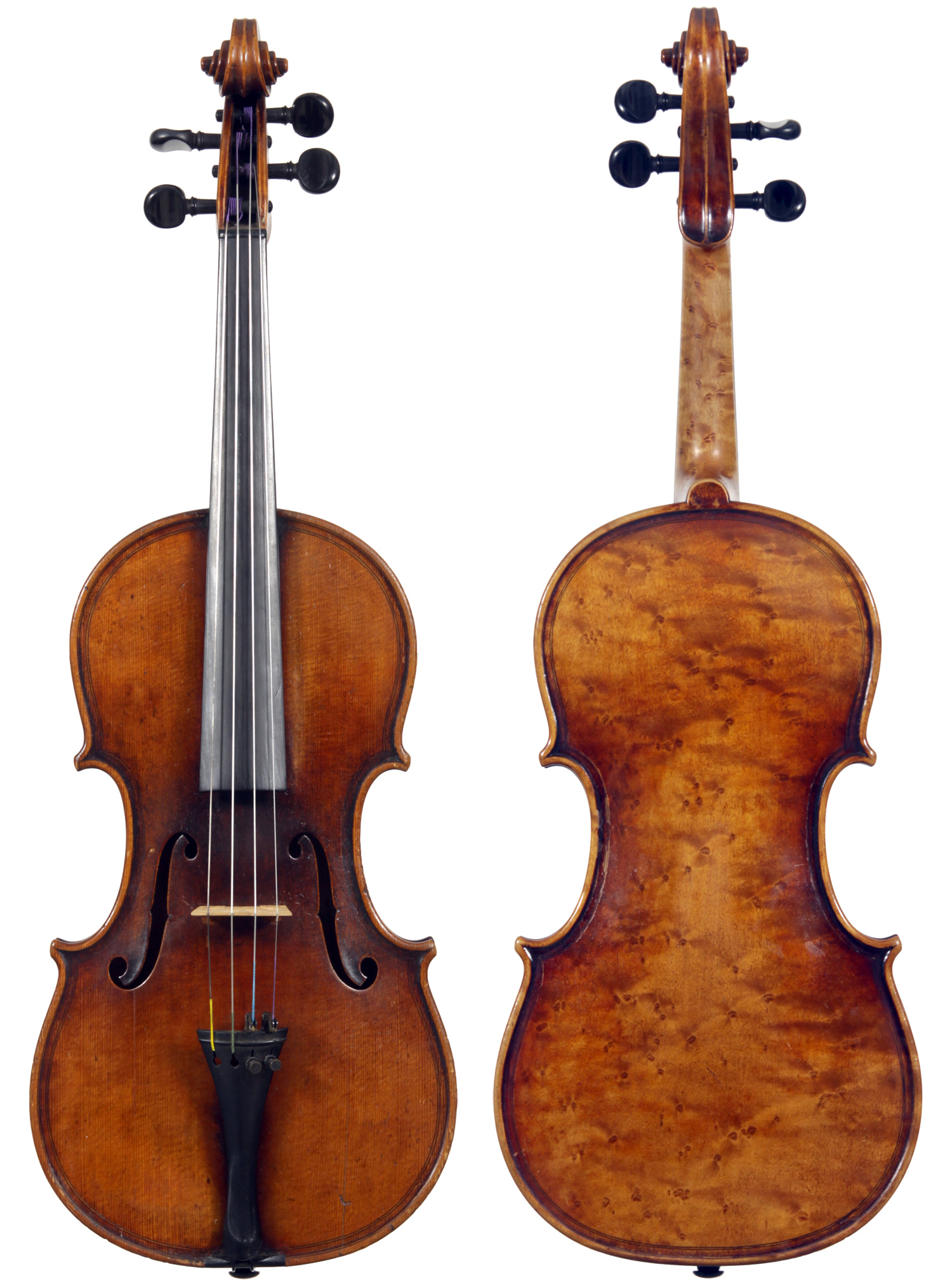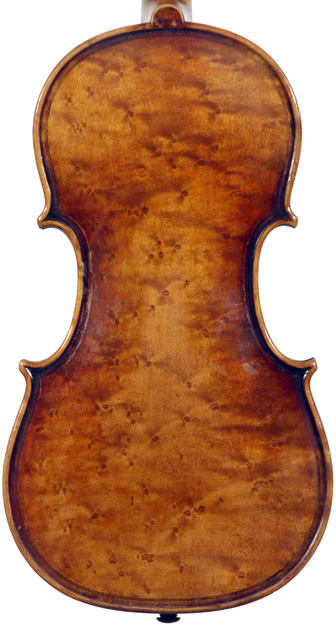 In this violin, probably made around 1930, one is struck by the beautiful piece of bird's eye maple used for the one-piece back, ribs and the neck and scroll. The top is of good tonespruce. Varnish is an appealing reddish brown over a yellow ground, making this an attractive instrument.