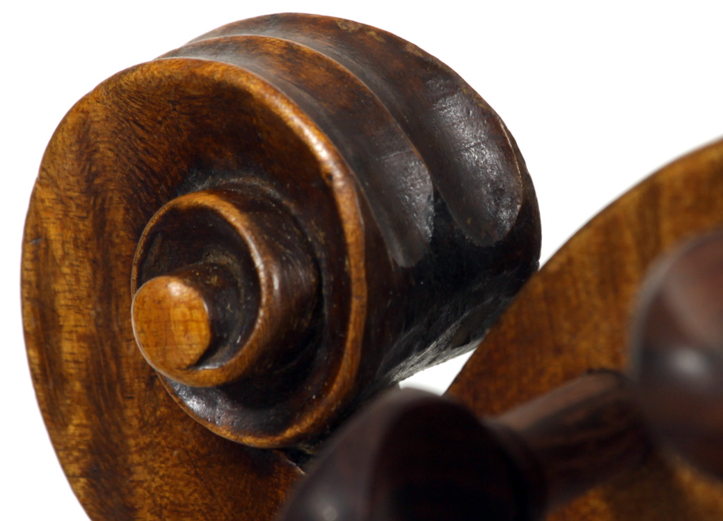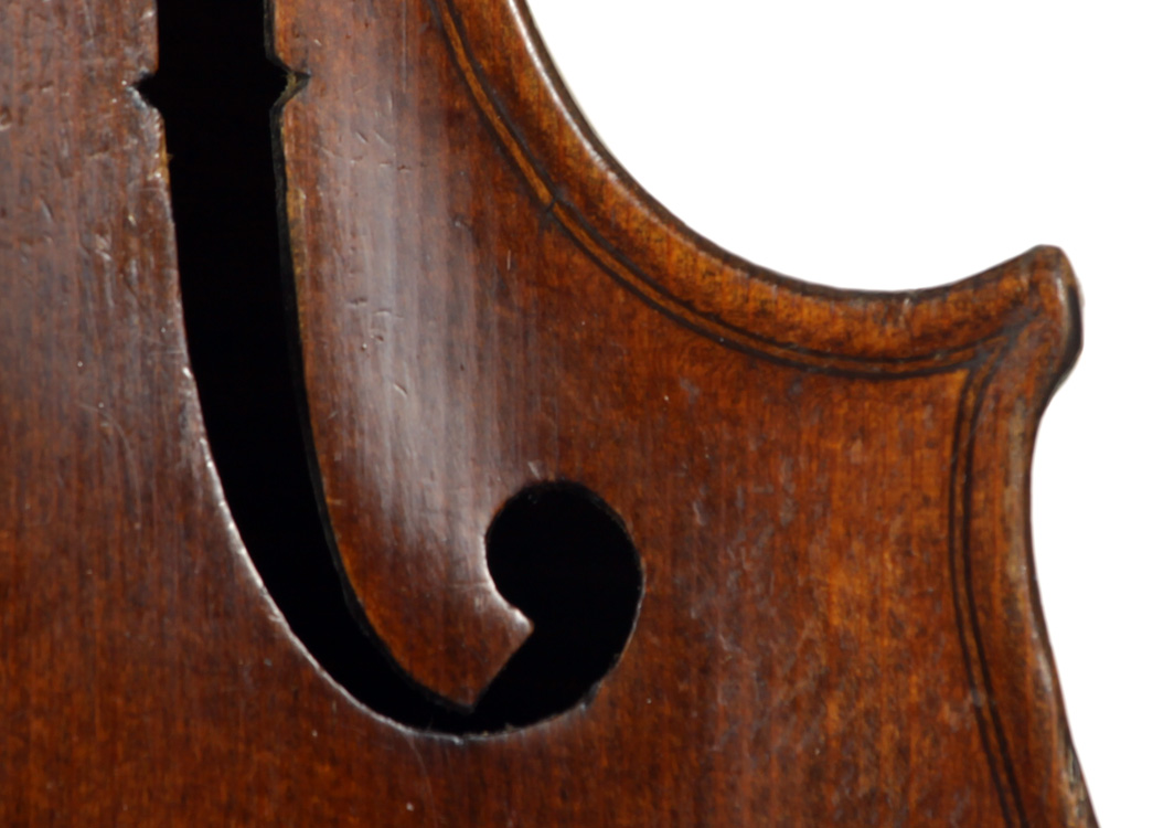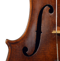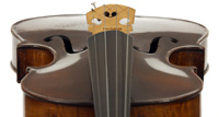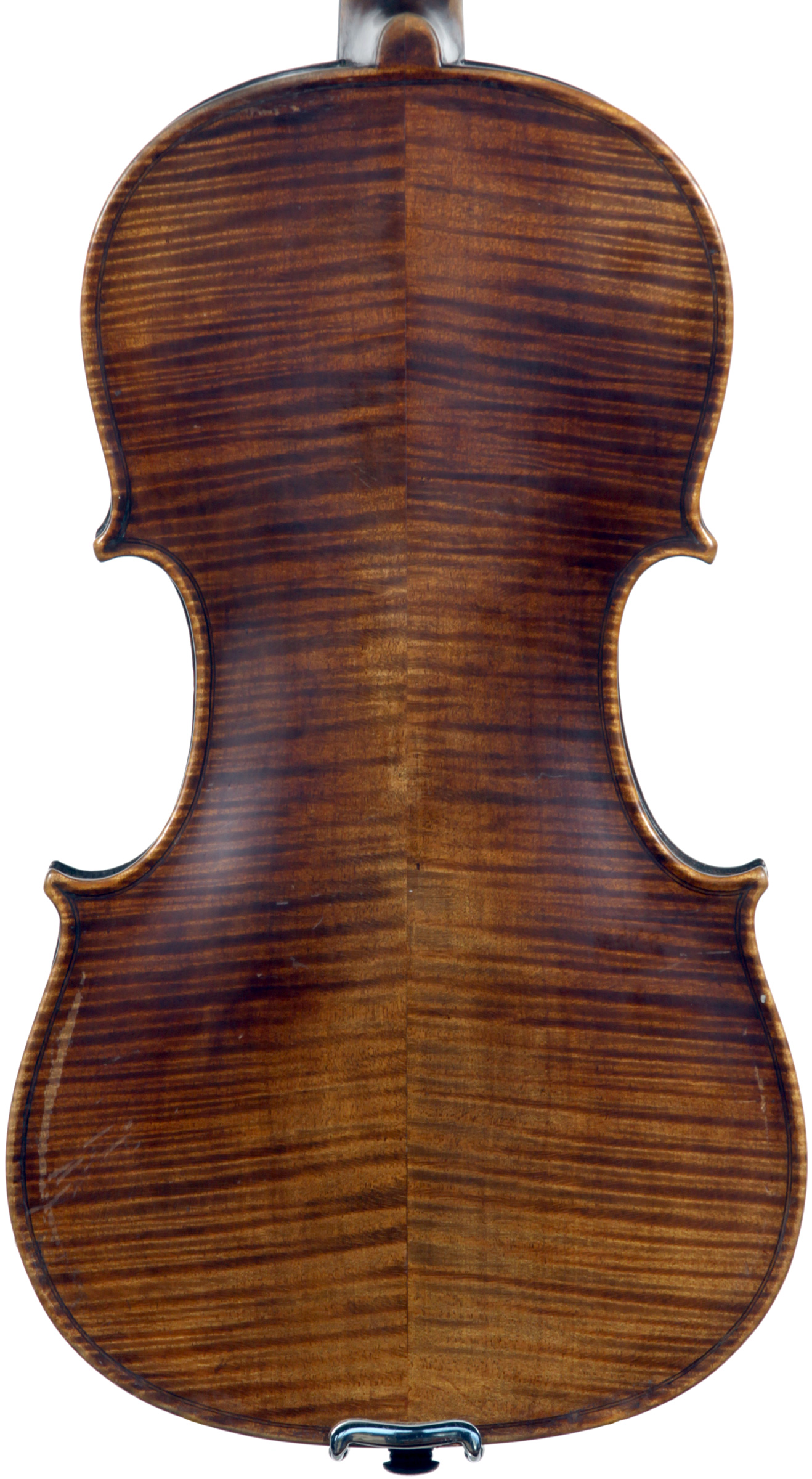 The two-piece back is of medium to finely curled maple with a distinct figure. The same material is used in the ribs, neck and scroll. The latter is somewhat perfunctory, as are the F's. Purfling and cornerwork is tidy, showing an experienced and steady hand. The top is of even medium-grained tone spruce and the brown varnish shows of the materials well. It quite clearly is a commercial instrument, aimed at entry level professional players.