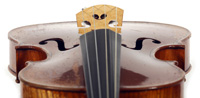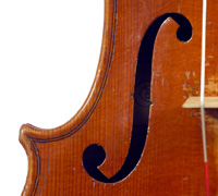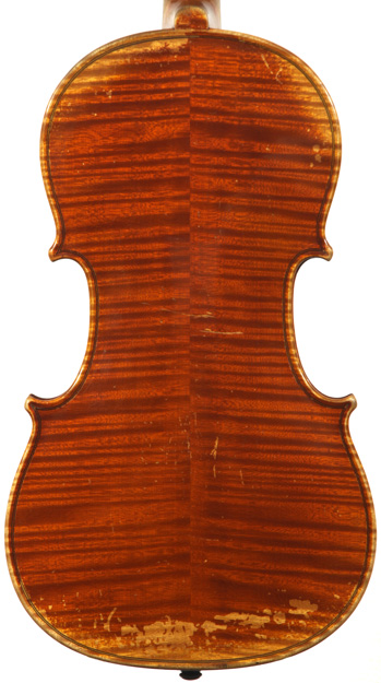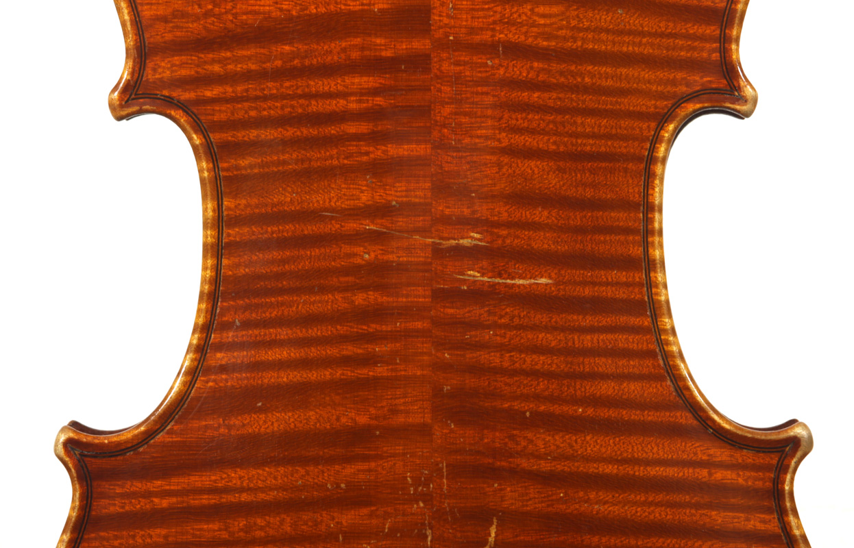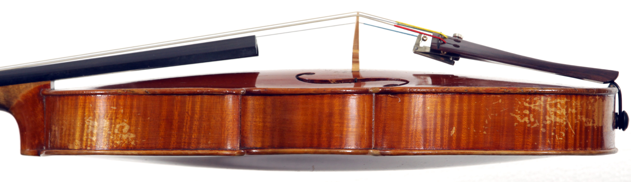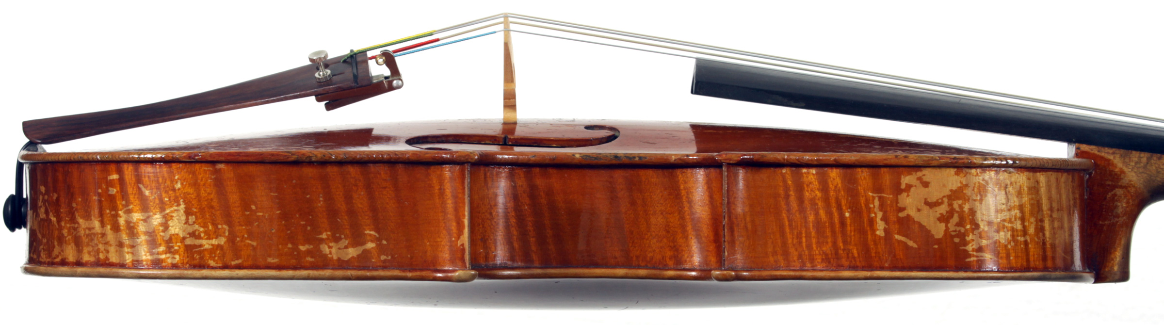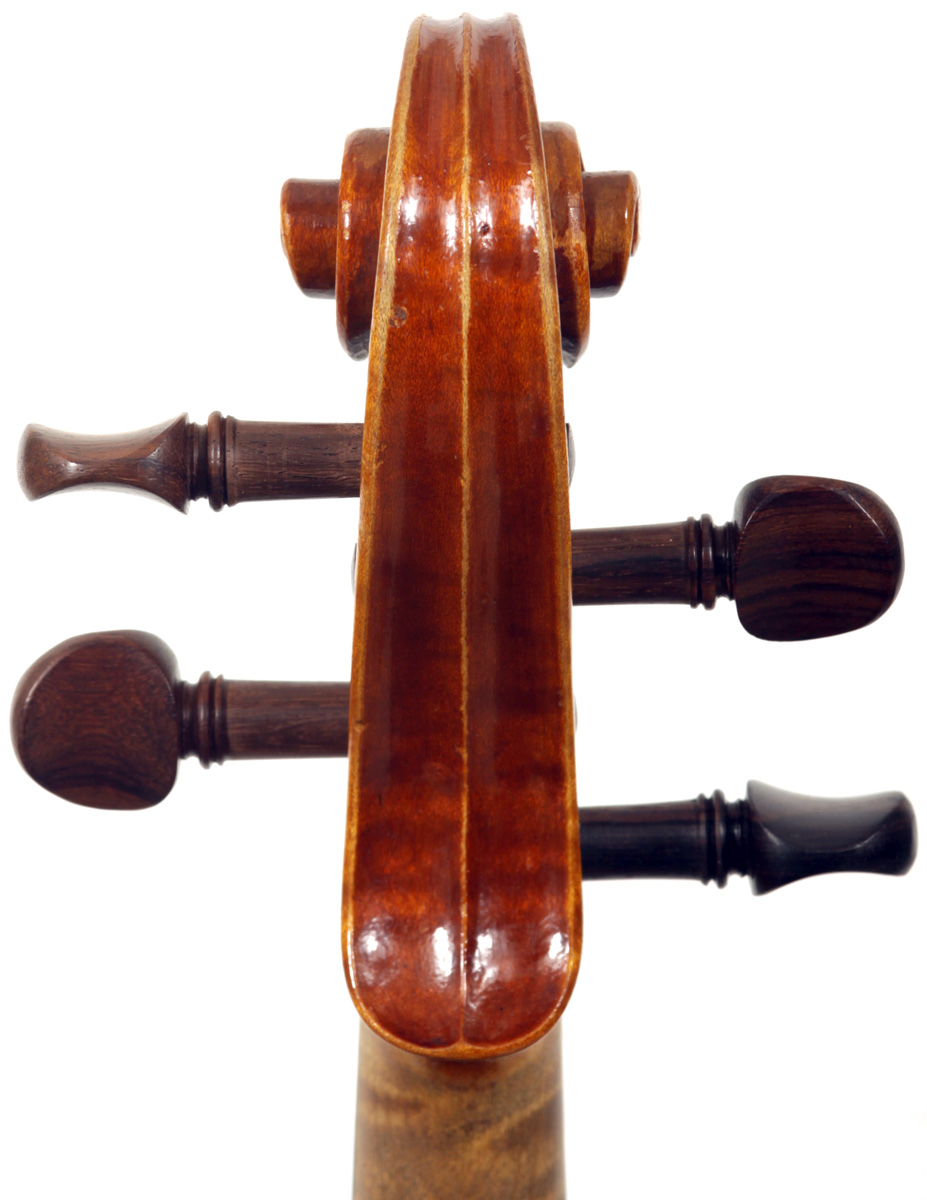 In this instrument the two-piece back, ribs, neck and scroll are of nicely figured maple with a straight even narrow to medium curl. The top is of fine tone spruce with narrow grain at the centre line widening to the flanks. Purfling and cornerwork is tidy and the scroll is nicely balanced. This viola is well-toned and responsive and a pleasure to play.