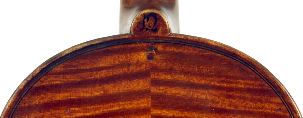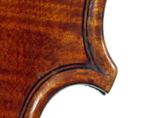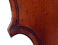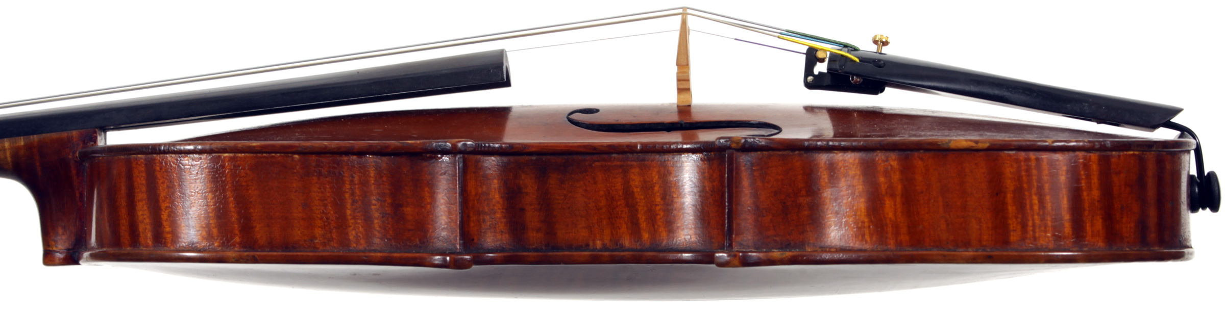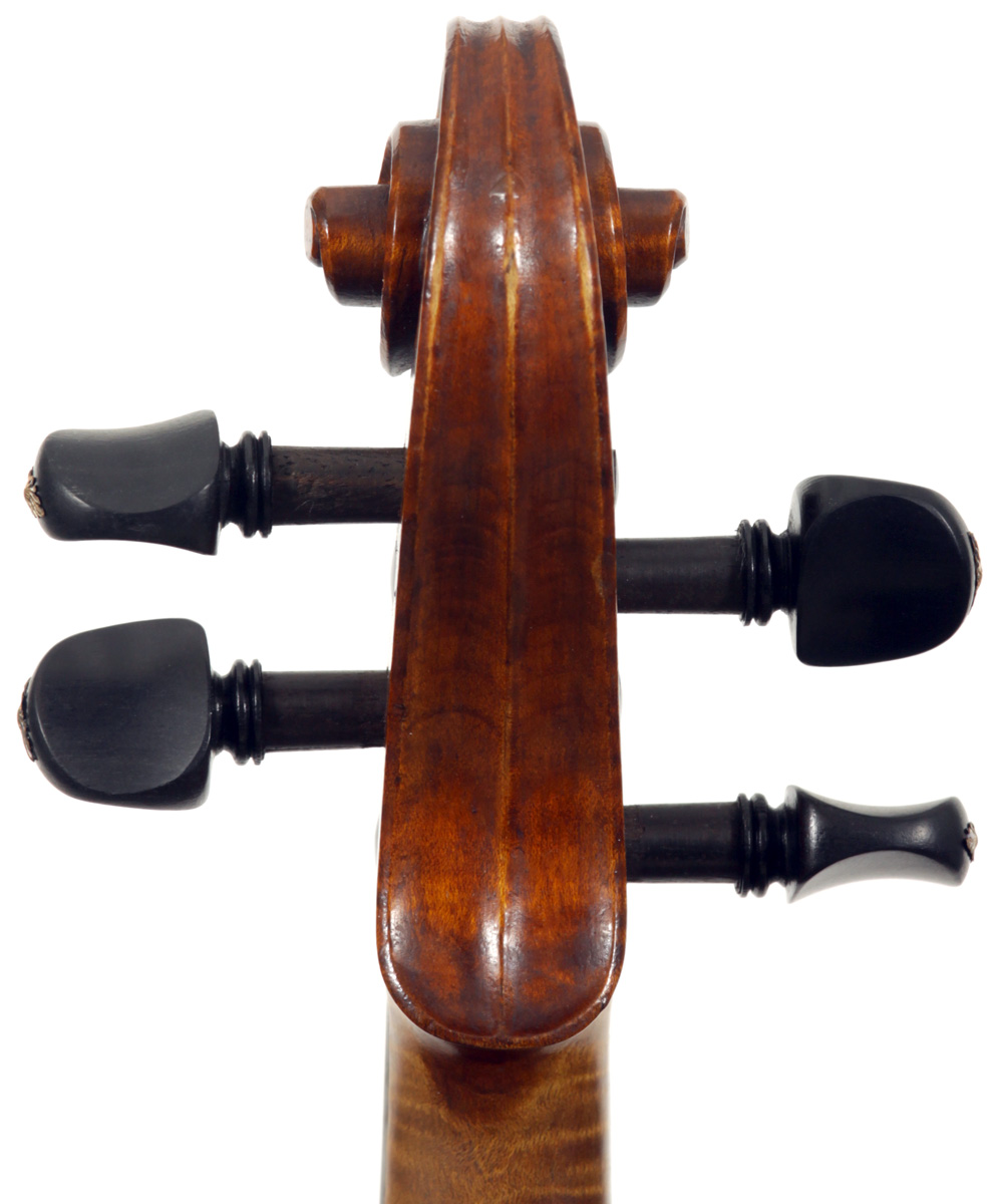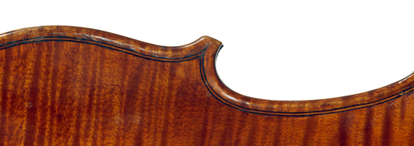 This violin has a truly magnificent scroll - bold, superbly balanced and champhered and with beautiful flame. The pegs are new. The two-piece maple back is of nicely flamed maple with a straight, medium curl, repeated in the ribs, neck and scroll. The top is of narrow to medium grained tone spruce. Varnish is brown.