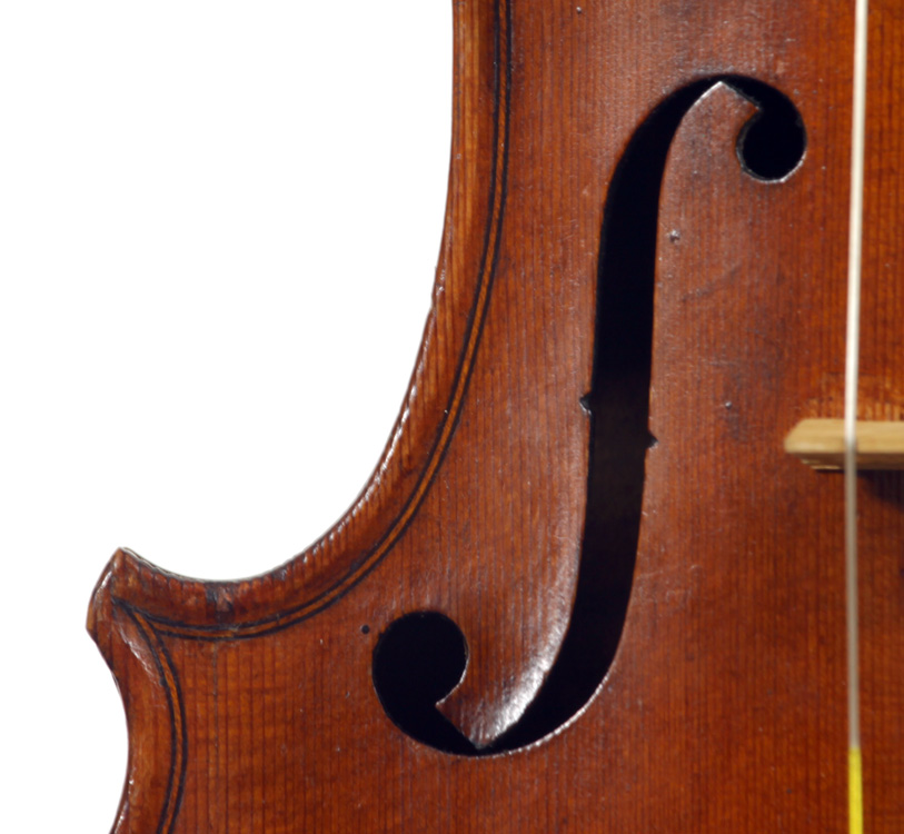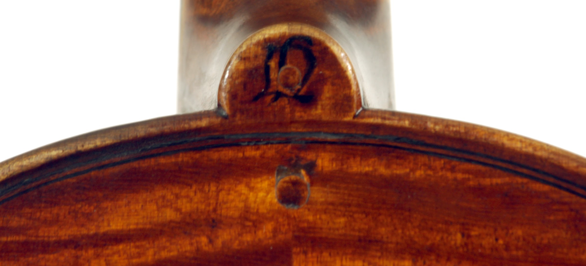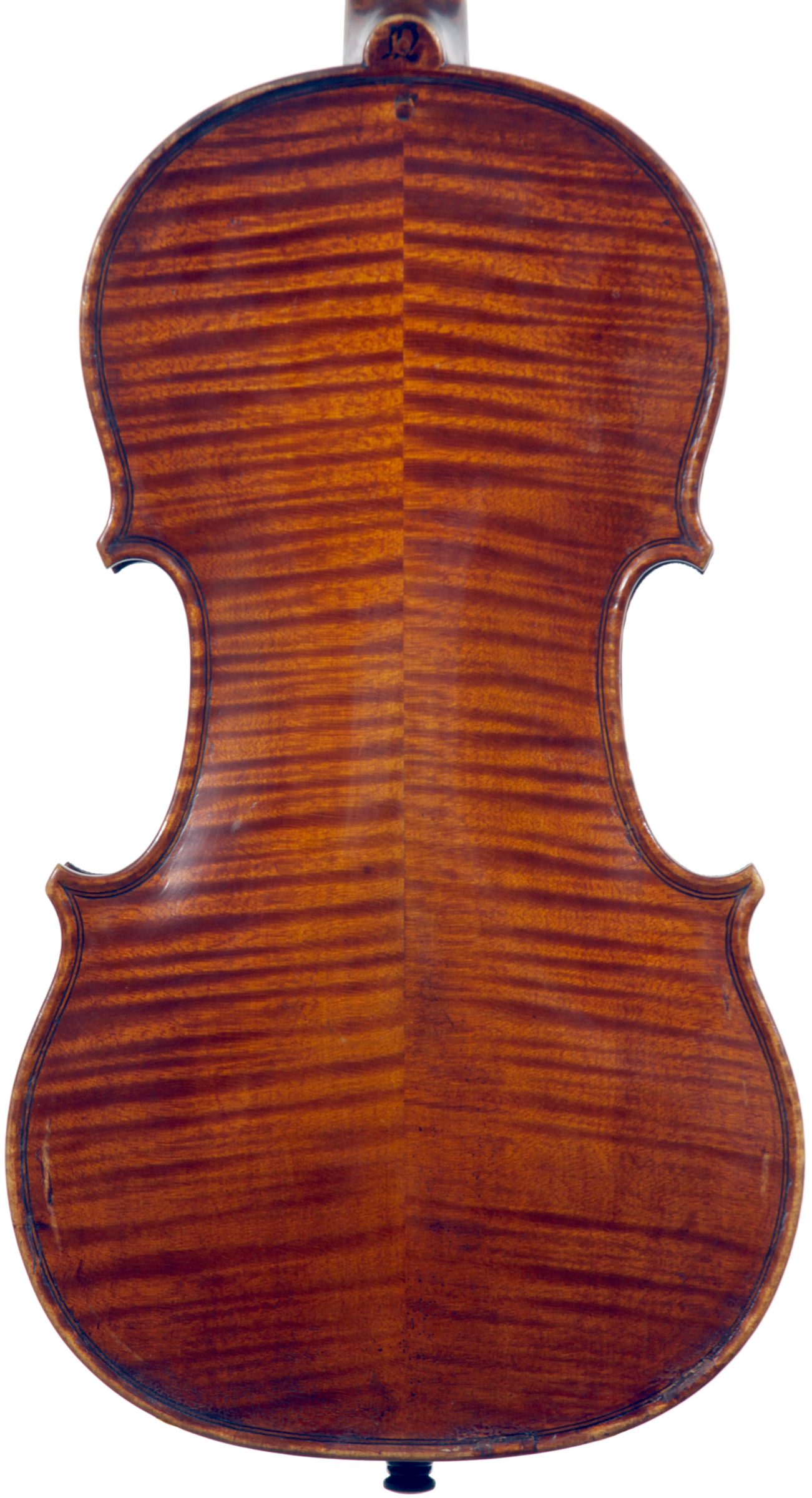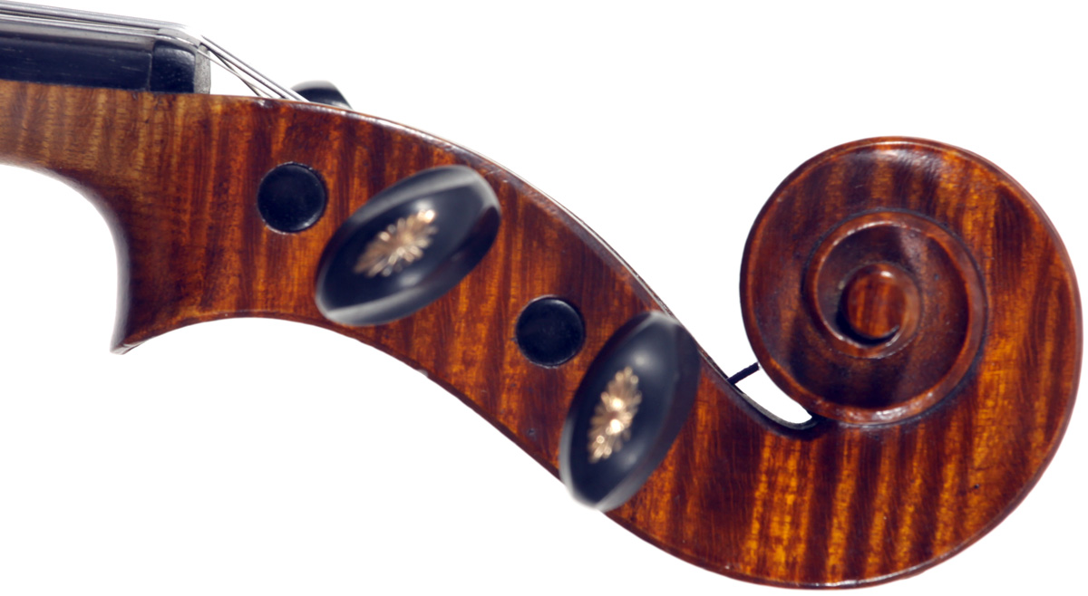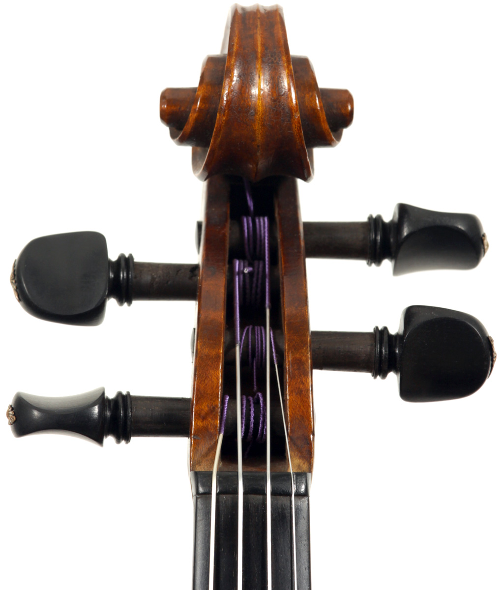 This violin has a truly magnificent scroll - bold, superbly balanced and champhered and with beautiful flame. The pegs are new. The two-piece maple back is of nicely flamed maple with a straight, medium curl, repeated in the ribs, neck and scroll. The top is of narrow to medium grained tone spruce. Varnish is brown.