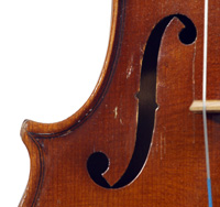 Two minor cracks have been professionally repaired and pose no threat to the structural integrity of the violin. The lower treble corner on the front has been rebuilt.