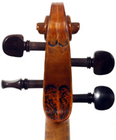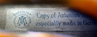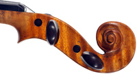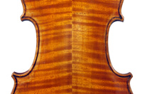 The materials selected for this violin are attractive and of good quality. The two-piece back, ribs, neck and scroll are of medium to broadly flamed maple with a distinct lively curl. The top is of medium-grain tonespruce with a straight and even winter growth. The varnish is beautiful golden amber of high transparency, complimenting the wood nicely.