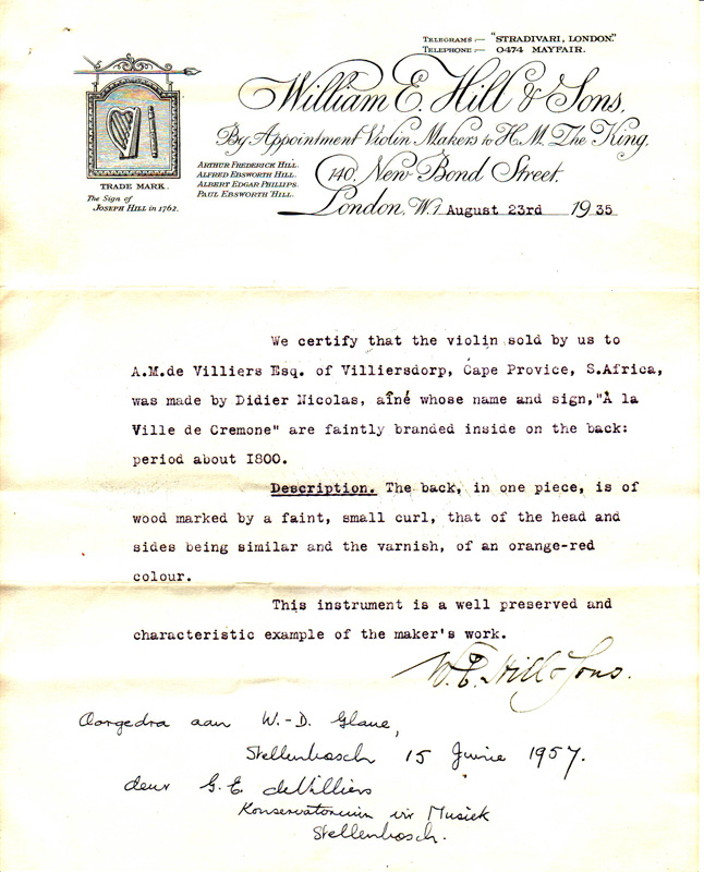This violin by Nicolas Didier, aîné (1757- 1833) was sold by W. E. Hill & Sons in 1935 and a certificate of authenticity was established at that time which is still available with the instrument. The violin is highly characteristic of the work of this important French maker and bears the maker's firebrand in the back at the usual place, faintly discernable.