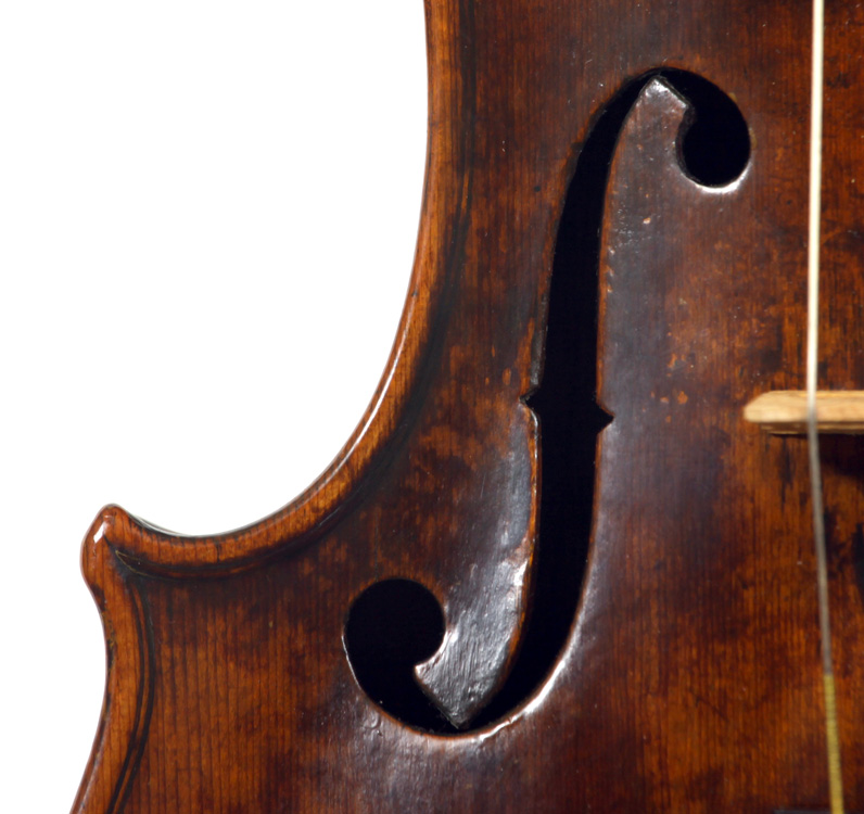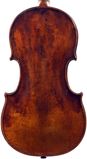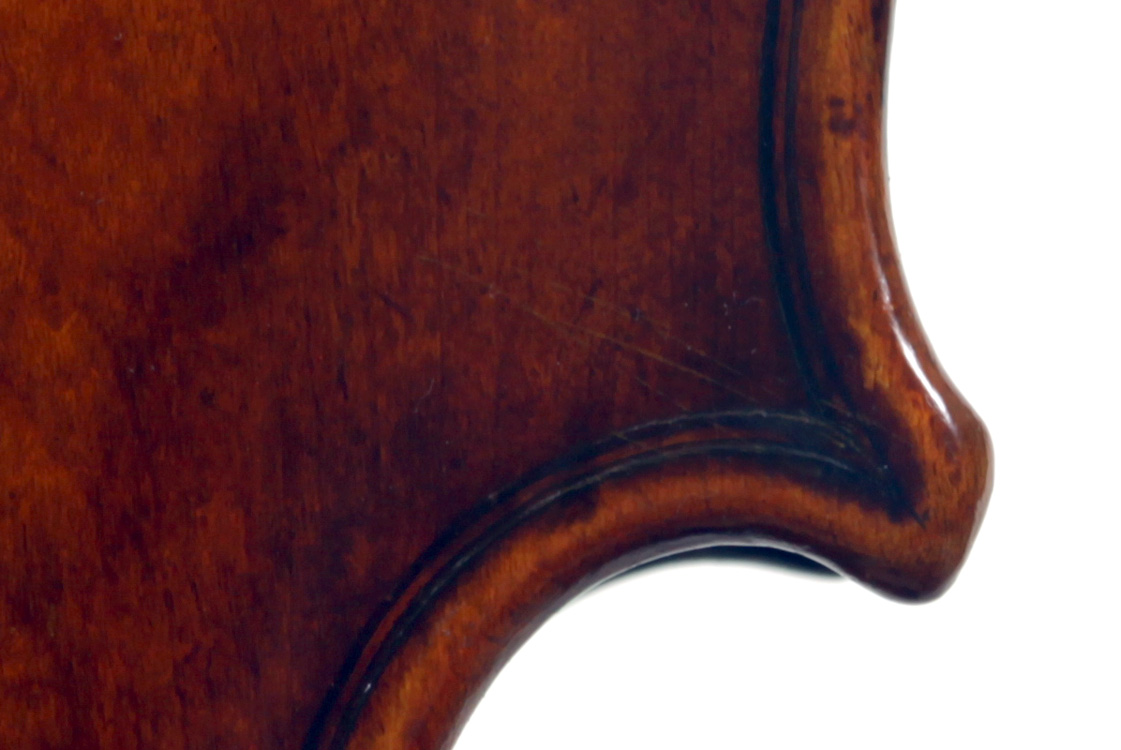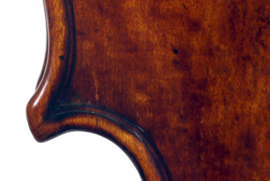 The one-piece back of somewhat plain unfigured wood is cut on the slab. The ribs appear to be of the same wood. The top is of finely grained tonespruce of excellent quality. Although this violin has seen some repairs to the scroll, the neck button and two cracks on the top - all superbly done - it can be said to be structurally in excellent condition.