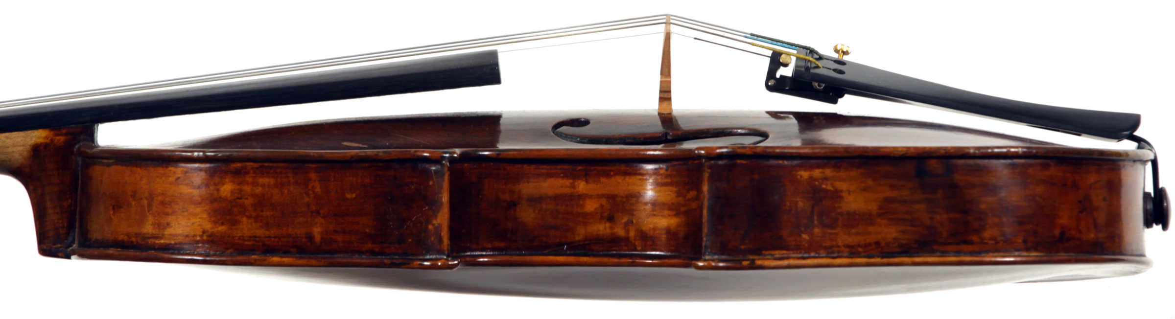 Considering its age, this violin is in a remarkably good condition for an instrument some 270 years old. Repairs to the scroll and to two cracks in the top were superbly done, evidently the work of a master craftsman. A crack in the back's upper treble quadrant and to the button area could have been better done and it appears that this crack is not cleated but merely glued. This instrument does not have a soundpost crack in the front or back and can be considered as being structurally very secure. This violin has been over-varnished, but it appears to have retained its original varnish underneath.