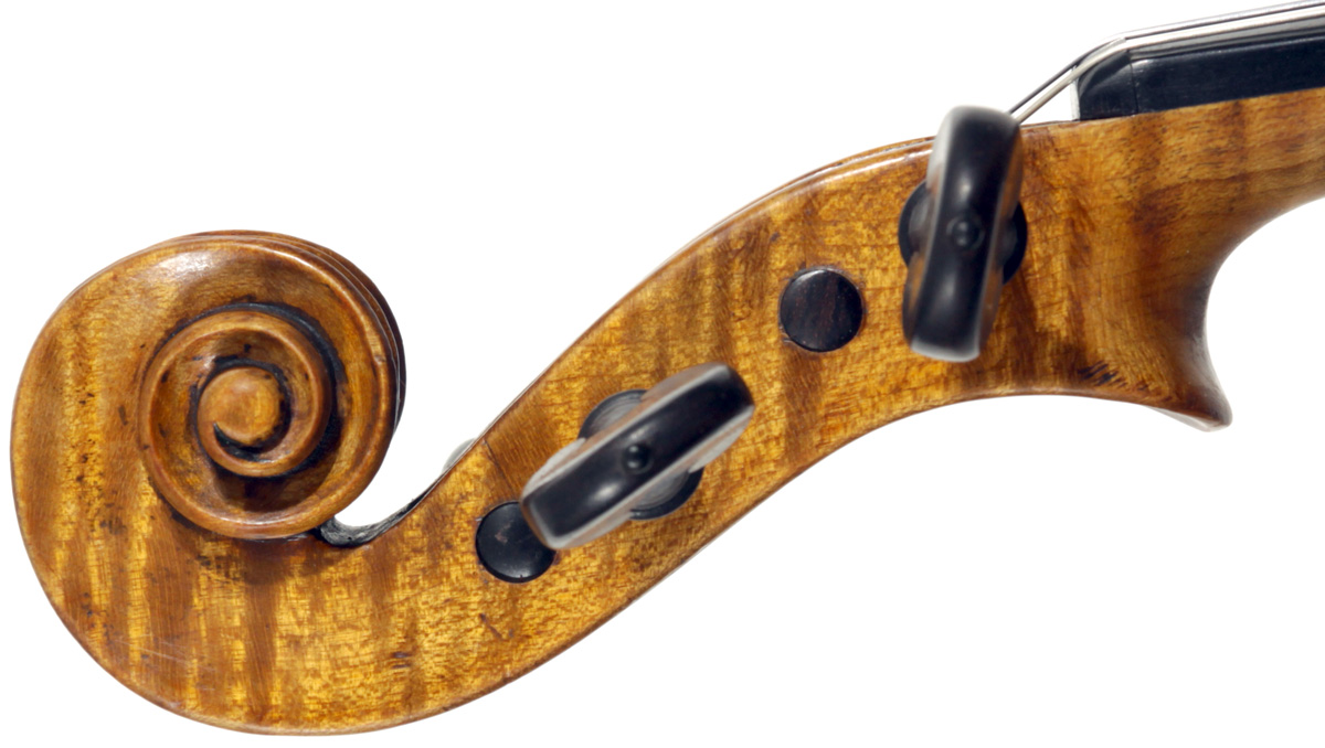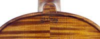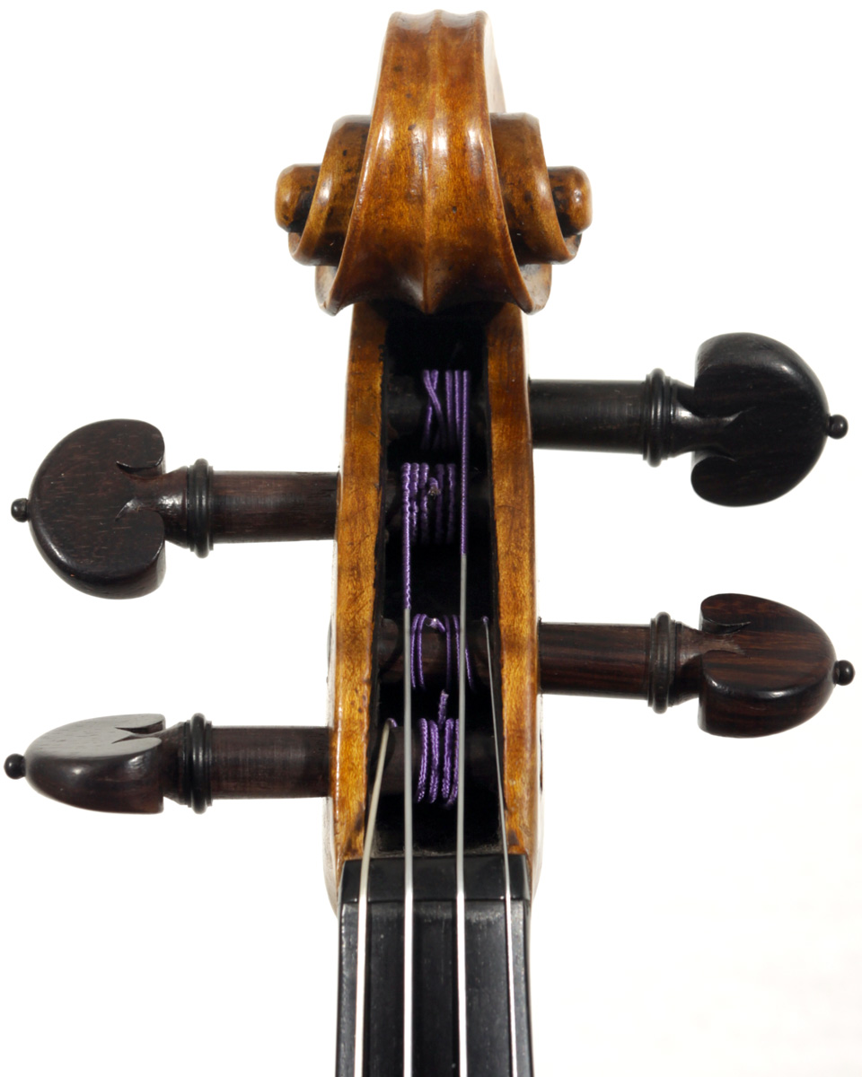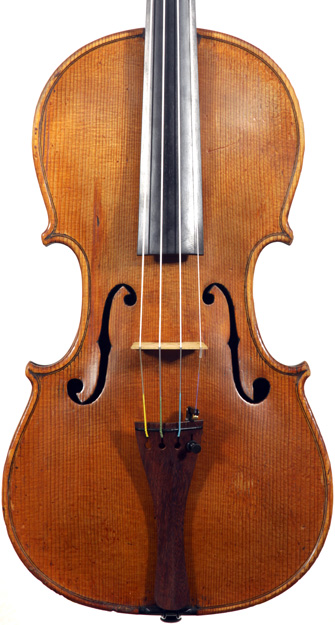 The two-piece back, ribs, neck and scroll are of very attractive maple with a distinct figure and even, medium curl. The table is of excellent tone spruce with narrow to medium grain. The varnish is light brown. Although the Fs and scroll are somewhat perfunctory, workmanship throughout is of very good quality.