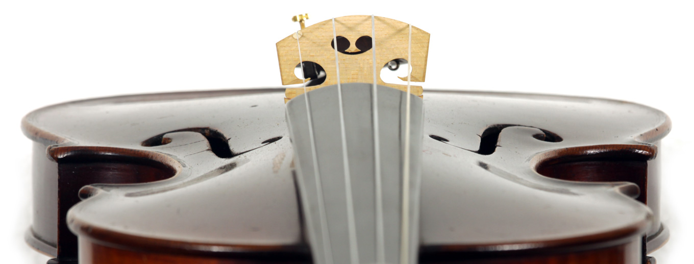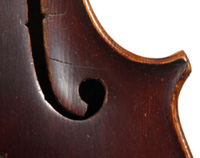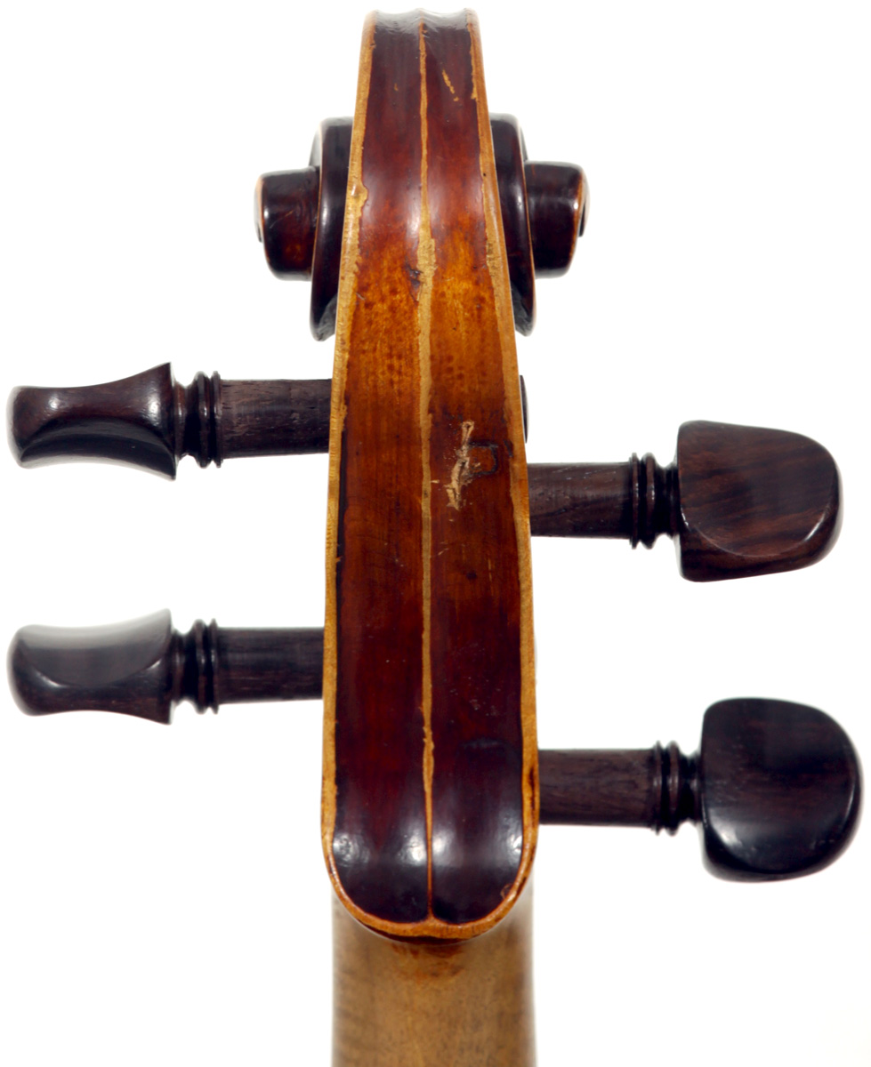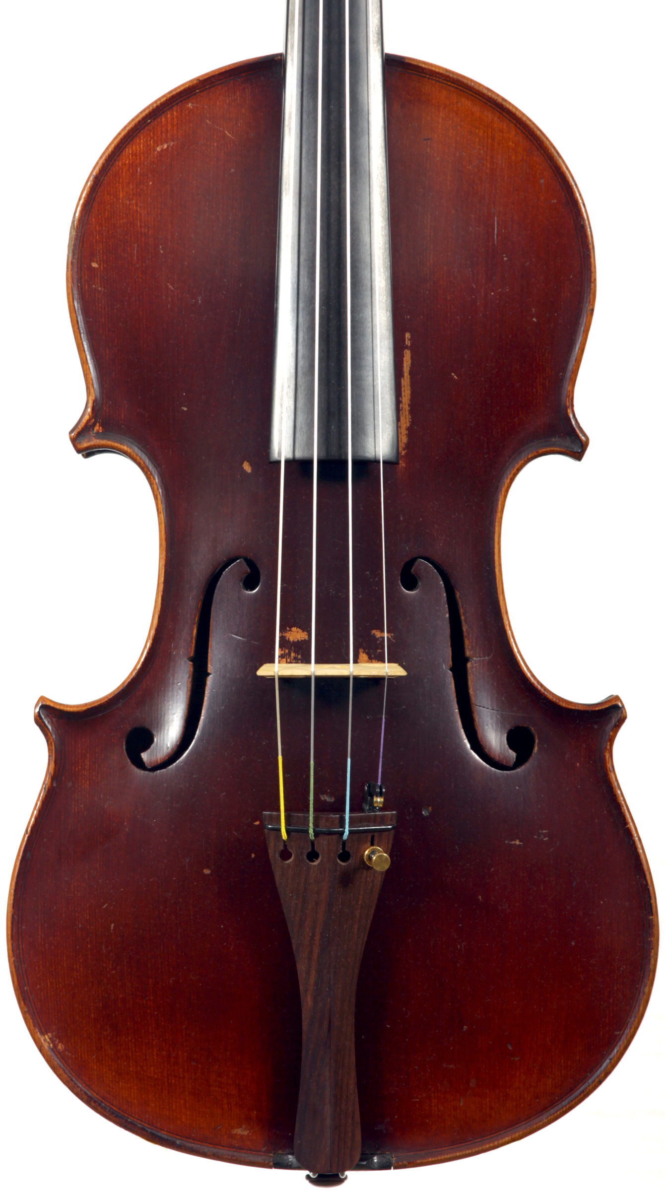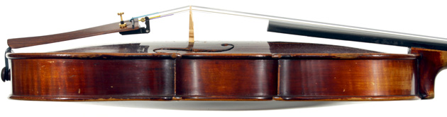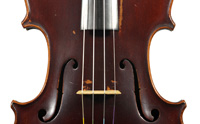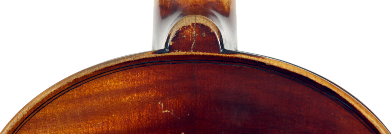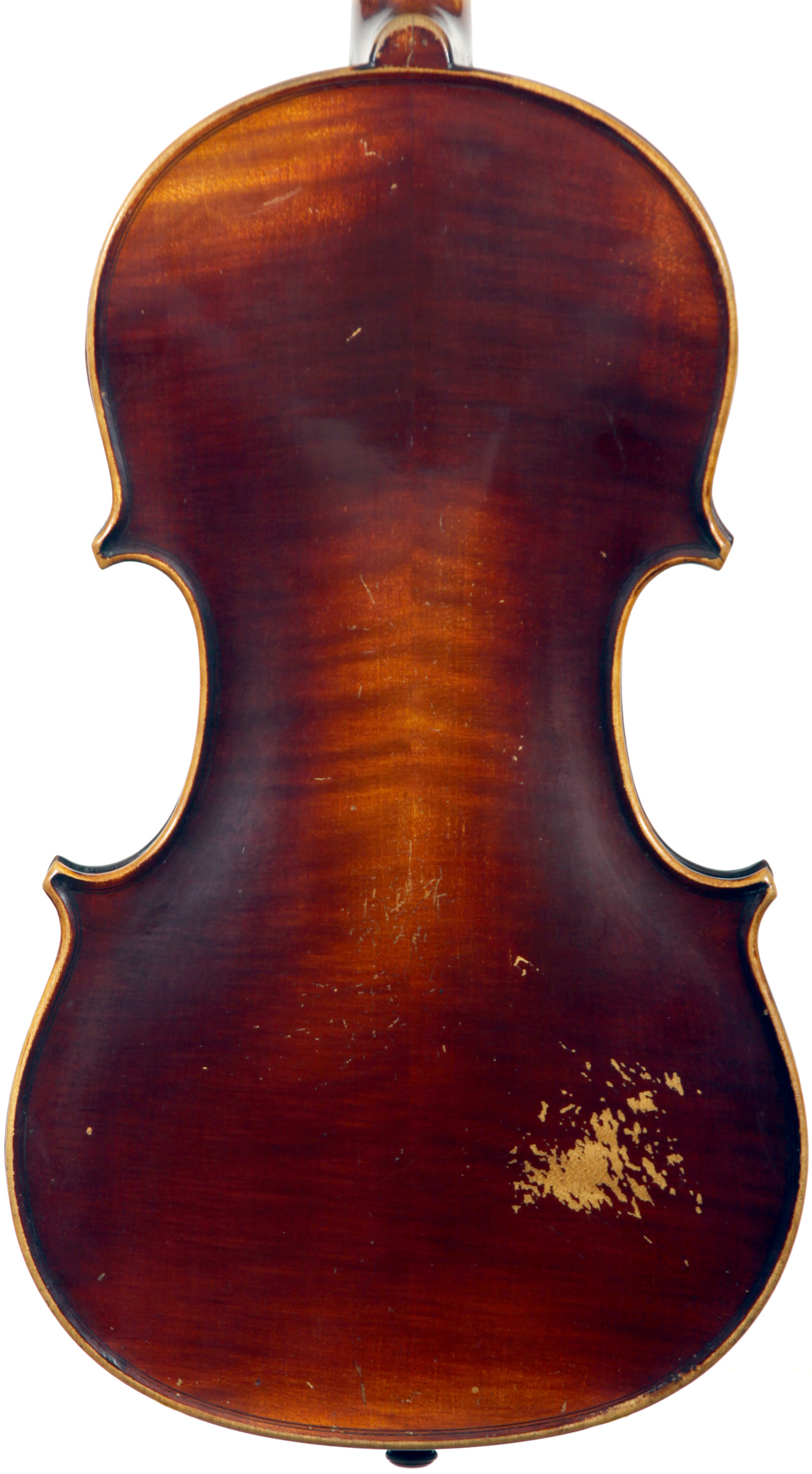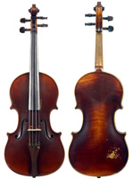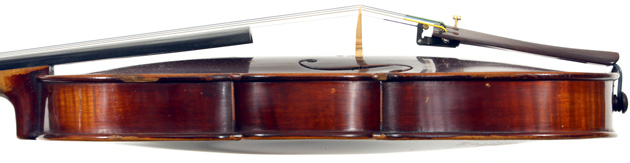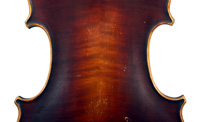 The two-piece back, ribs, neck and scroll are of mildly-flamed maple. The top is of narrow-grained tone spruce. The Fs are elegant. The oil-based varnish is a dark red-brown and somewhat opaque. This violin is responsive and well-toned, speaking easily through the full register. It would be eminently suitable for an advanced upgrade or entry-level professional performance.