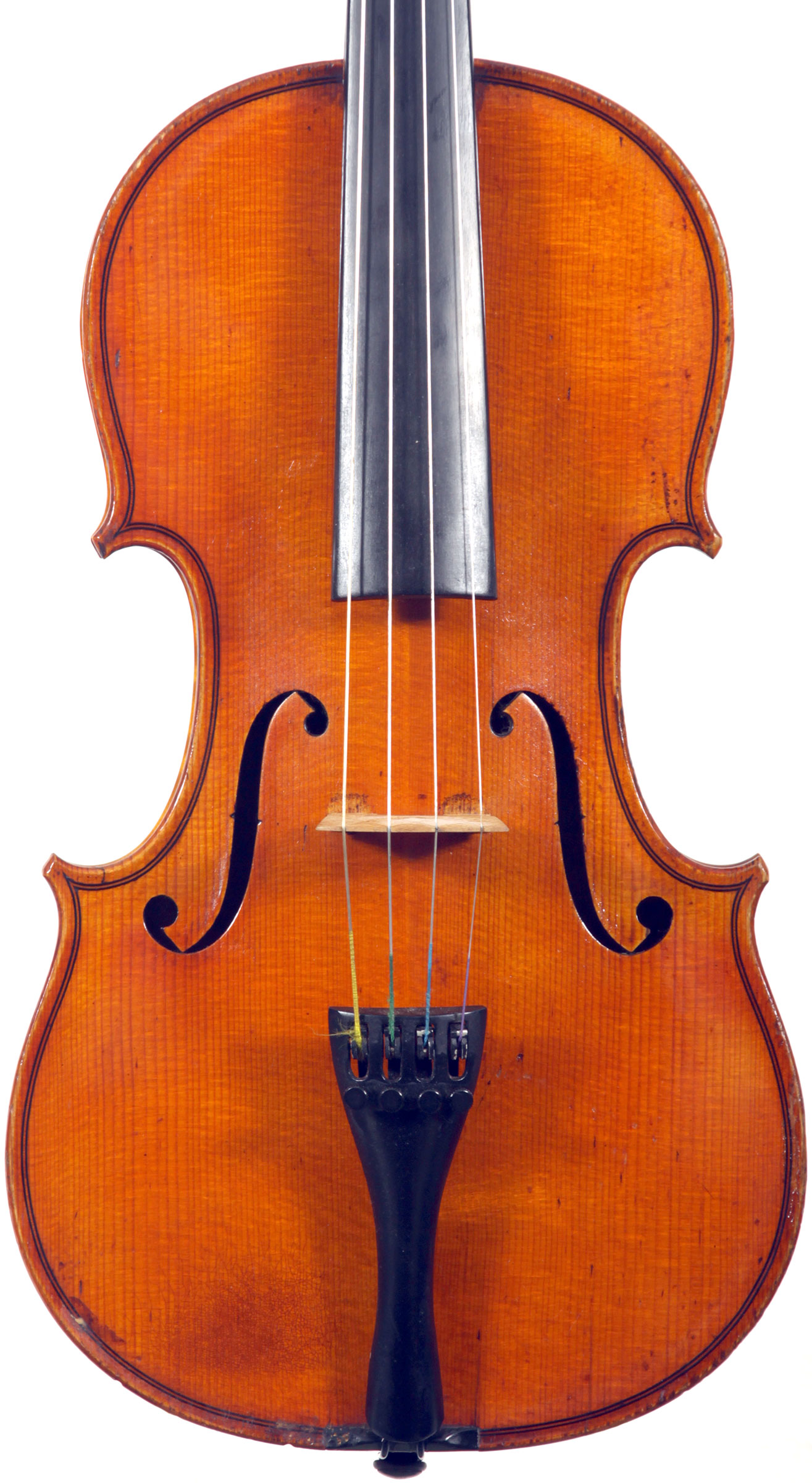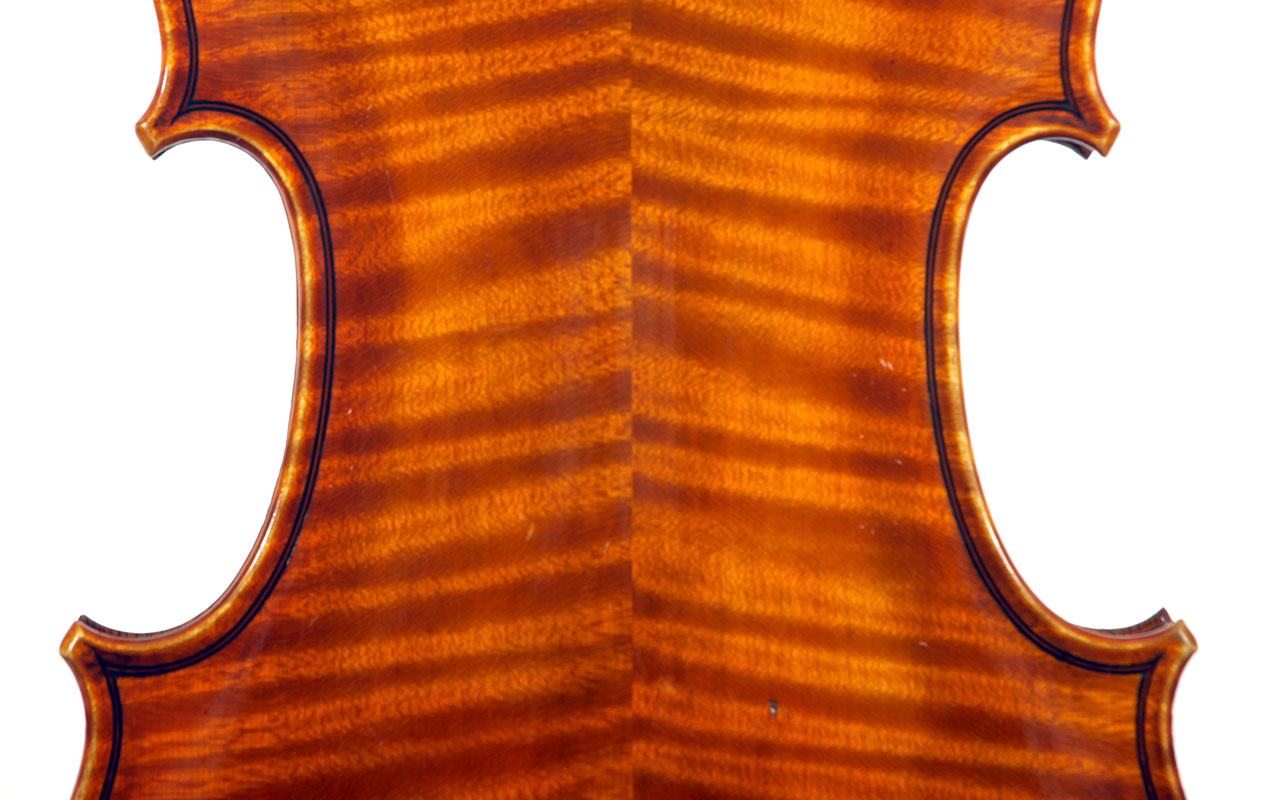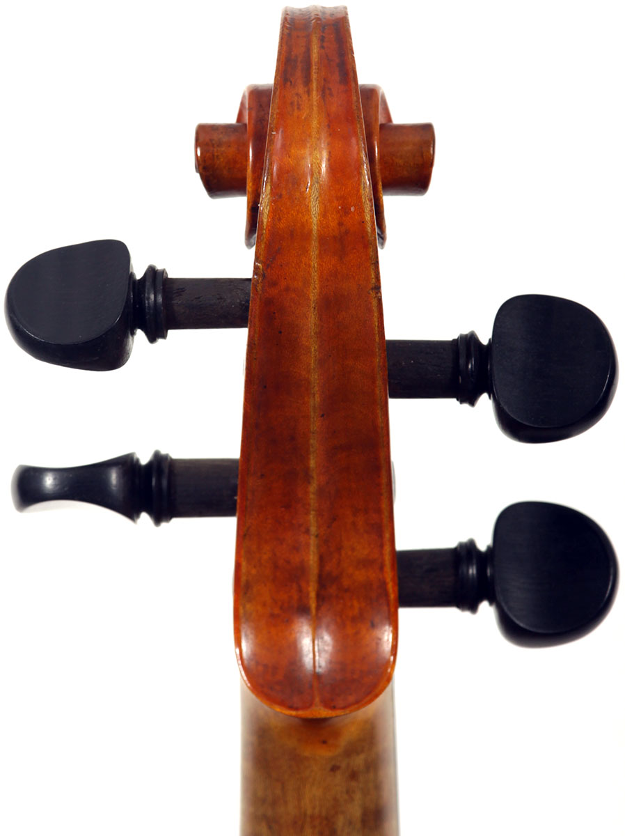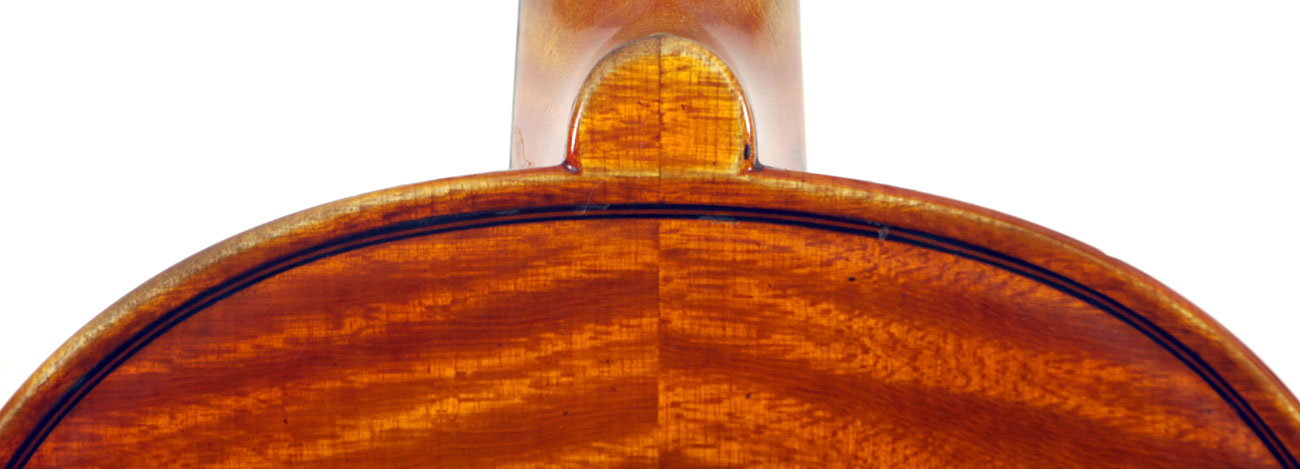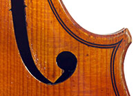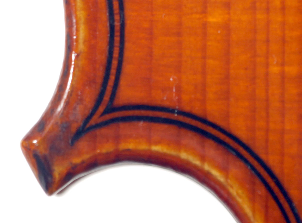 This violin clearly shows workmanship and modelling associated with French lutherie and can be assumed to have been made in Mirecourt for Haynes & Co. One is struck by the unusually tidy work with excellent attention to detail. The Fs are particularly elegant and crisp as is the scroll with its beautifully finished fluting. The purfling and mitres are superb throughout. The choice of materials is excellent - the tonespruce top is narrow grained on the centre line, and widens to the flanks. The two-piece back, ribs, neck and scroll are of attractive well-figured maple with a medium curl and distinct flame. The golden reddish brown oil-based varnish compliments the material well, adding to the visual appeal of this instrument.