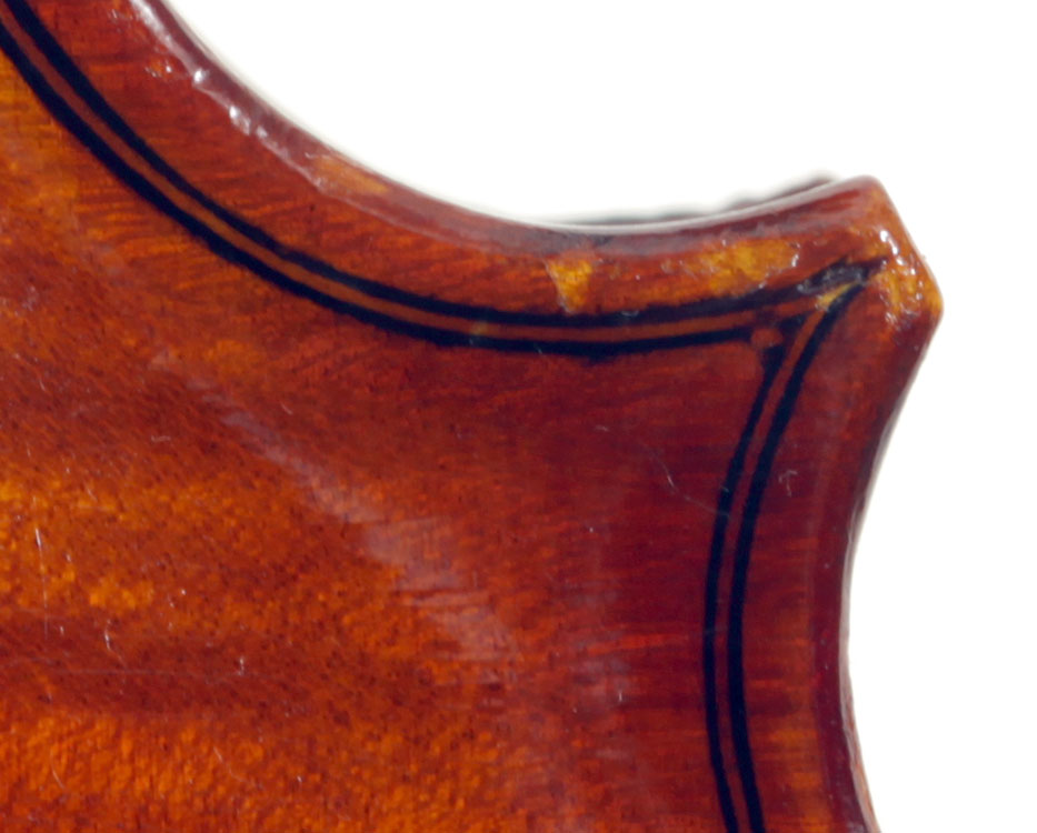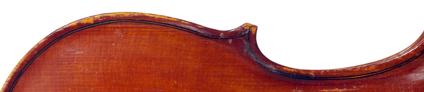 This instrument is made of a fine selection of materials - the two-piece back and ribs are of well-flamed maple with a narrow to medium curl - repeated in the neck and scroll. The top is of good tone spruce with an even, very straight medium grain. The scroll and purfling are steady. The oil-based varnish is an attractive reddish brown which compliments the materials well.