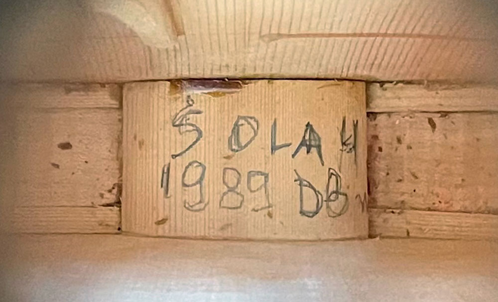 Whereas Olah usually signs his instruments in the back, directly on the wood, this viola has his name only on the neck block, on the inside. (See photo).