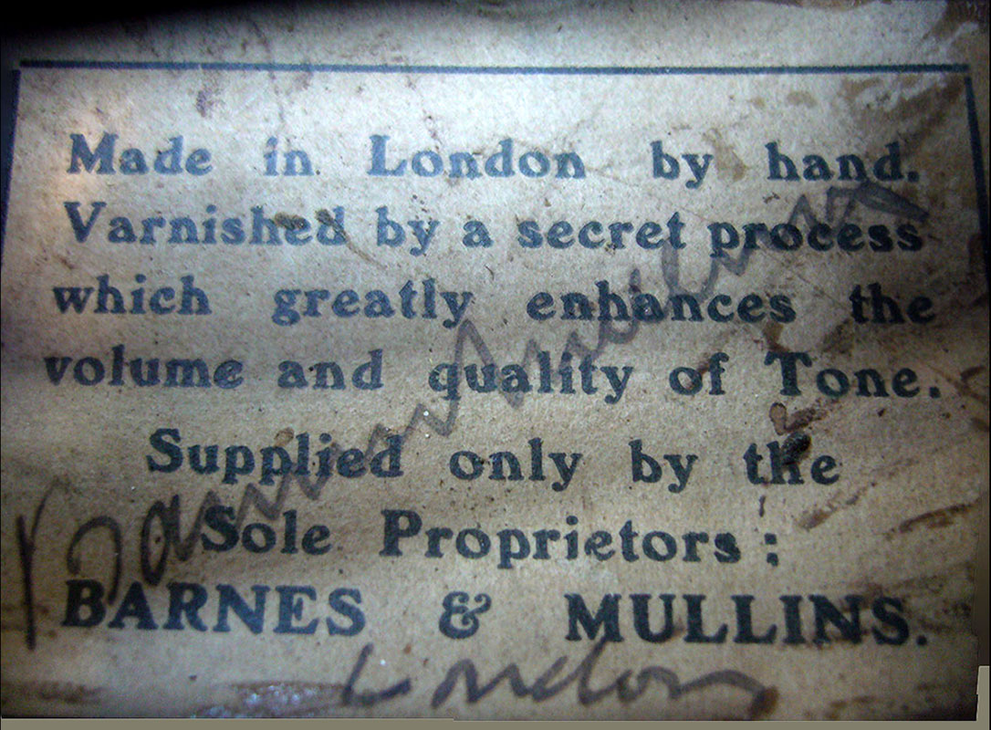 The firm of Barnes & Mullins in London were makers and exporters of violins and related instruments during the period 1905 to 1930. Several English violinmakers worked in their studio and they had a solid reputation for good work, at times importing instruments from France and Germany. They also acted nationally and internationally for some important English makers.