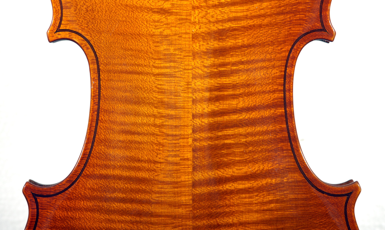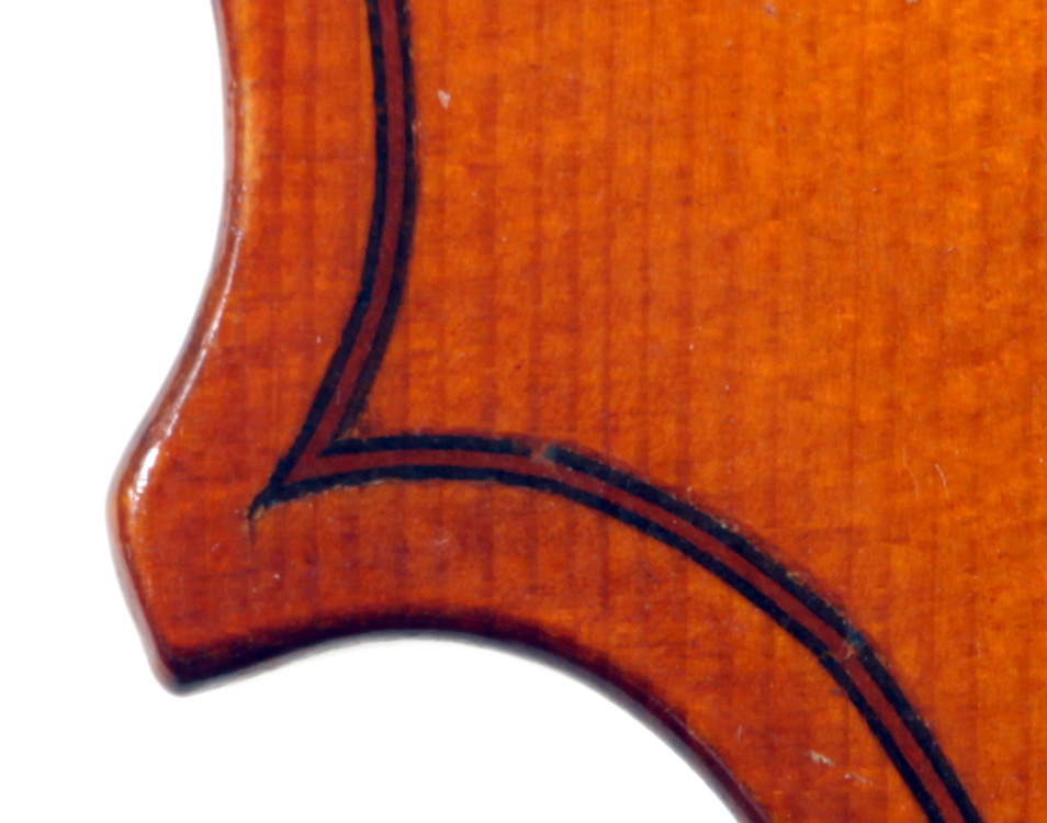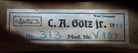 It is labelled as by C. A. Götz, made in 1989. General workmanship and varnish would imply trade (commercial) origins, but is nonetheless of high standard with excellent attention to detail. It's an attractive instrument. Purfling and cornerwork are superb and the Fs balanced and elegant. The choice of material is good - the two-piece back, ribs, neck and scroll are of mildly flamed maple with an even medium curl, evidently made from the same piece of wood. The top is of excellent tone spruce of very even and narrow winter growth.