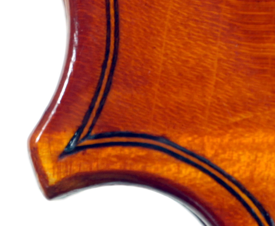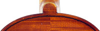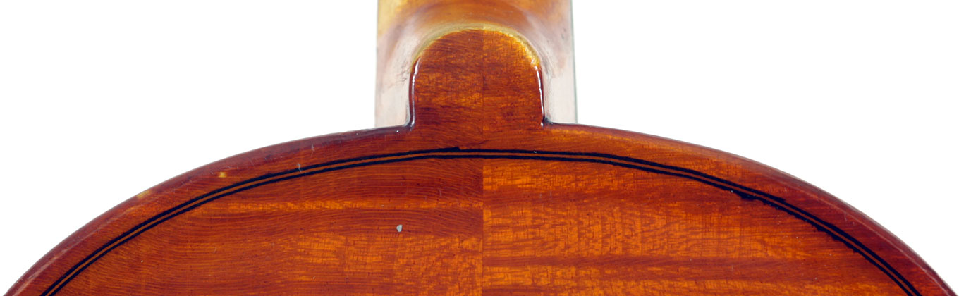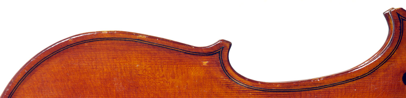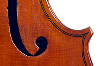 This instrument is made of a fine selection of materials - the two-piece back and ribs are of well-flamed maple with a narrow to medium curl - repeated in the neck and scroll. The top is of good tone spruce with a narrow even, very straight medium grain. The scroll and purfling are steady. The oil-based varnish is an attractive golden brown which complements the materials well.