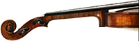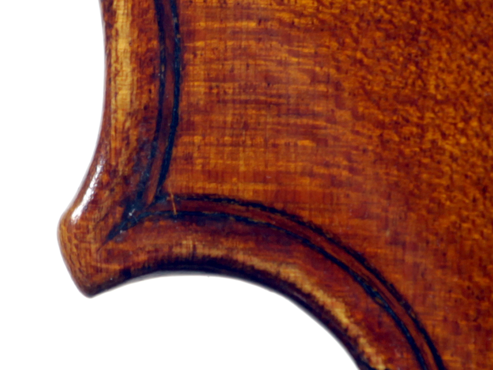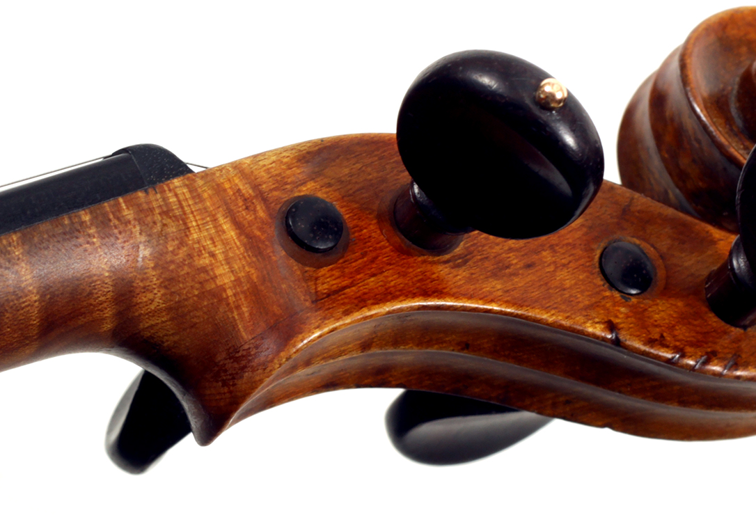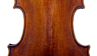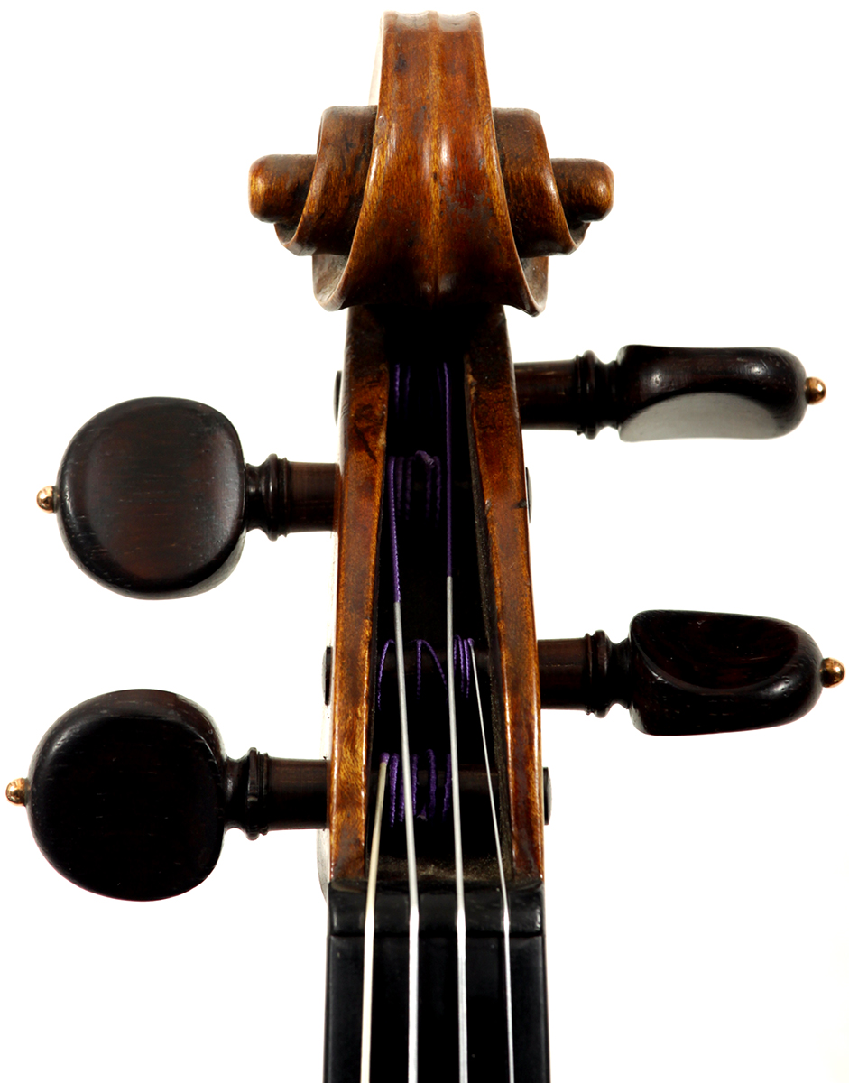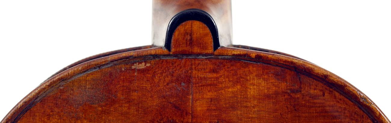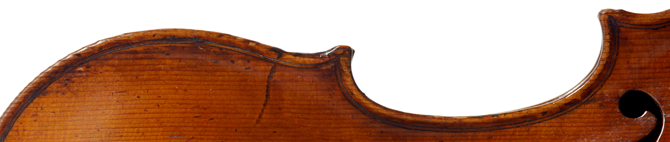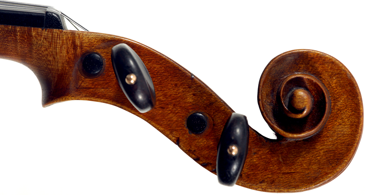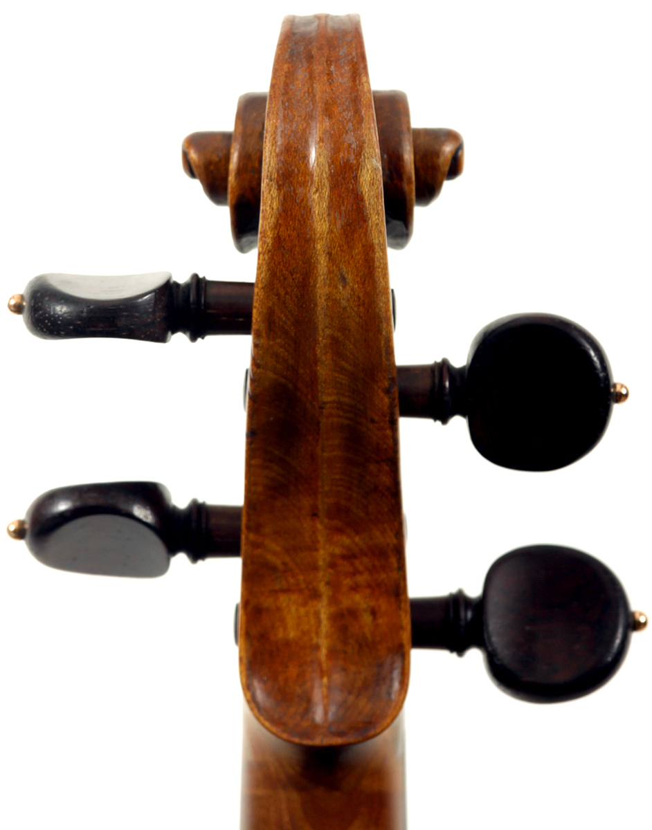 The two-piece back, ribs and scroll are of rather plain wood, whereas the top is of excellent tone spruce of medium-width grain. The scroll is delicate and well-balanced. The neck graft and the peghole bushings are of very fine workmanship. The varnish is a golden brown.